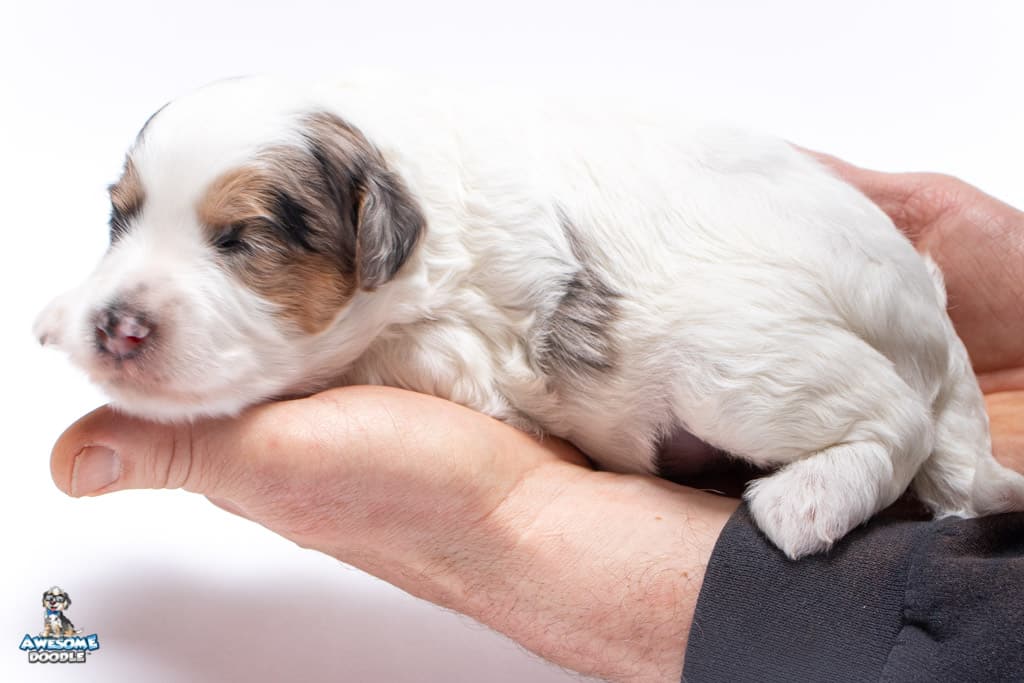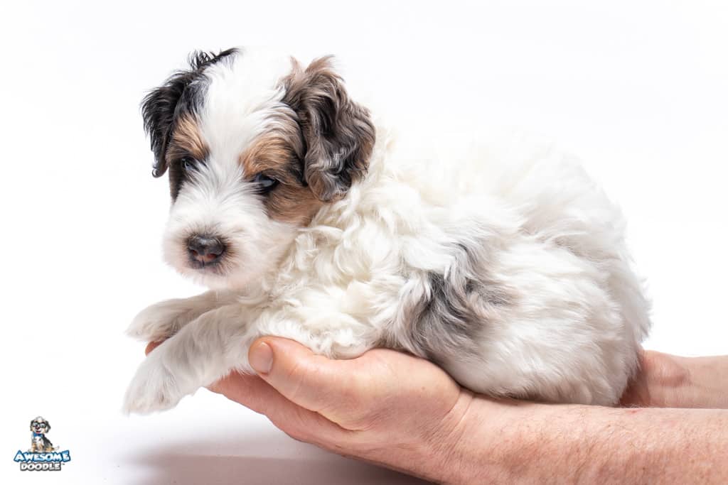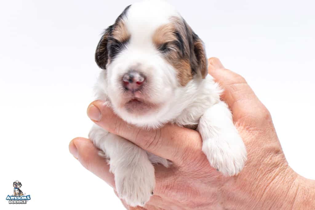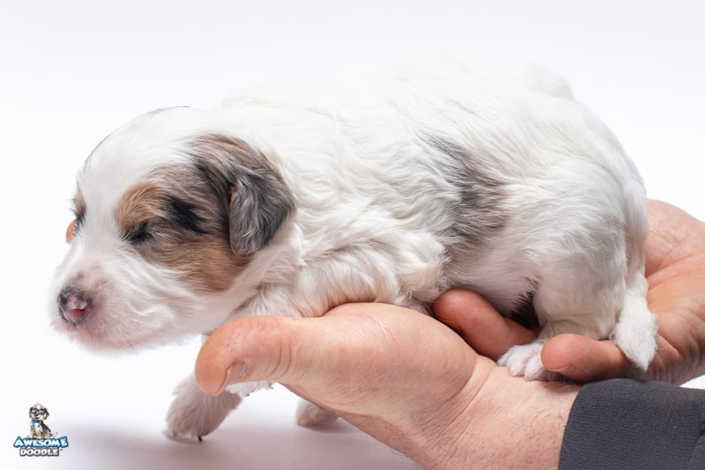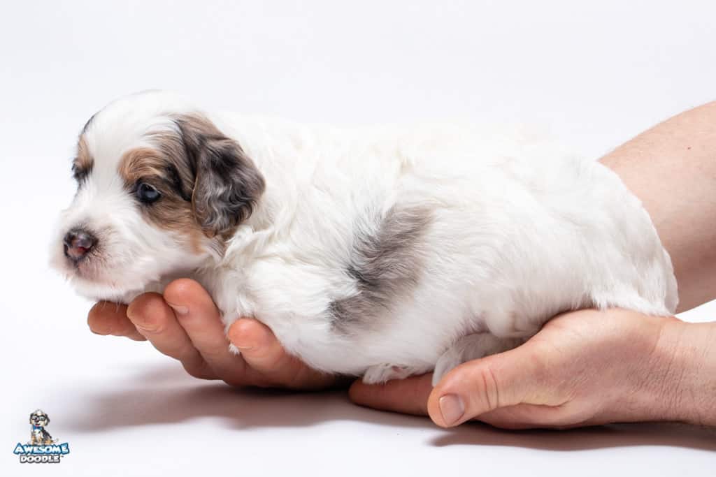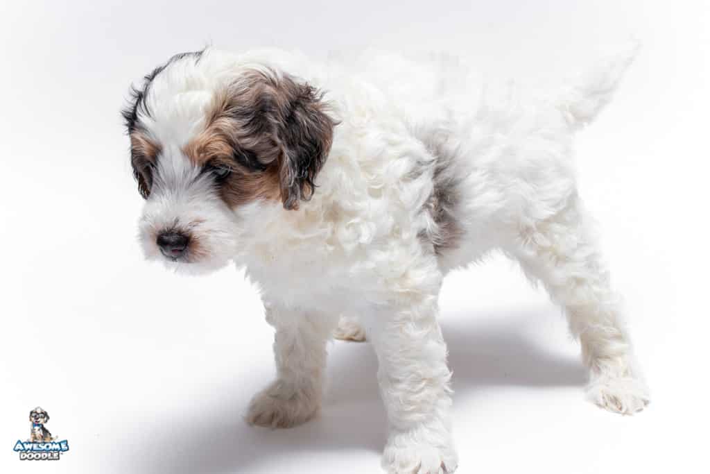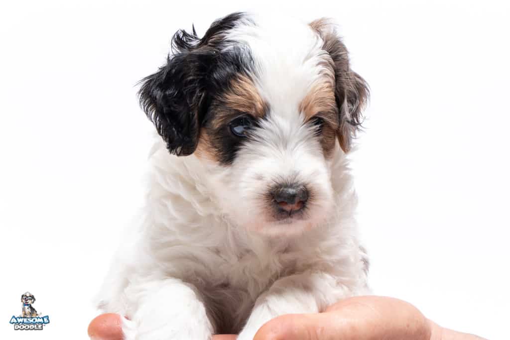 Benny is a male Blue Merle w/ White & Copper F1b AussieDoodle puppy.
