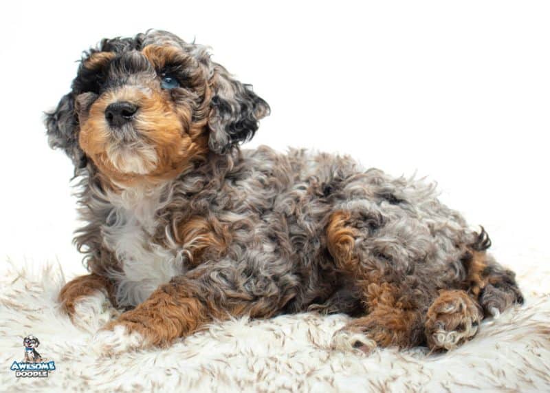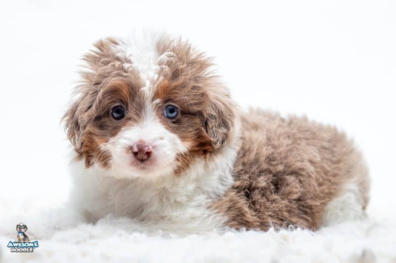 Congrats to: Lindsey and family from Las Vegas, NV on this Blue Merle w/ White & Copper F1 AussieDoodle puppy.