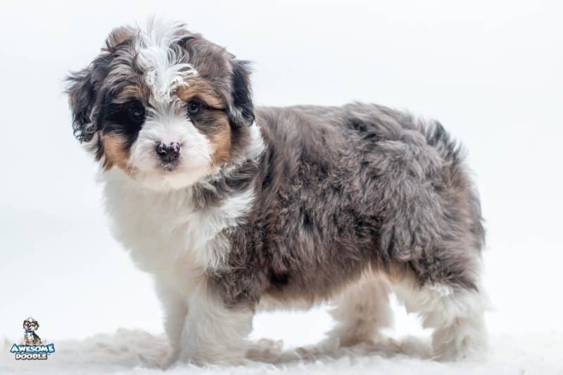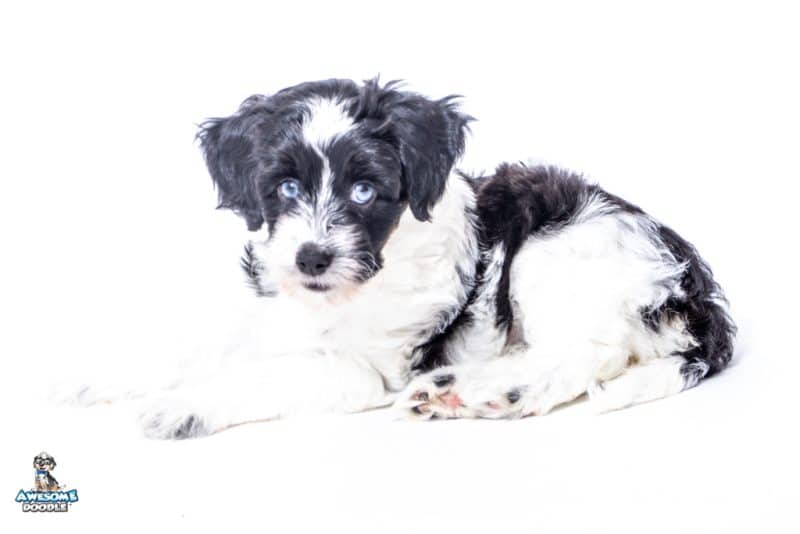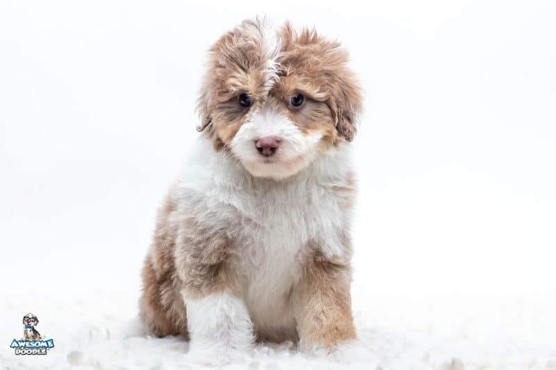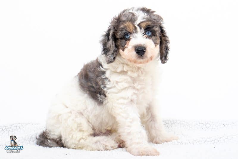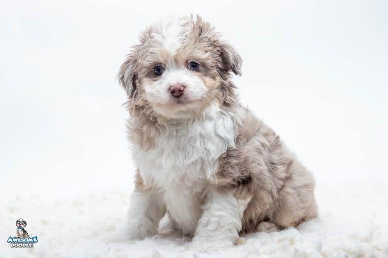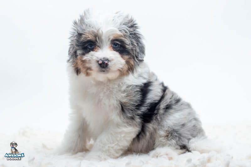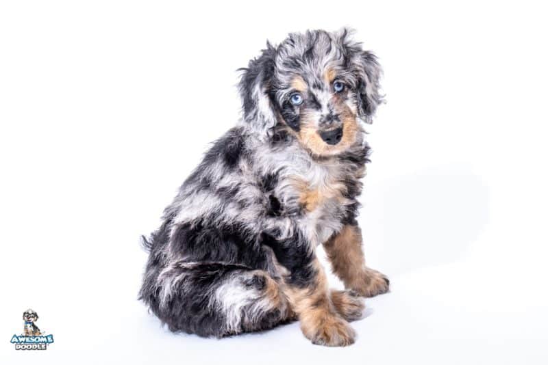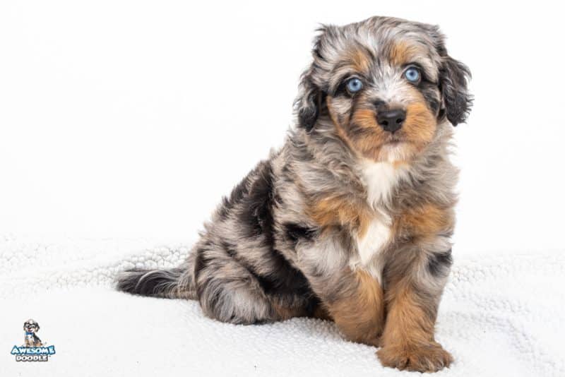 Congrats to: Kathy and family from DeKalb, Illinois on this Blue Merle w/ White & Copper F1 AussieDoodle puppy.