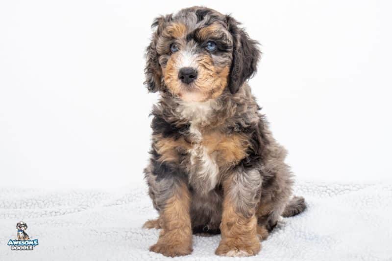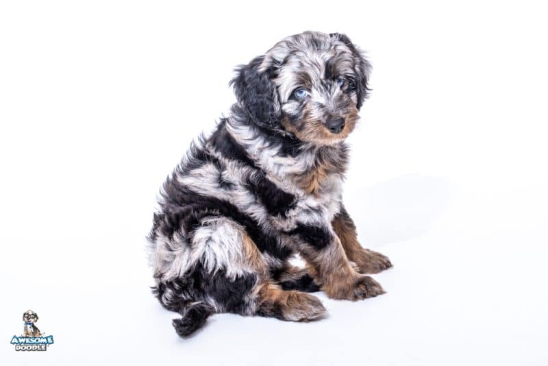 Congrats to: Joshua and family from Sterling, Virginia on this Blue Merle w/ White & Copper F1 AussieDoodle puppy.