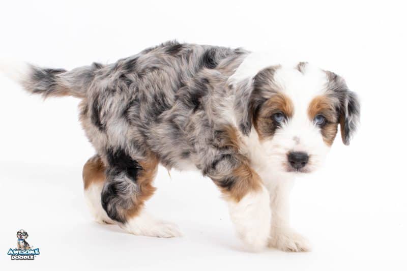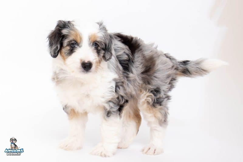 Congrats to: Tracy and family from Kiowa, Co on this Blue Merle w/ White & Copper F1b AussieDoodle puppy.