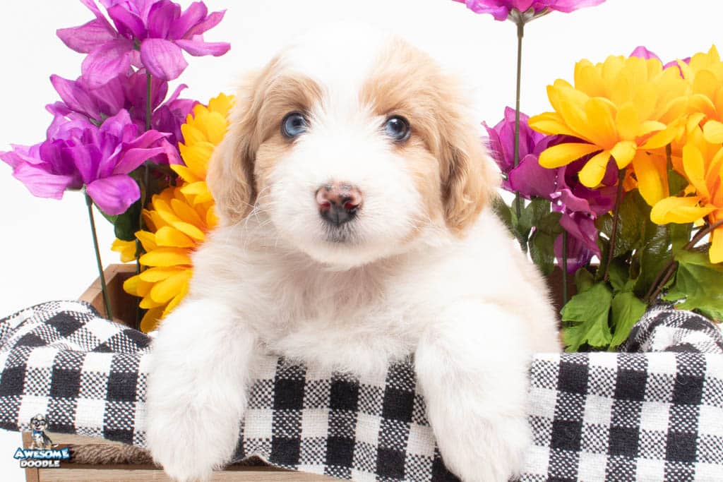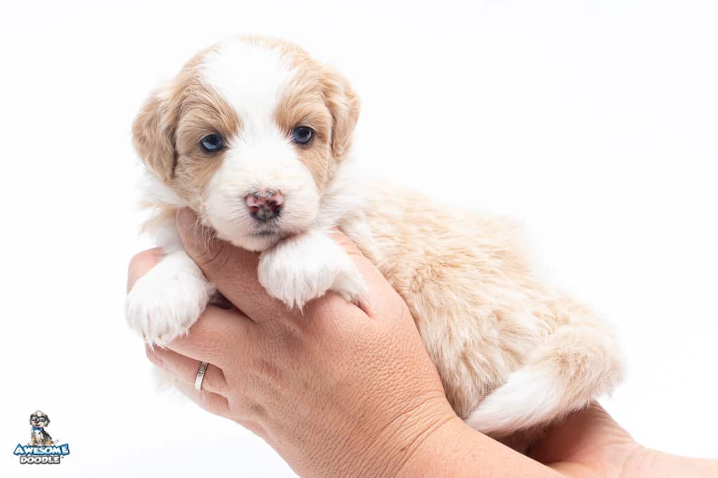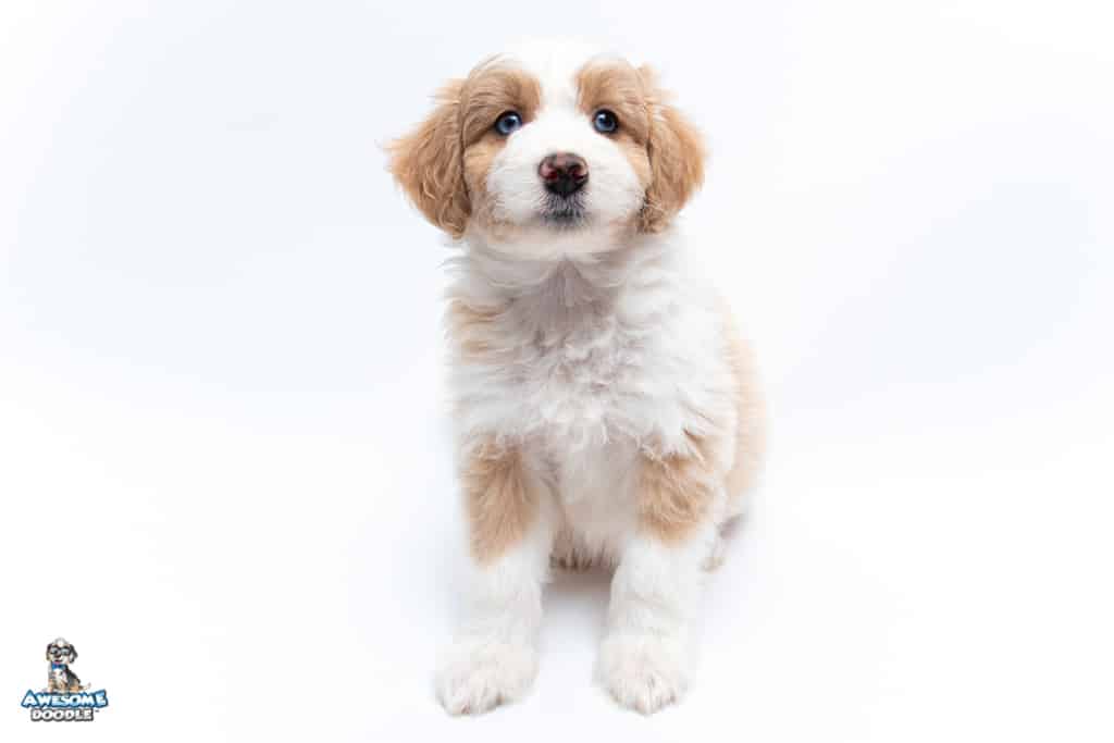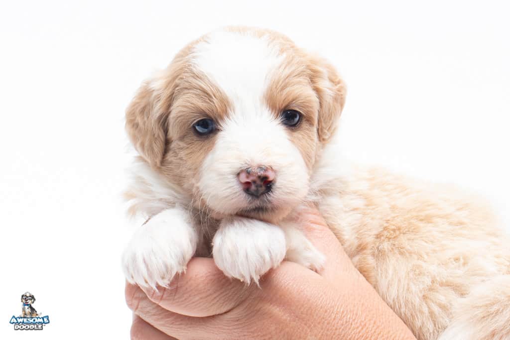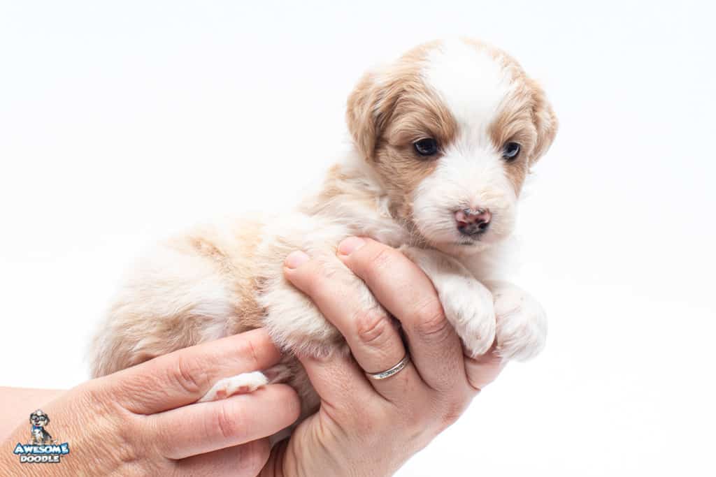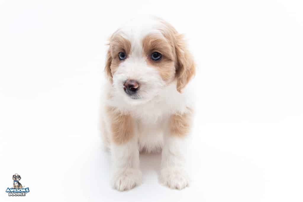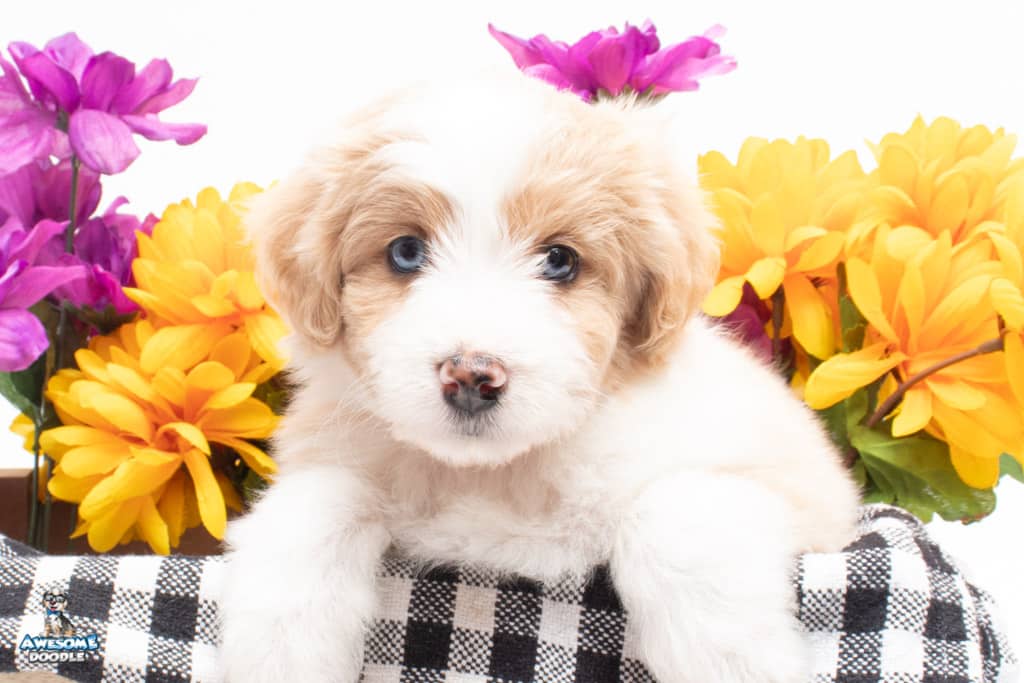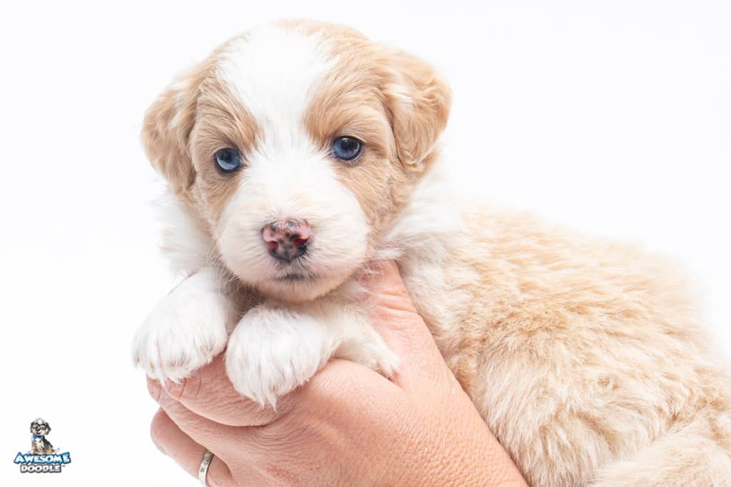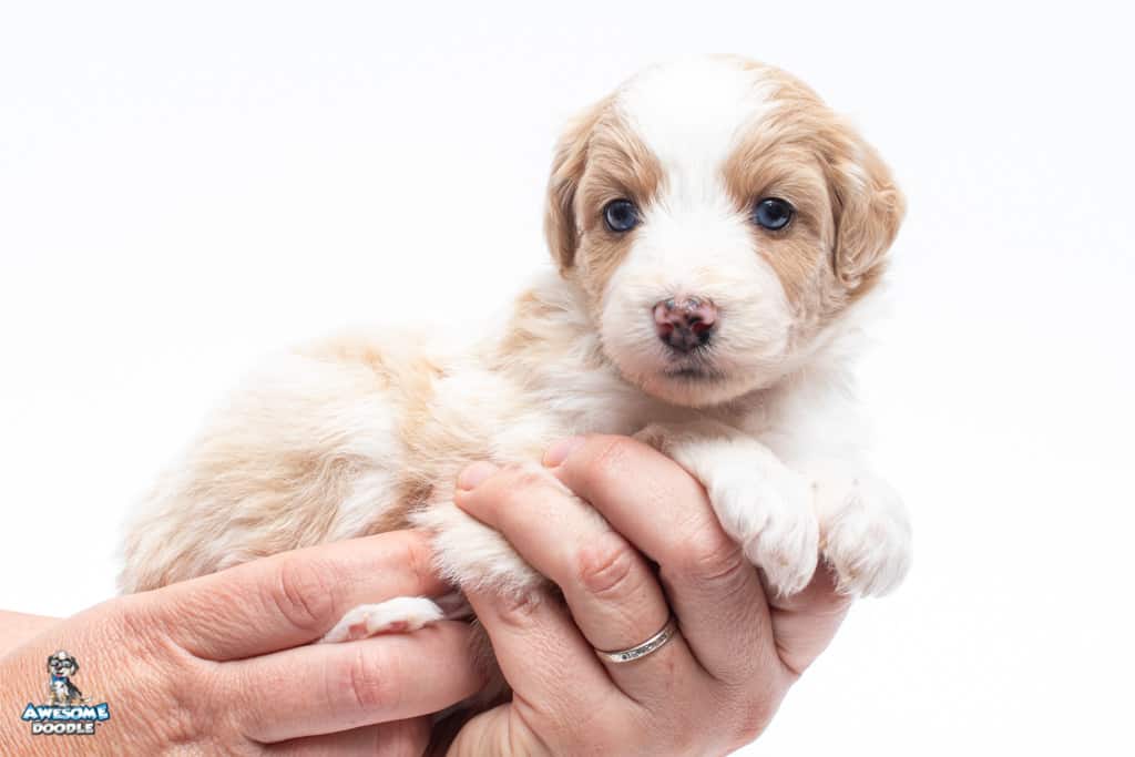 Coco is a female Apricot Bi-Color F1 AussieDoodle puppy.