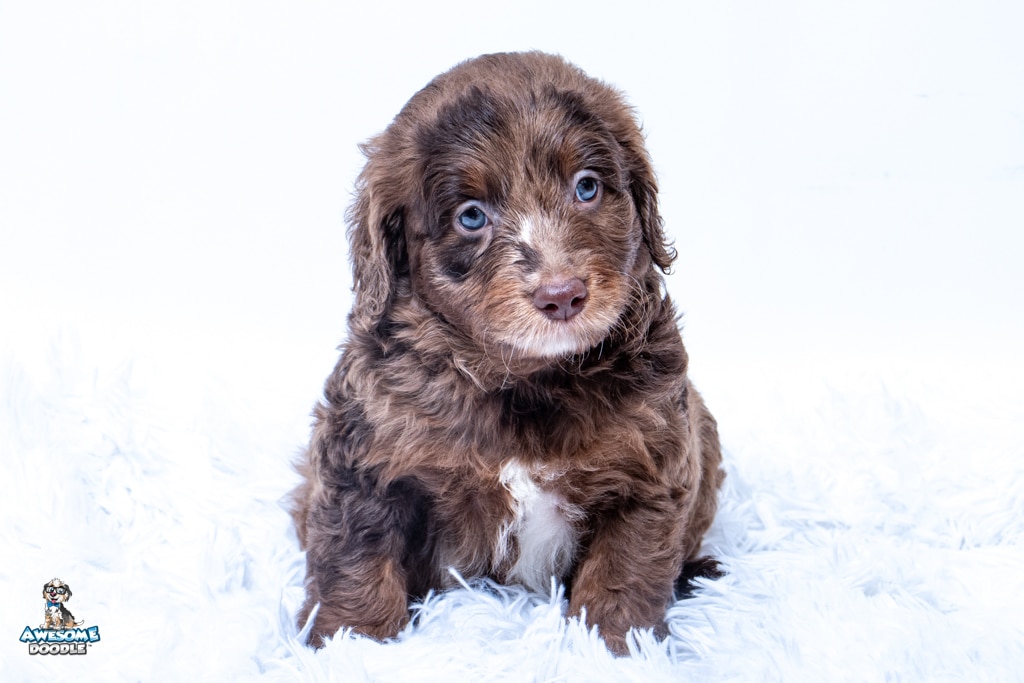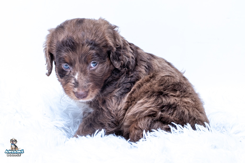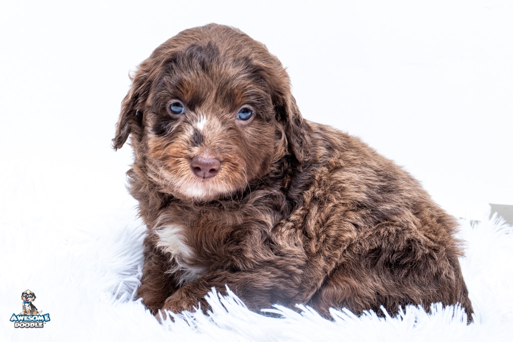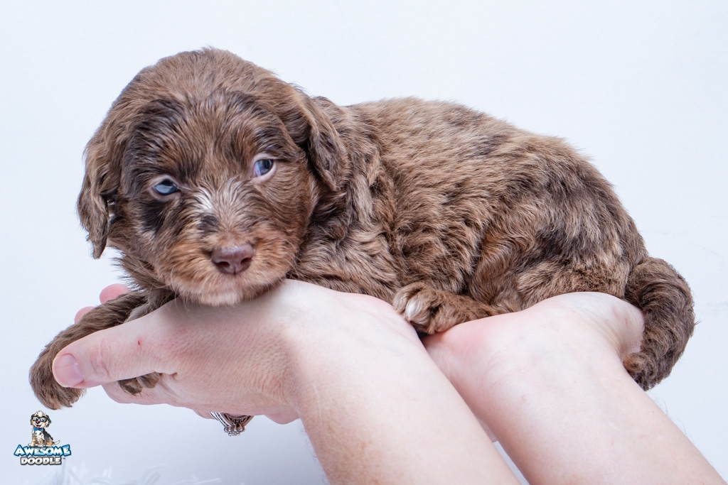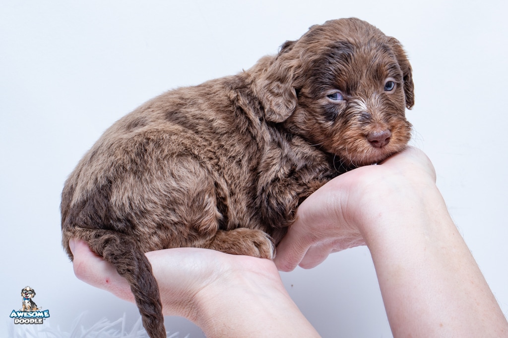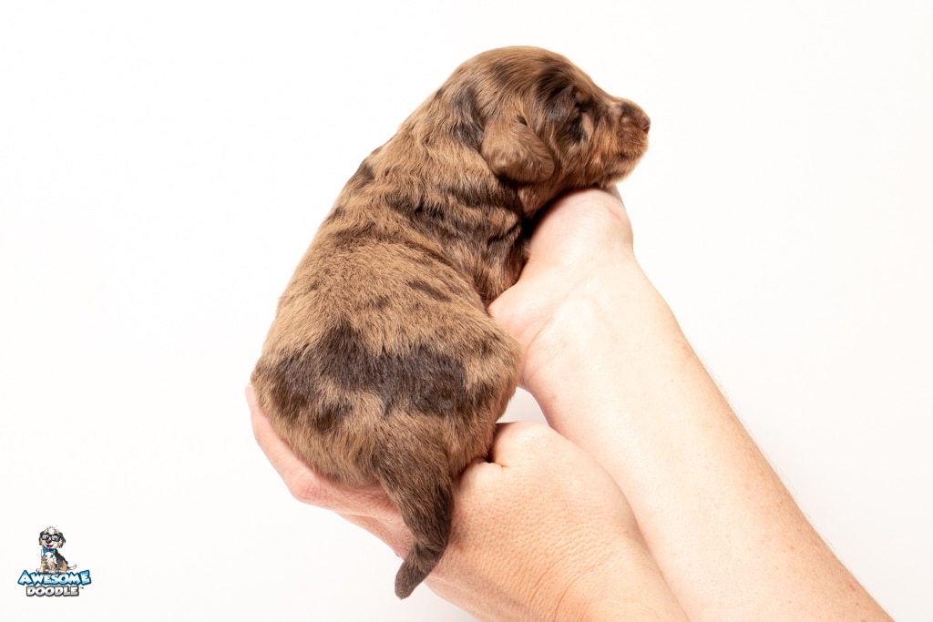 Luca is a male Phantom Chocolate Merle F1 AussieDoodle puppy.