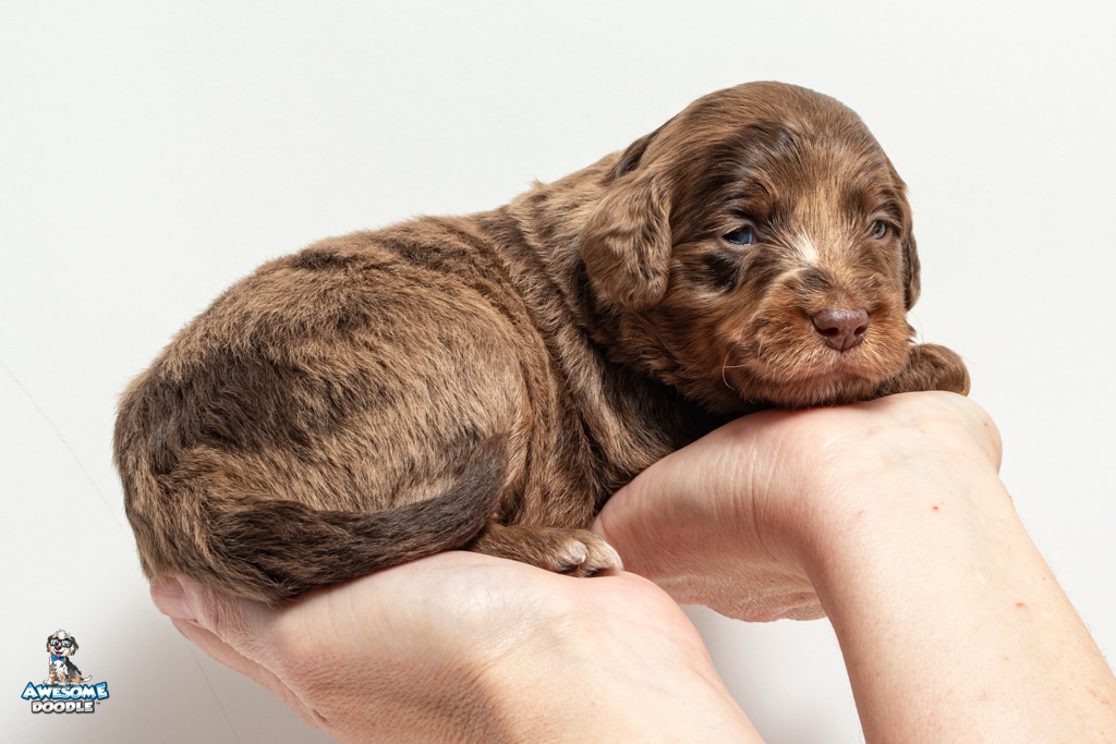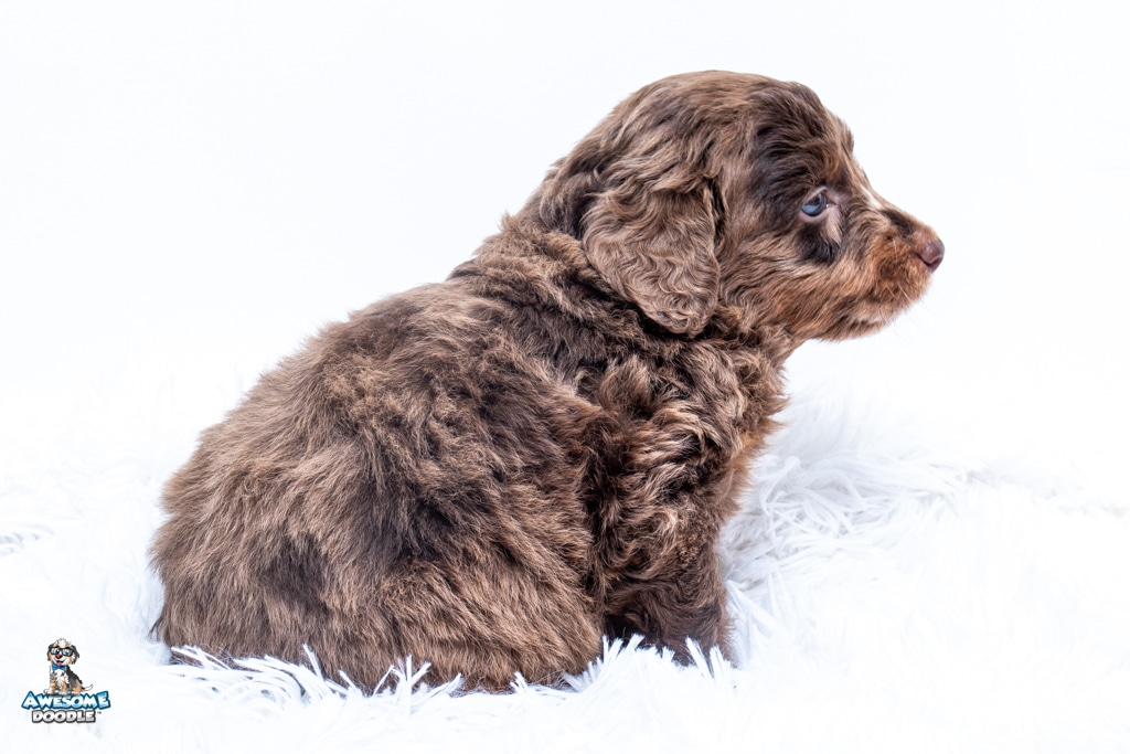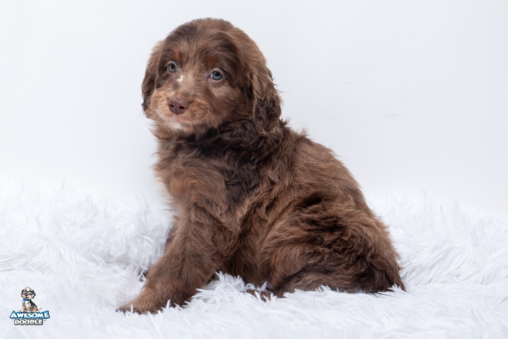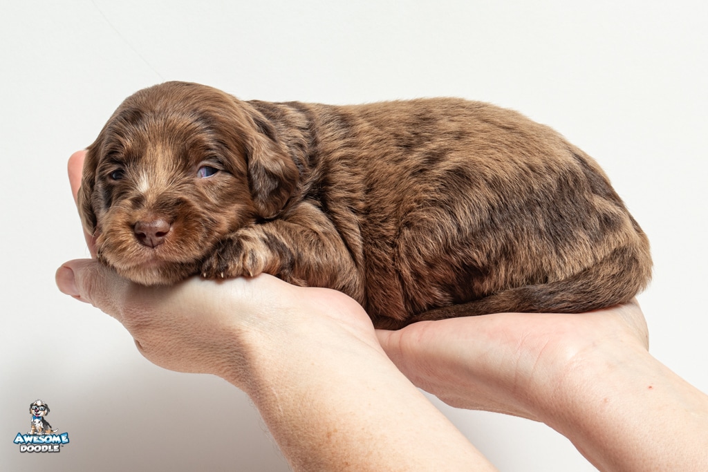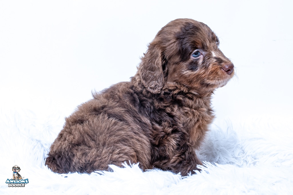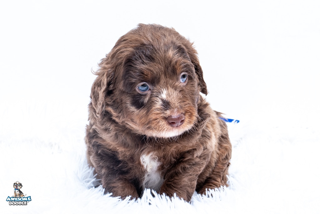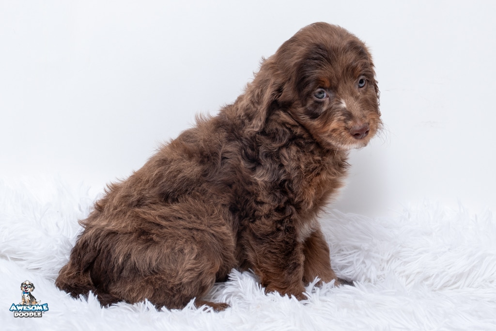 Luca is a male Phantom Chocolate Merle F1 AussieDoodle puppy.