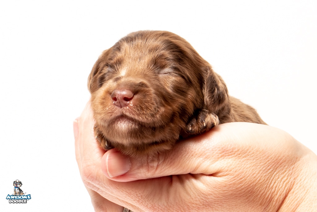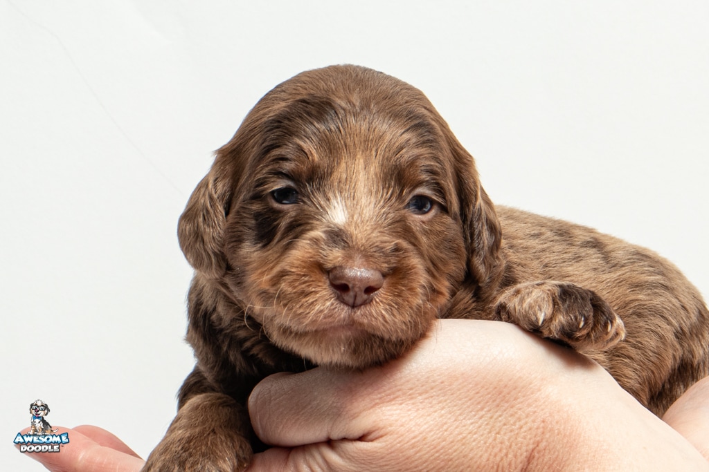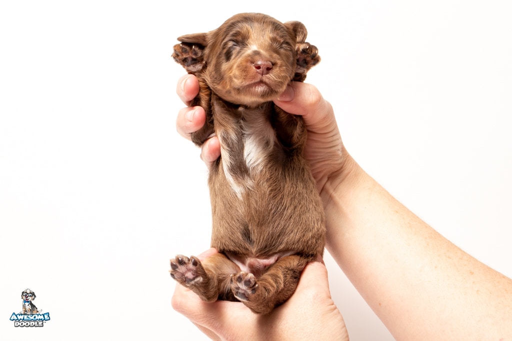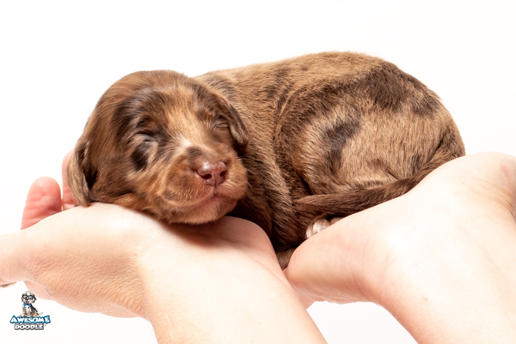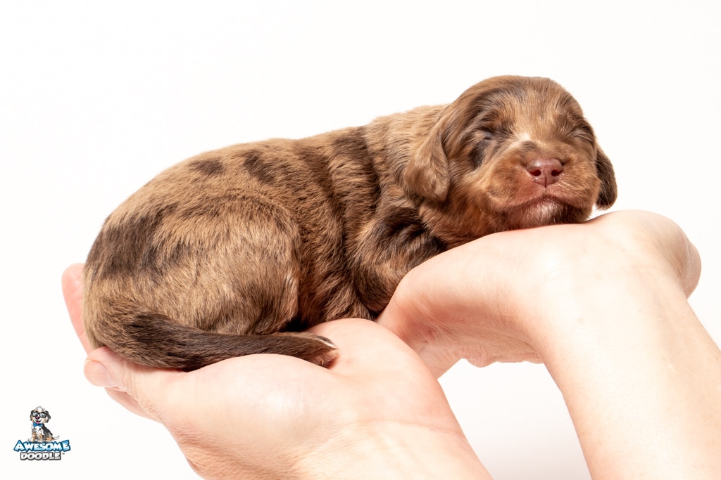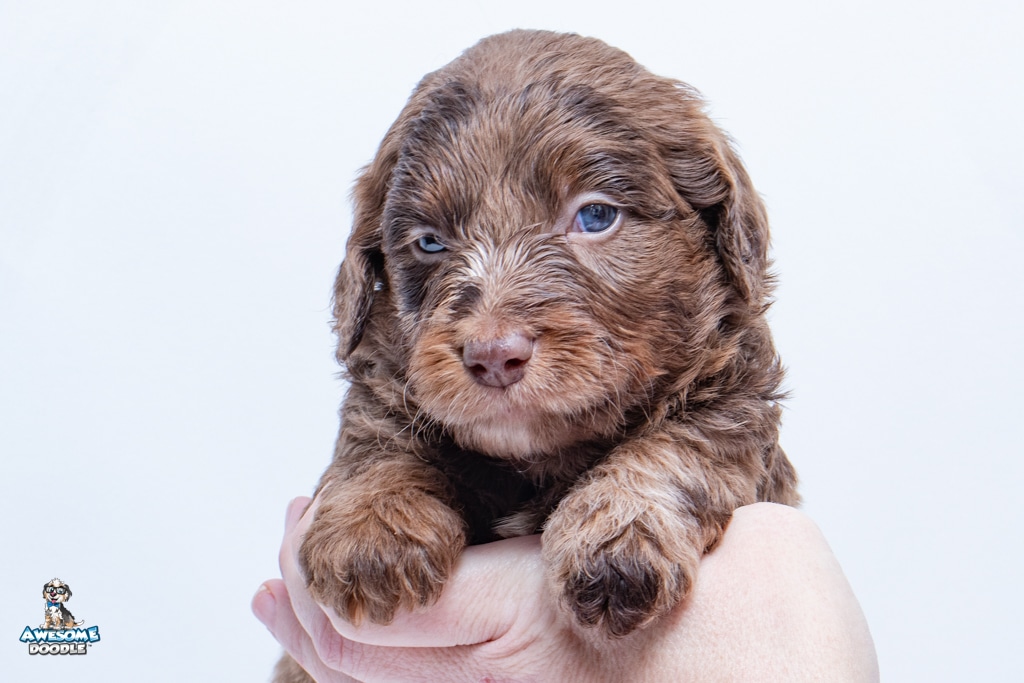 Luca is a male Phantom Chocolate Merle F1 AussieDoodle puppy.
