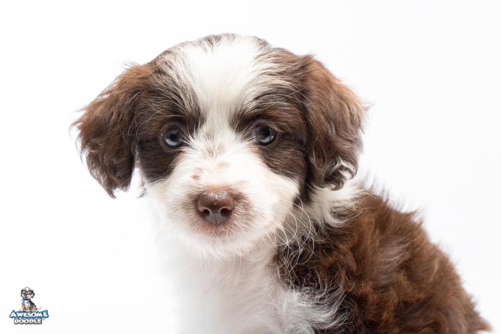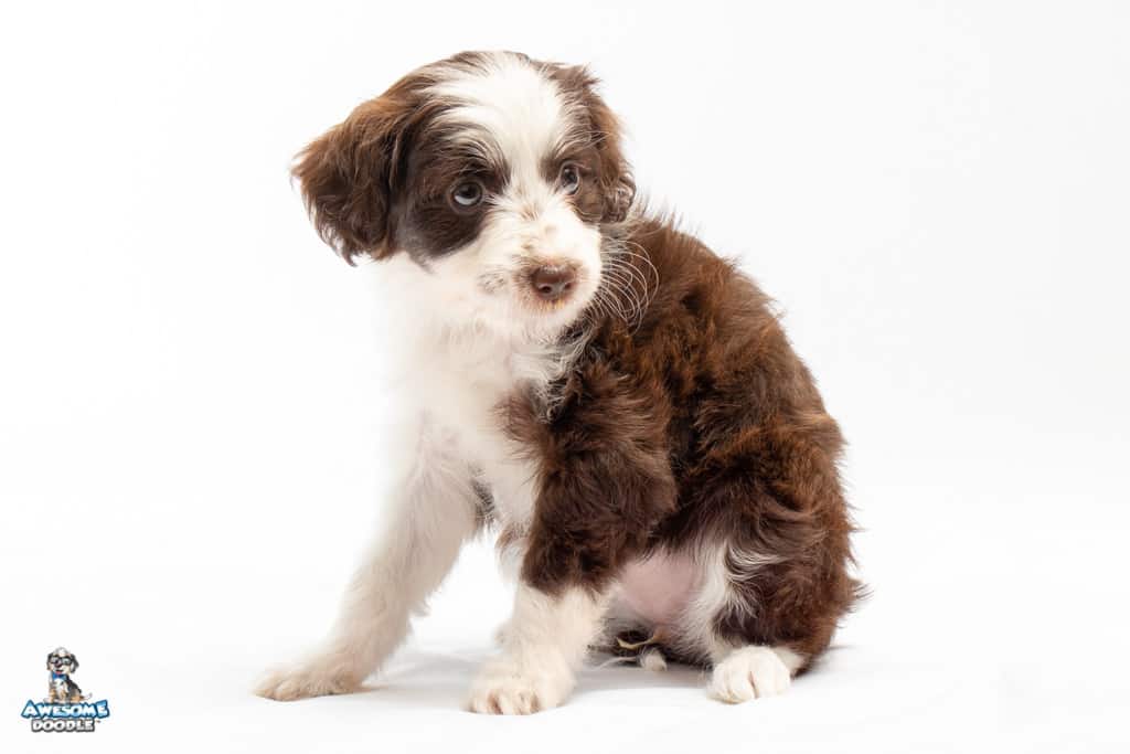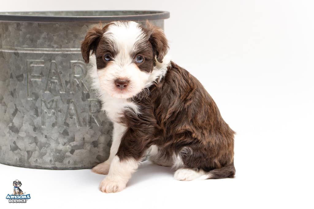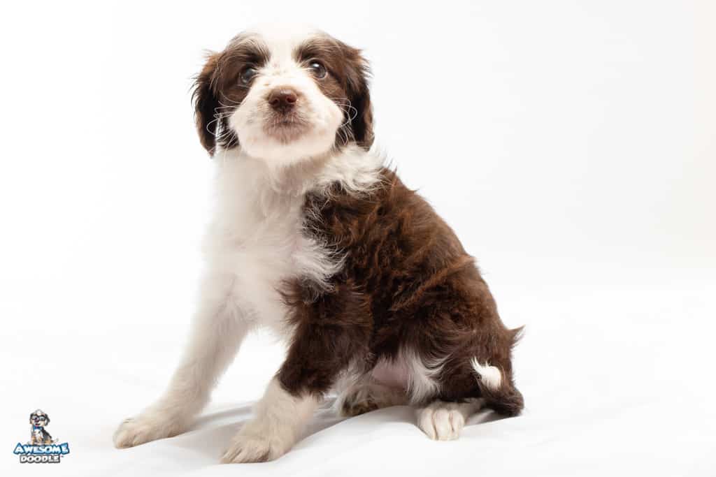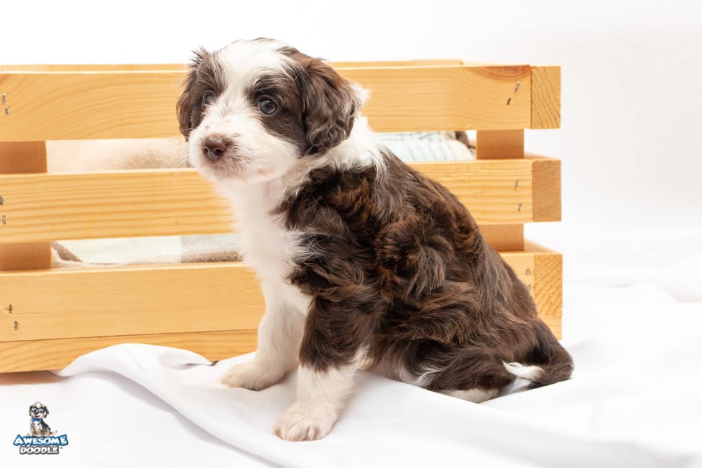 Tessa is a female Chocolate Bi-Color F1 AussieDoodle puppy.