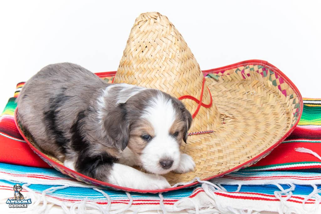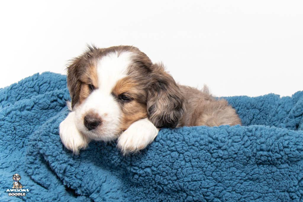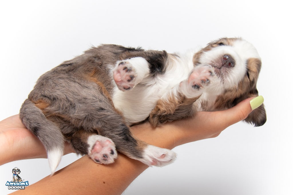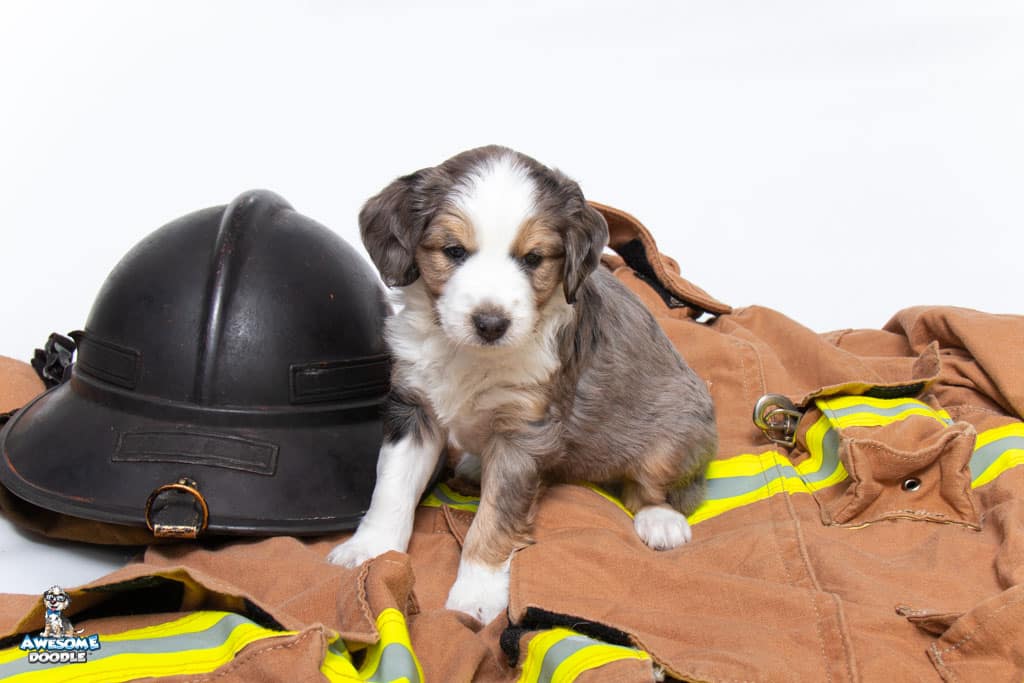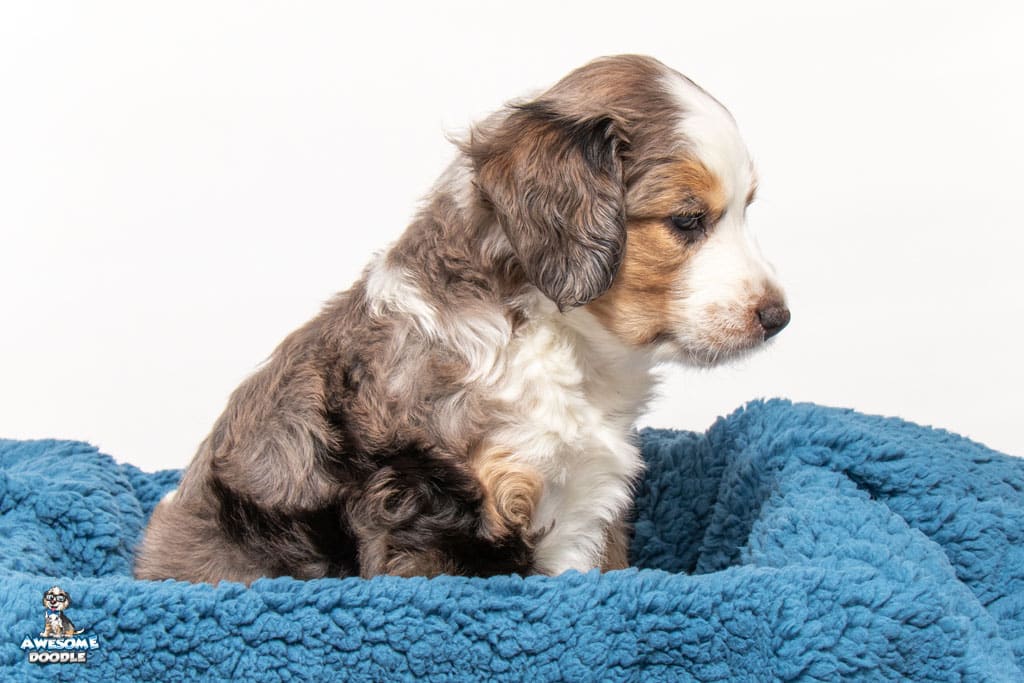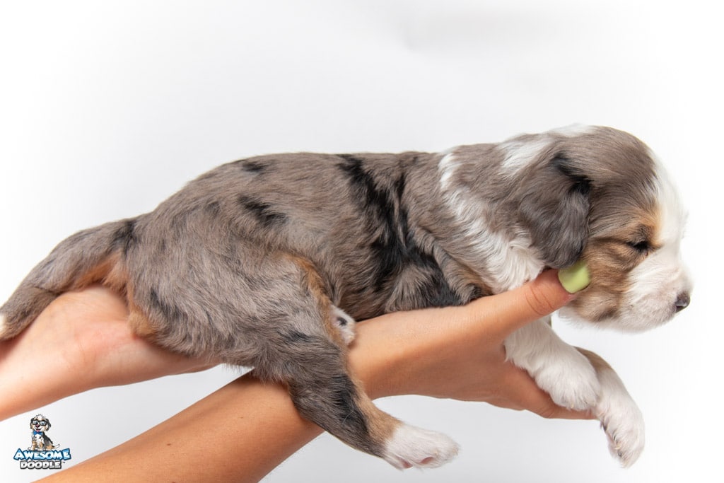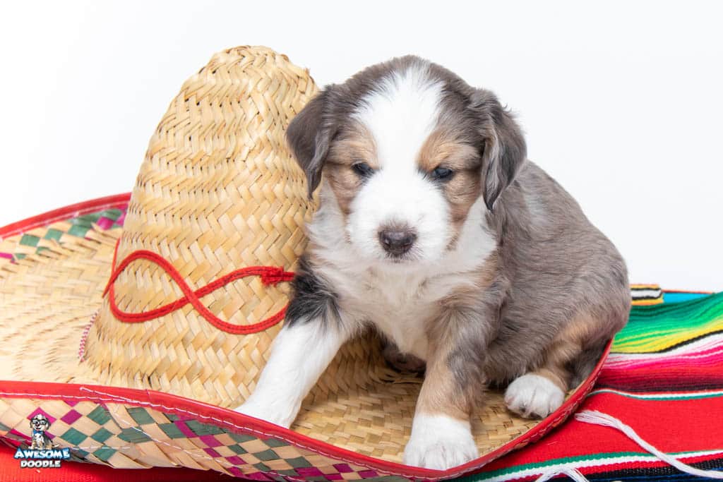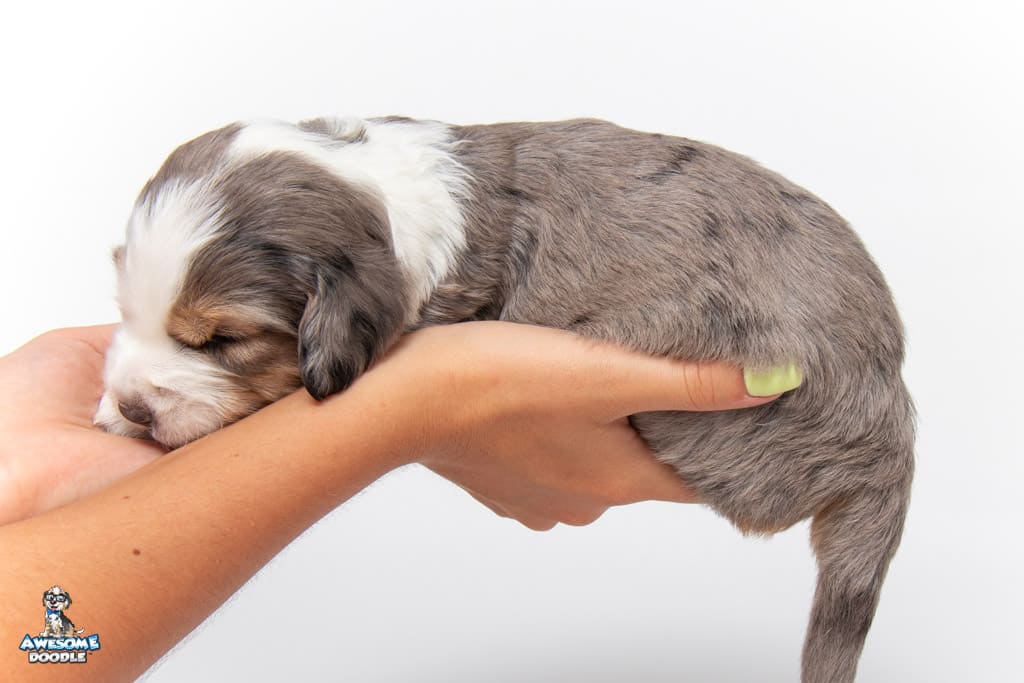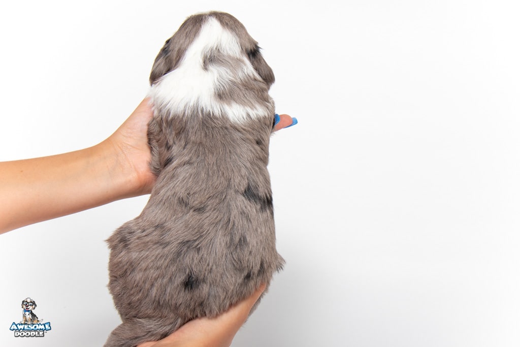 Beans is a male Blue Merle w/ White & Copper F1 AussieDoodle puppy.