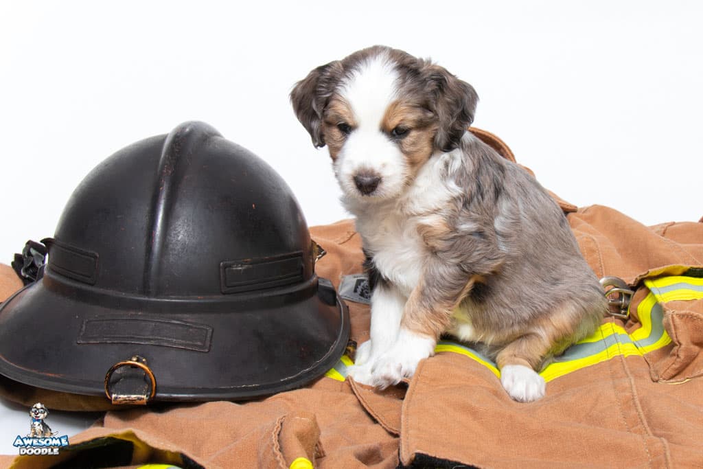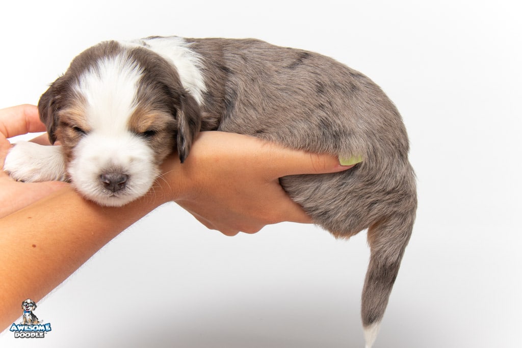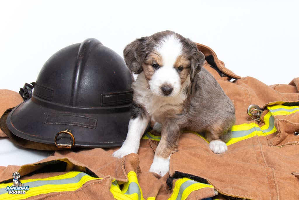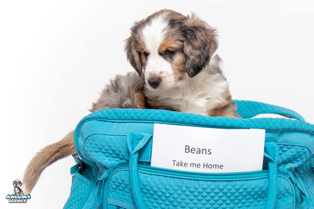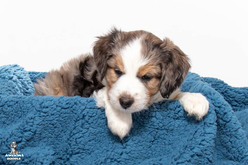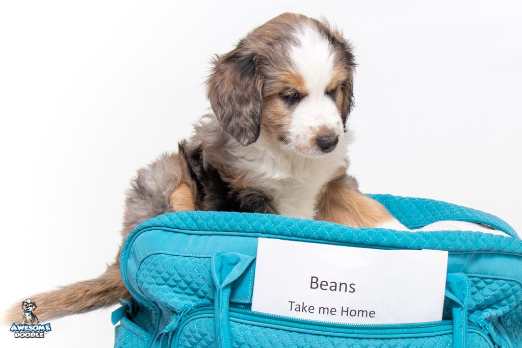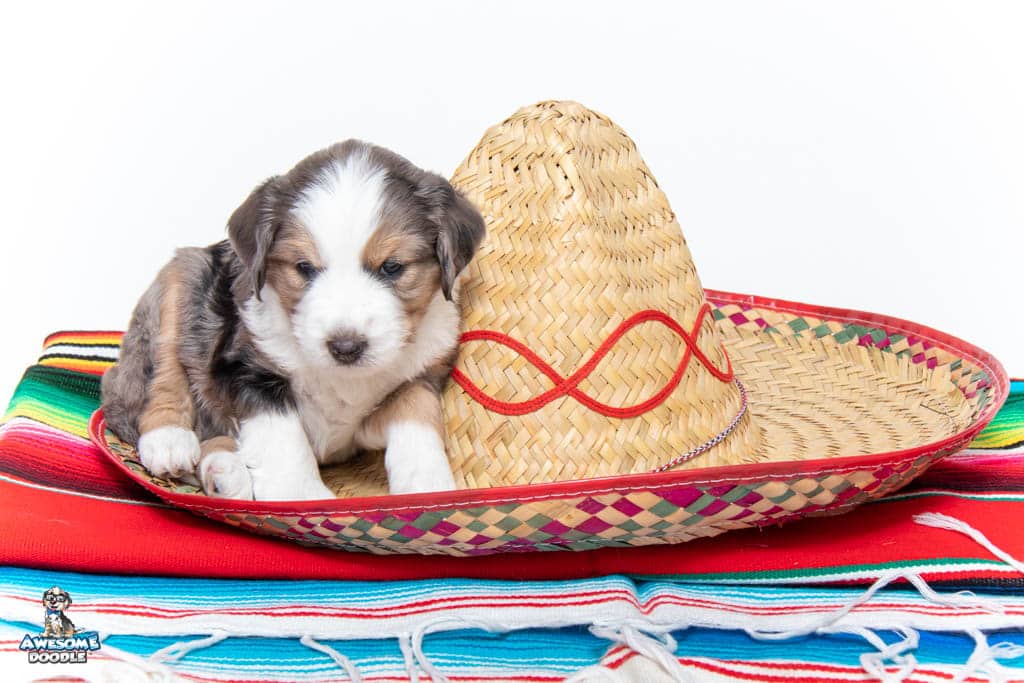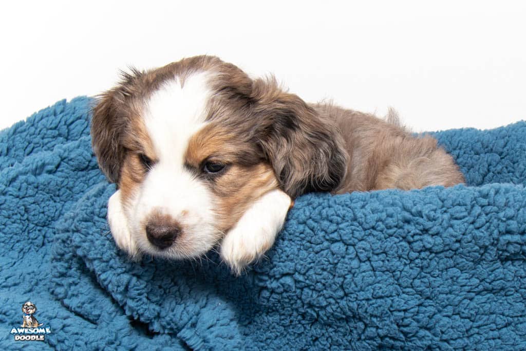 Beans is a male Blue Merle w/ White & Copper F1 AussieDoodle puppy.
