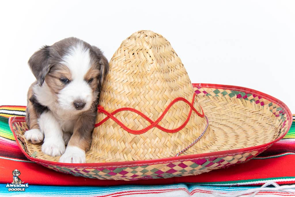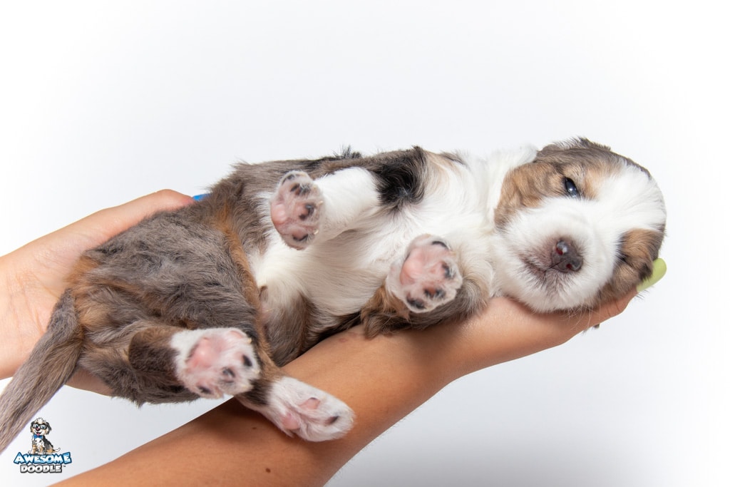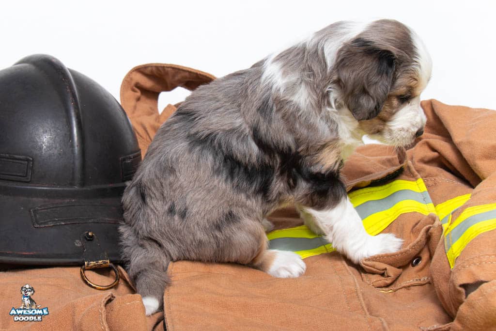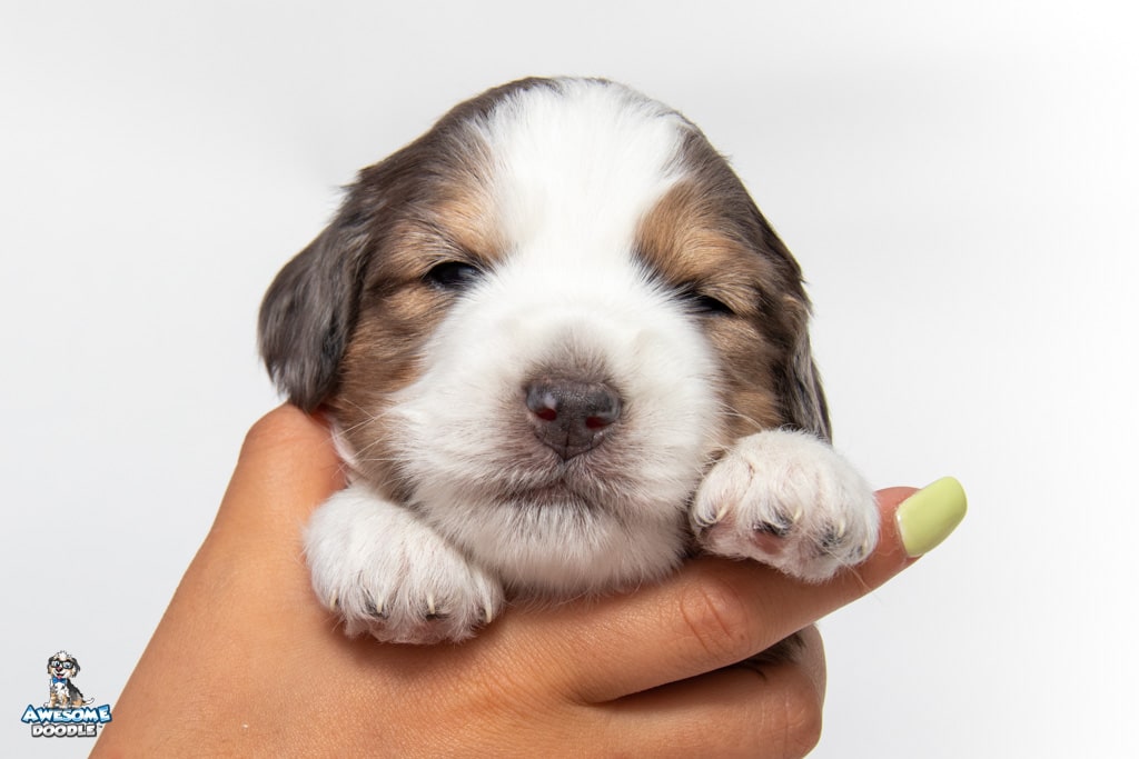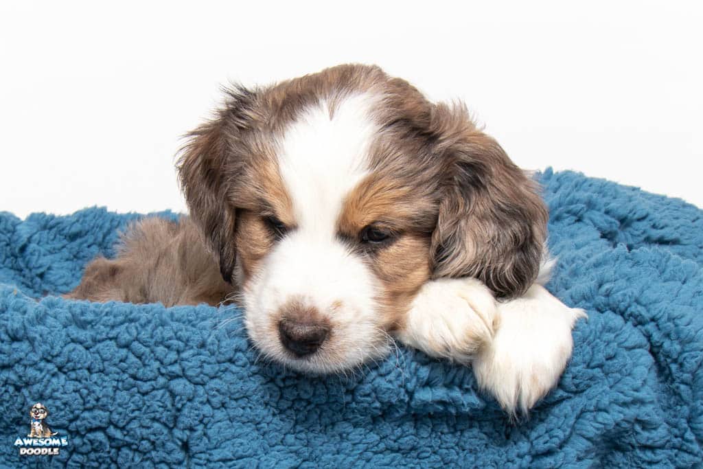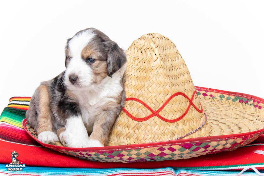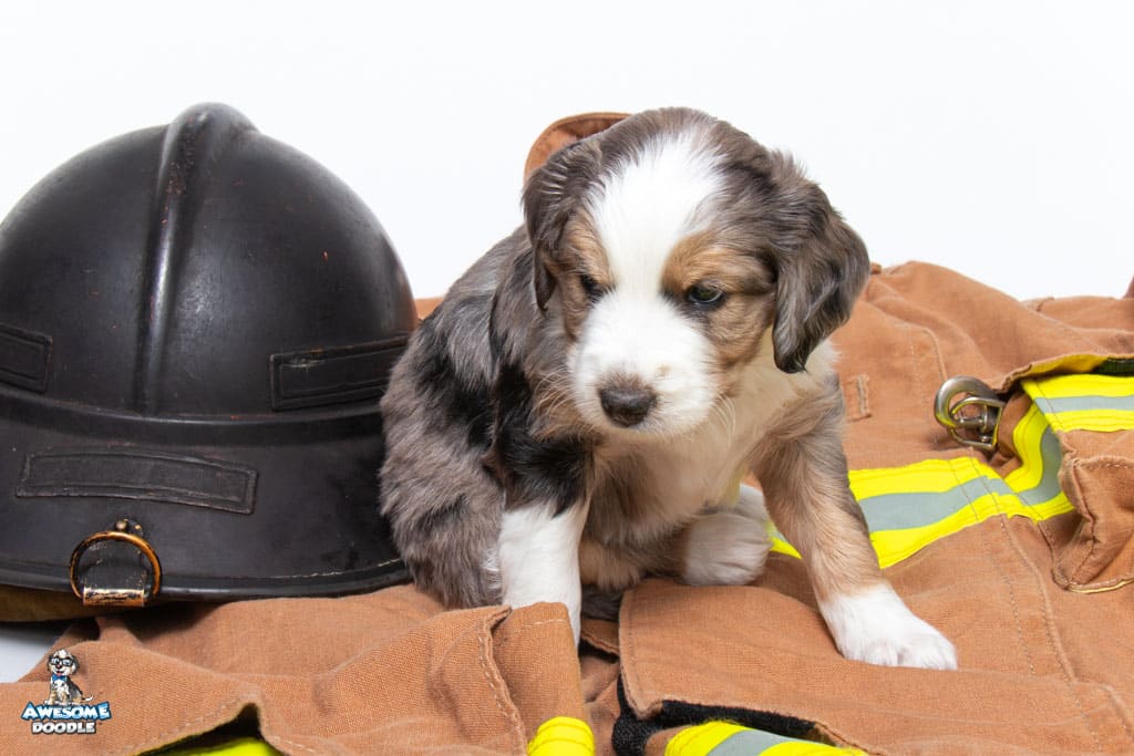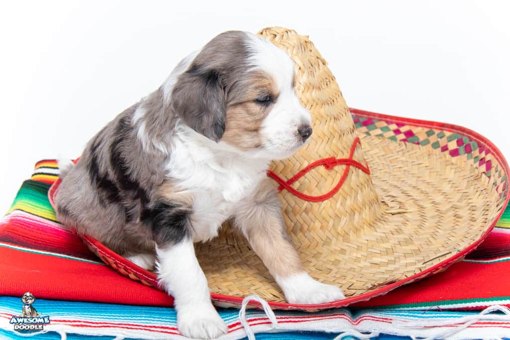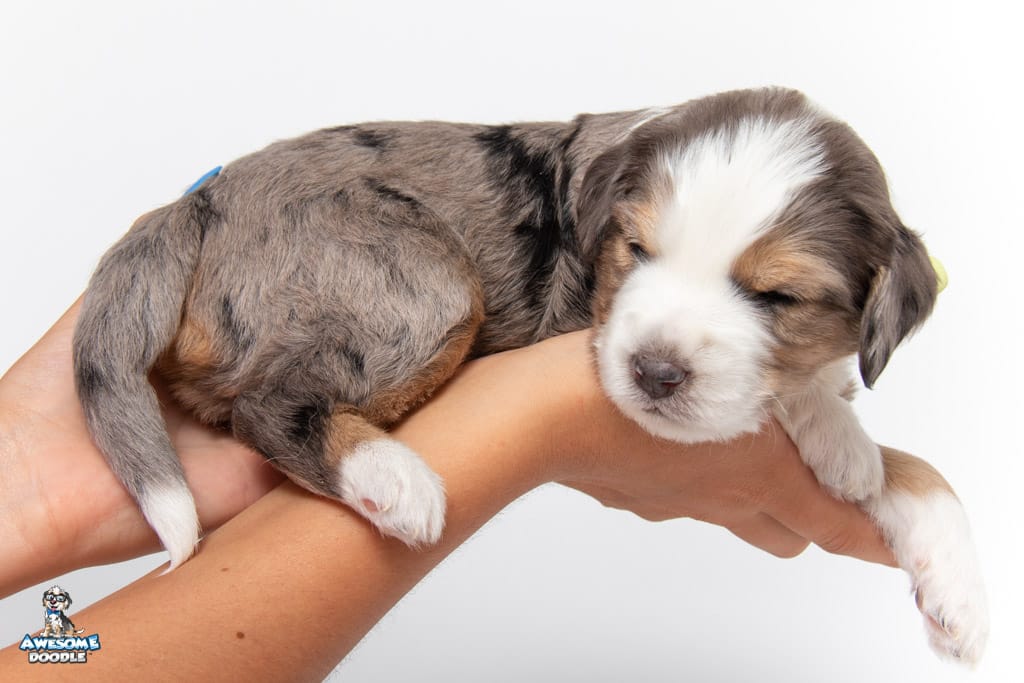 Beans is a male Blue Merle w/ White & Copper F1 AussieDoodle puppy.
