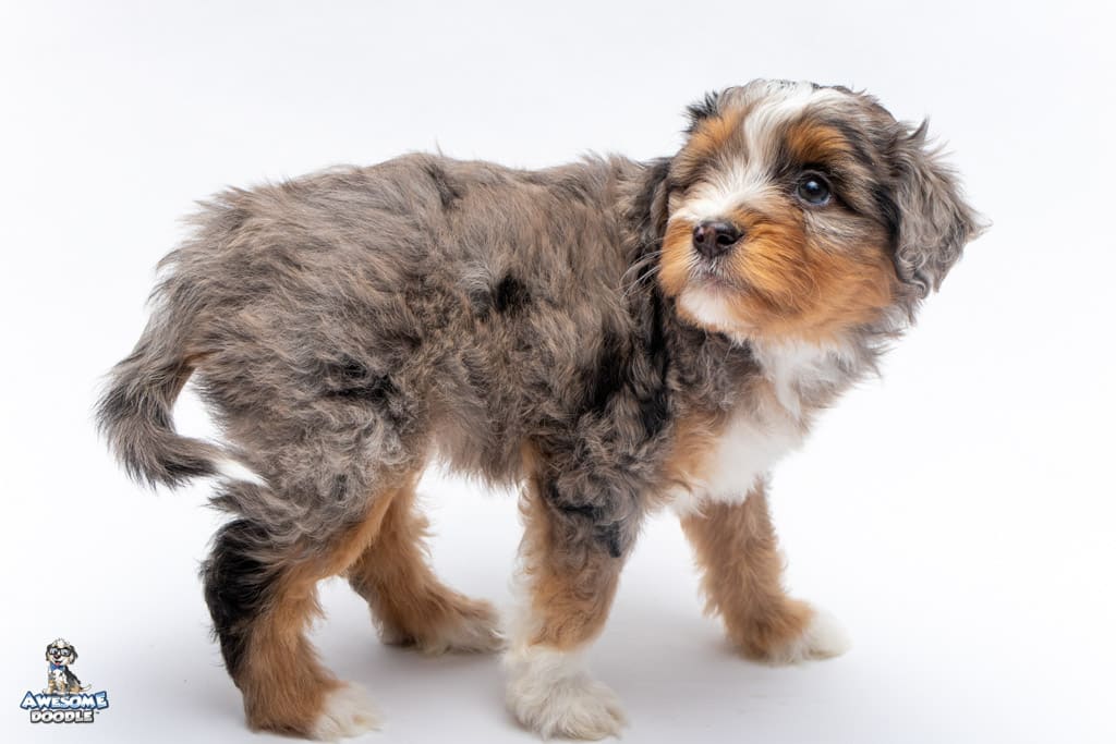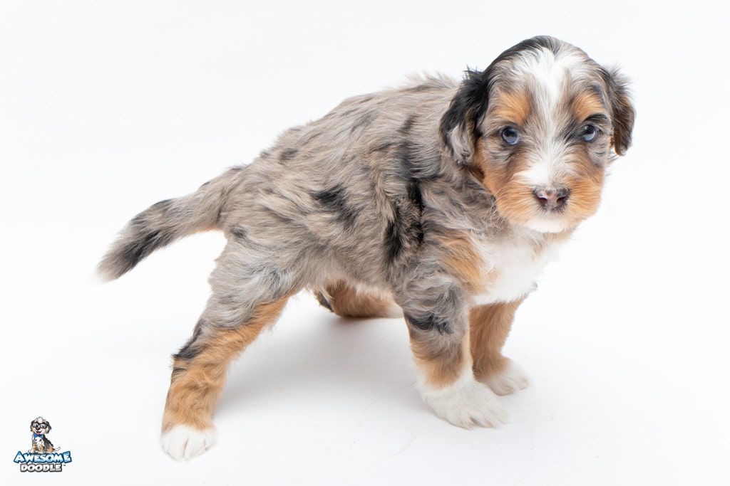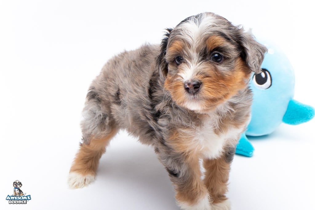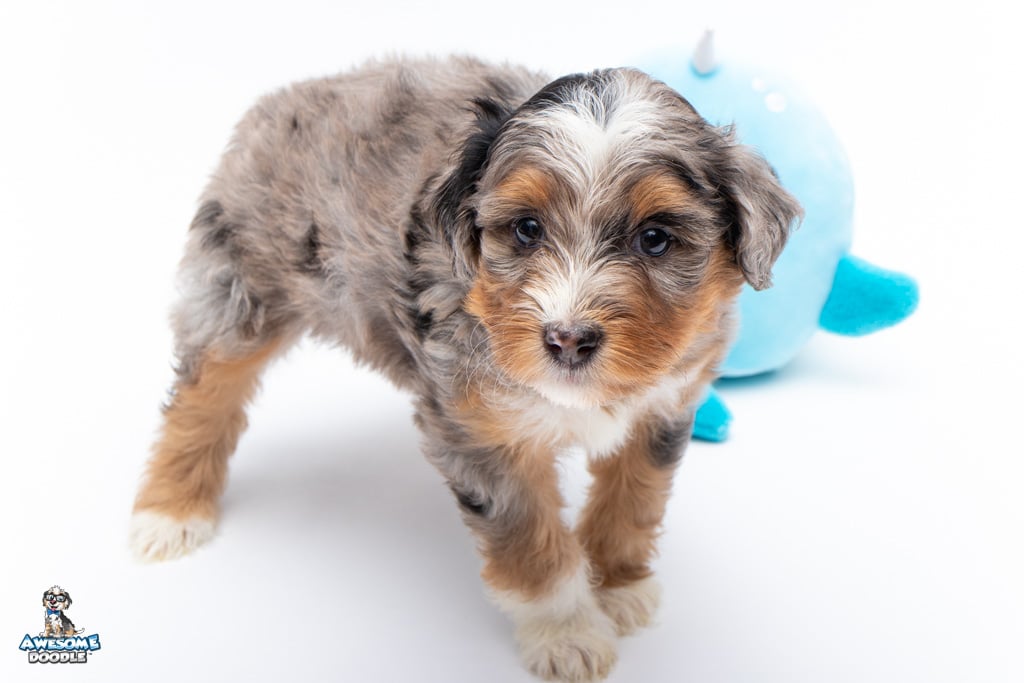 Bella is a female Phantom Blue Merle F1 AussieDoodle puppy.