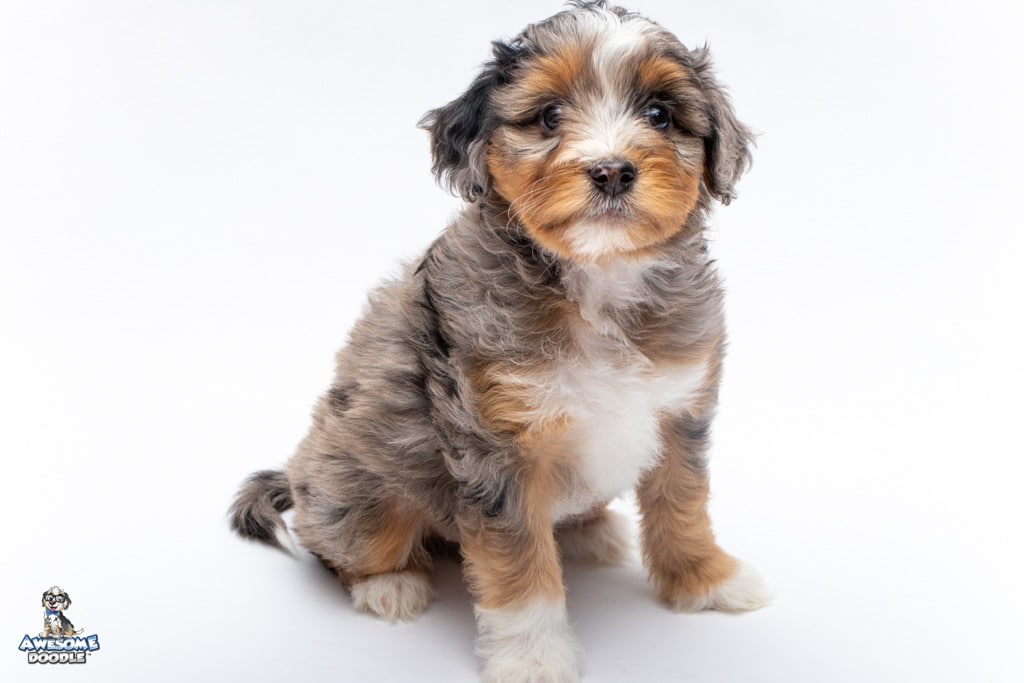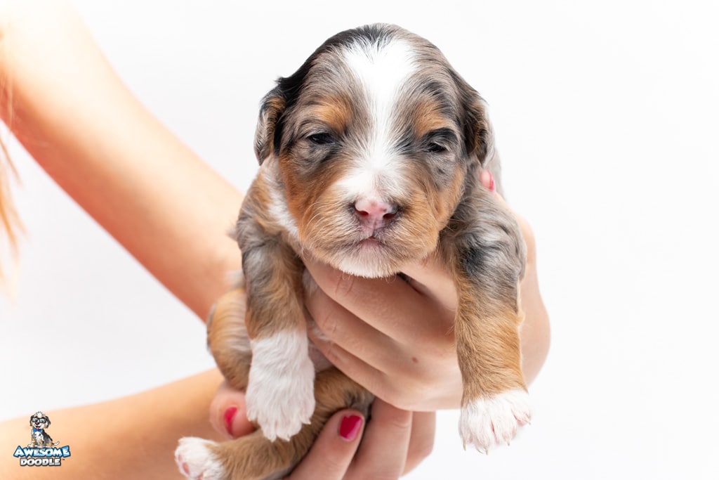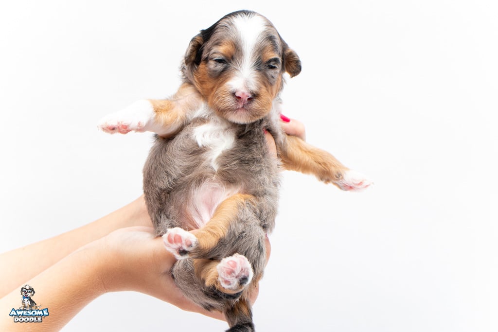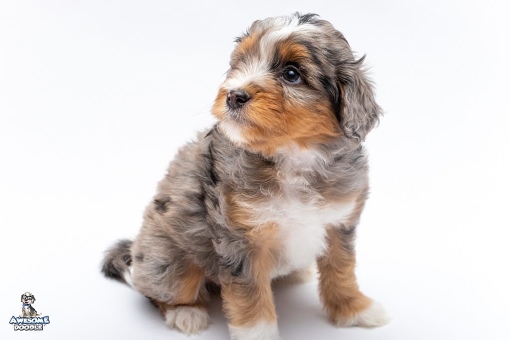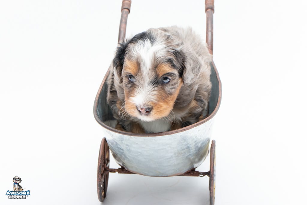 Bella is a female Phantom Blue Merle F1 AussieDoodle puppy.