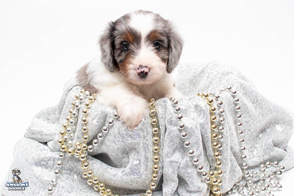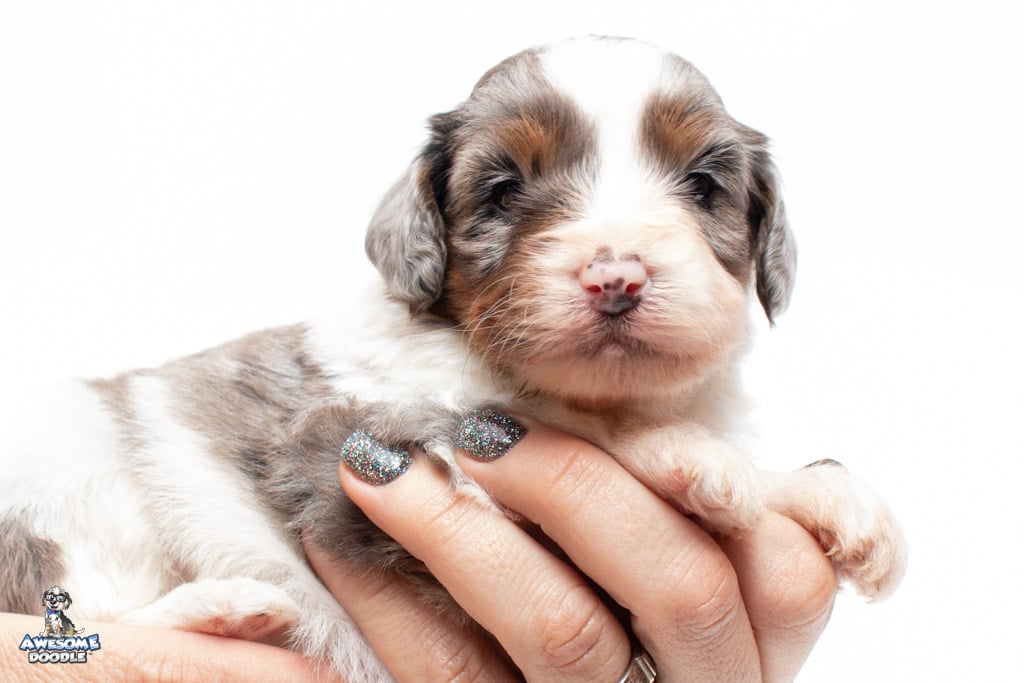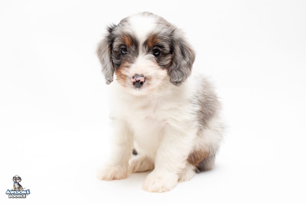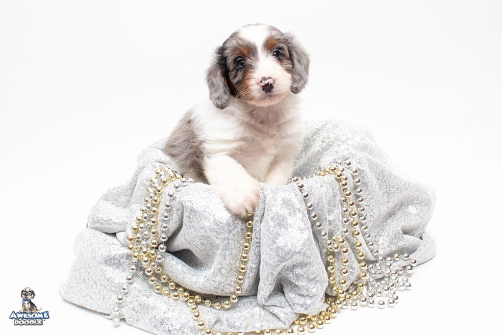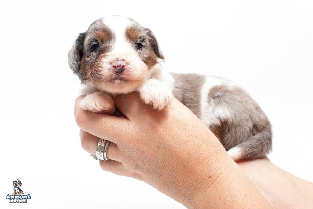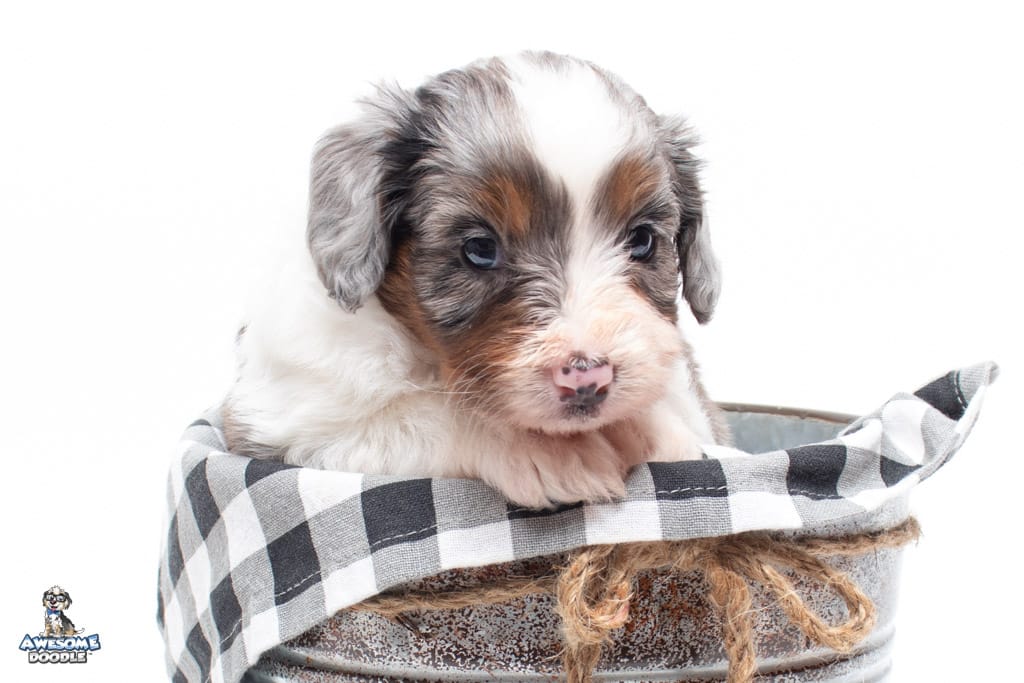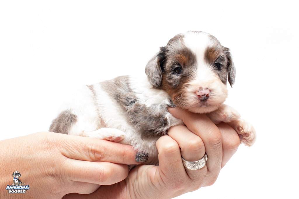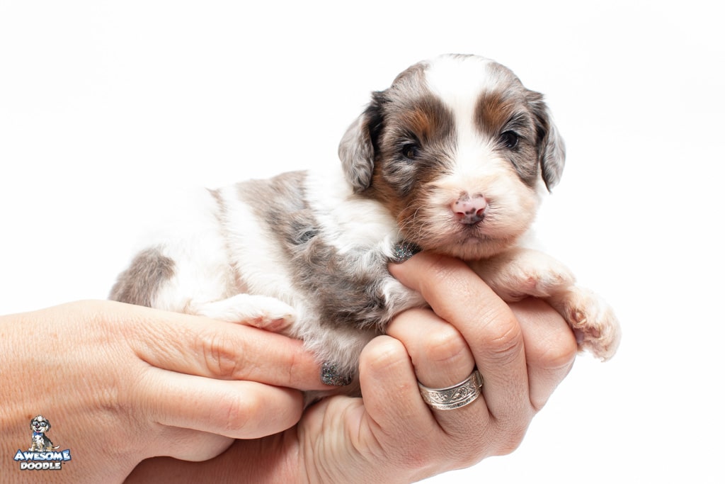 Belle is a female Blue Merle w/ White & Copper F1 AussieDoodle puppy.