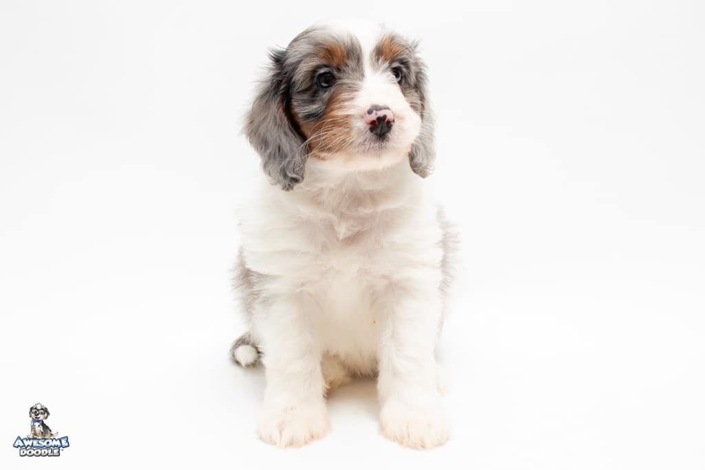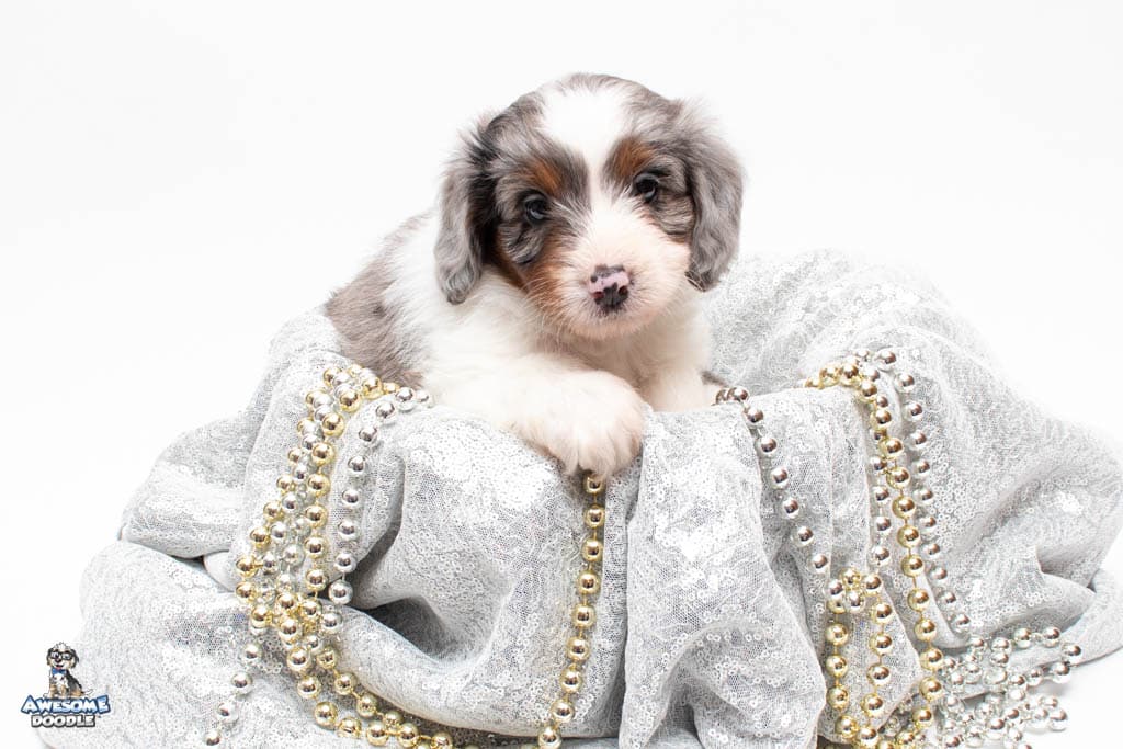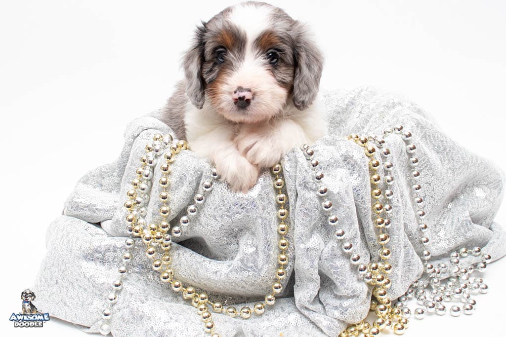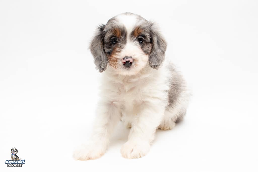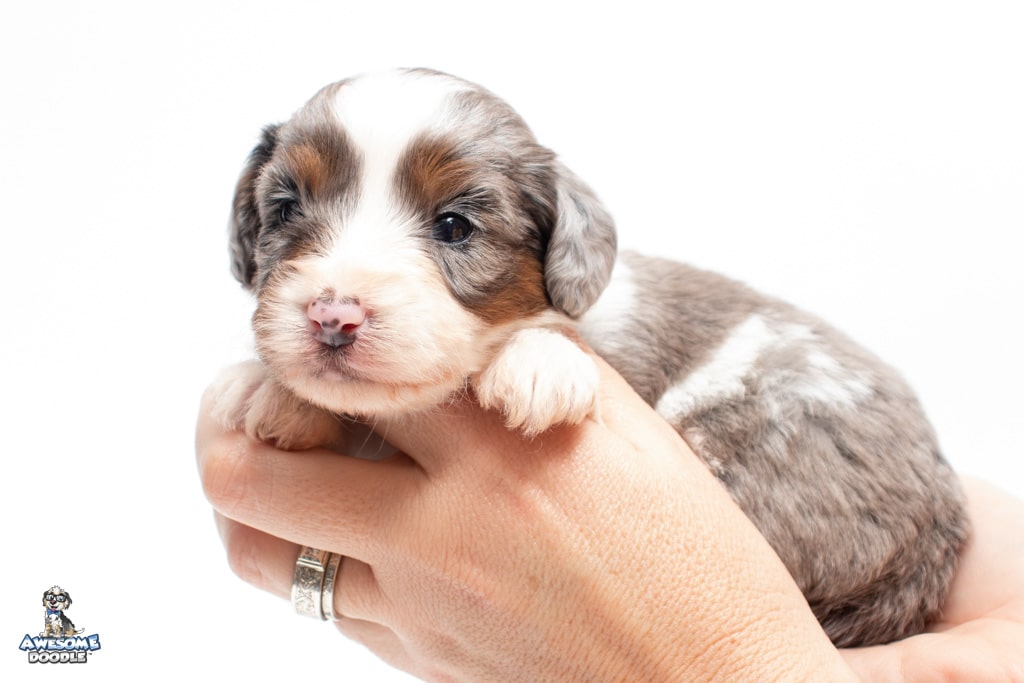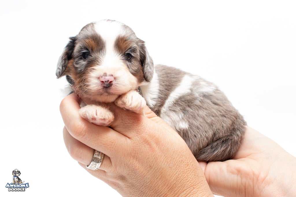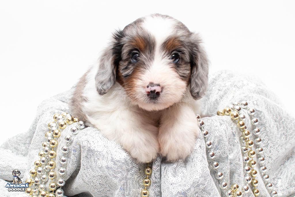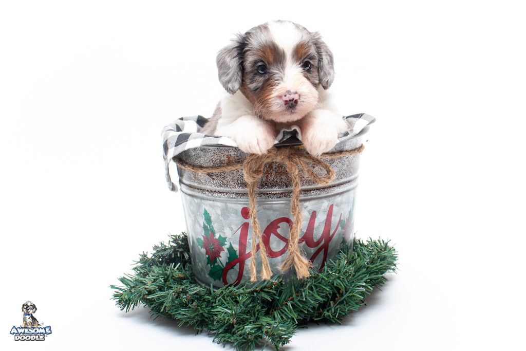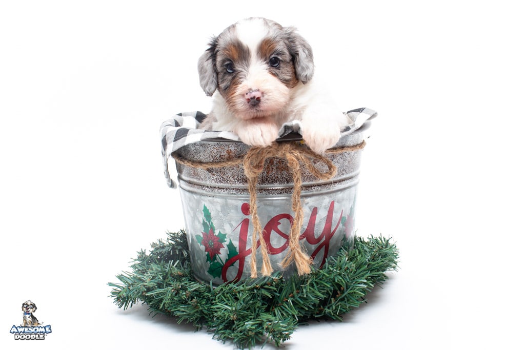 Belle is a female Blue Merle w/ White & Copper F1 AussieDoodle puppy.