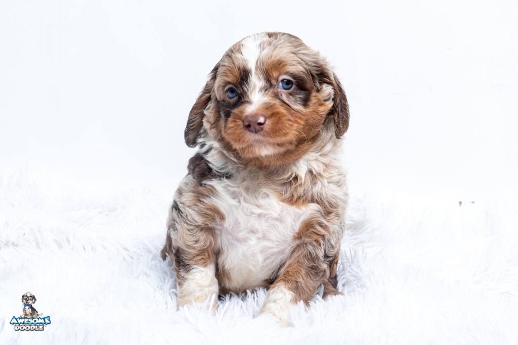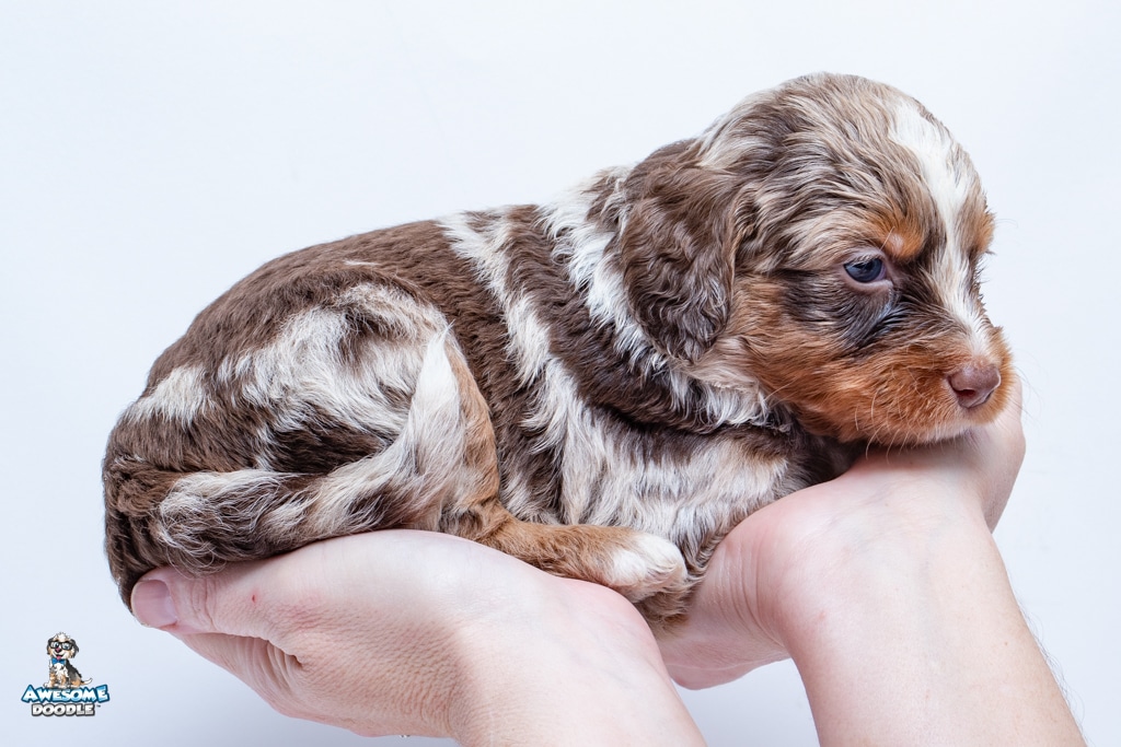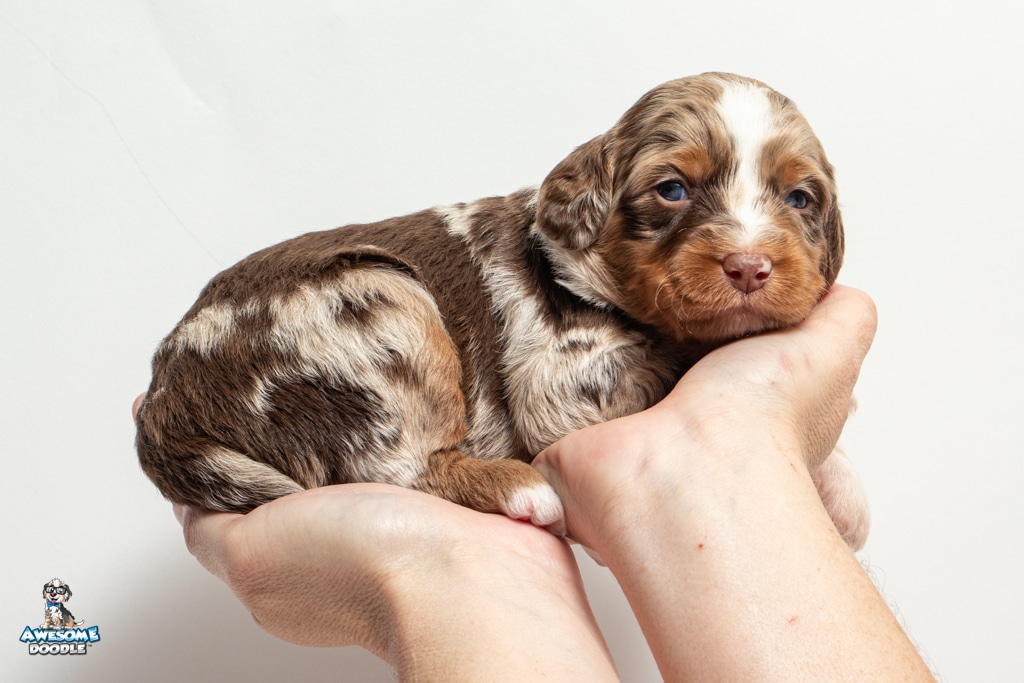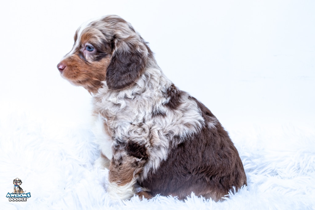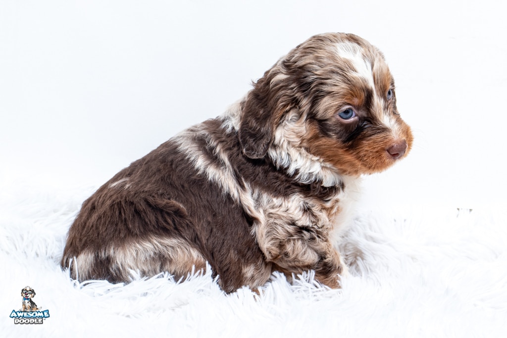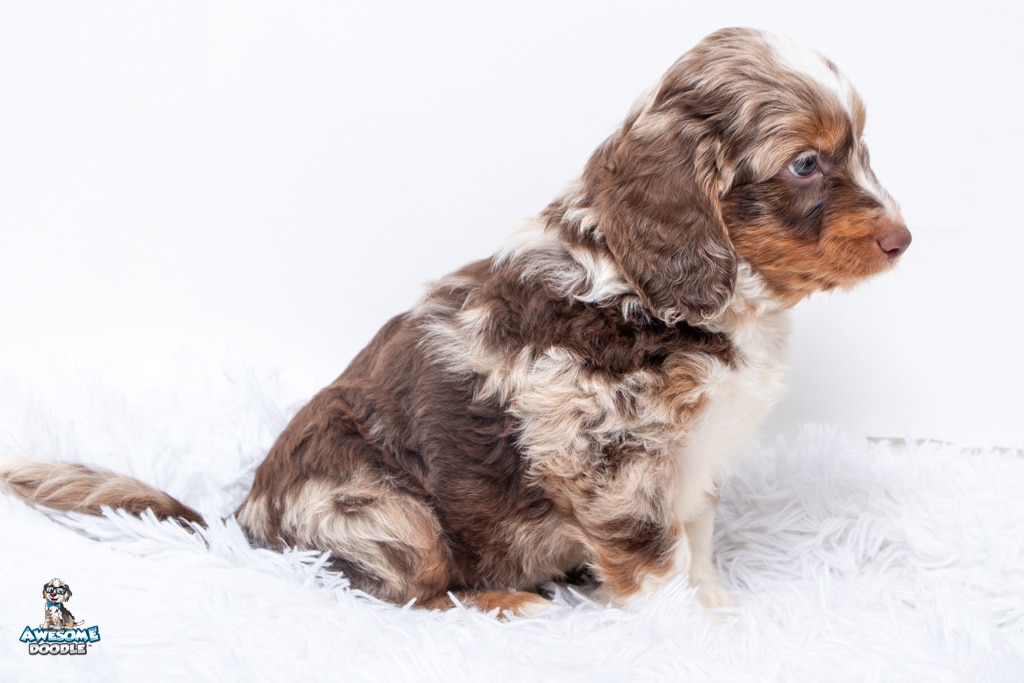 Benji is a male Phantom Chocolate Merle F1 AussieDoodle puppy.