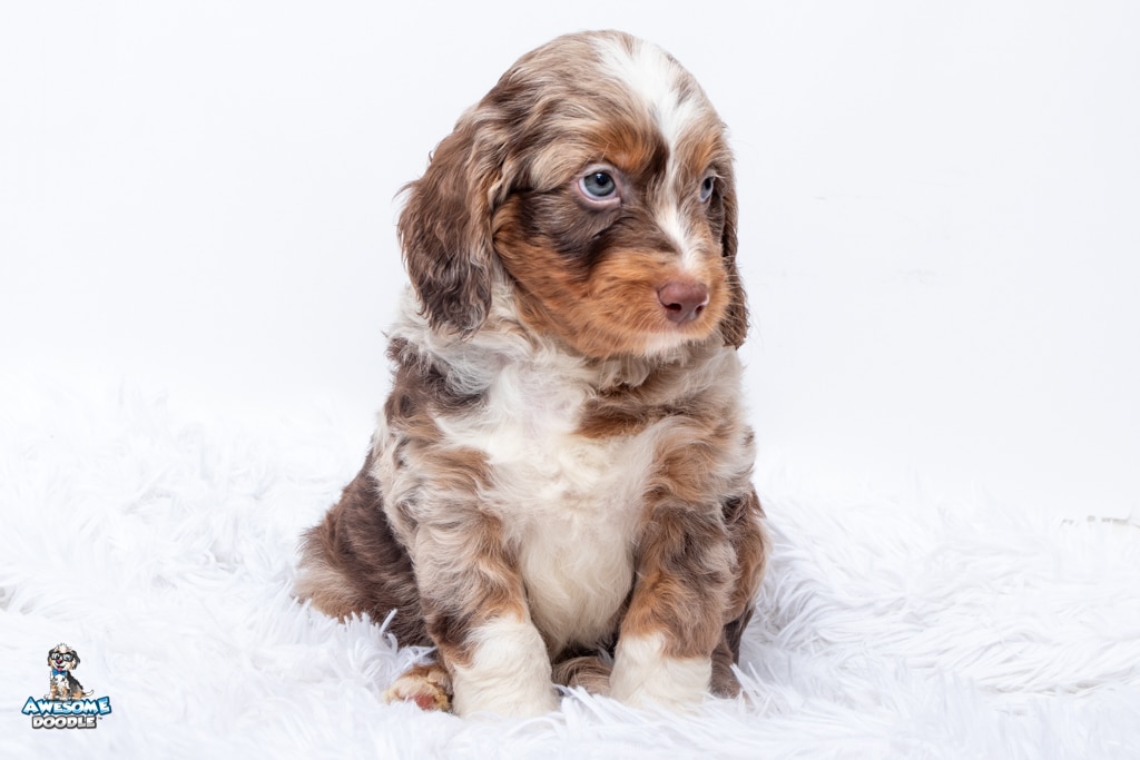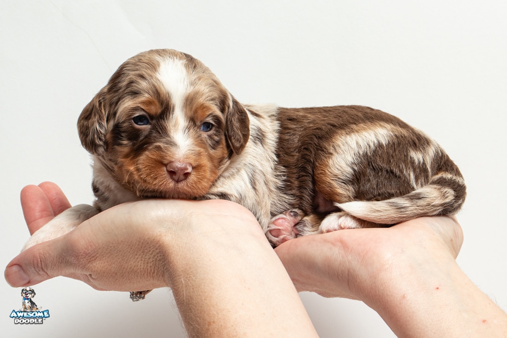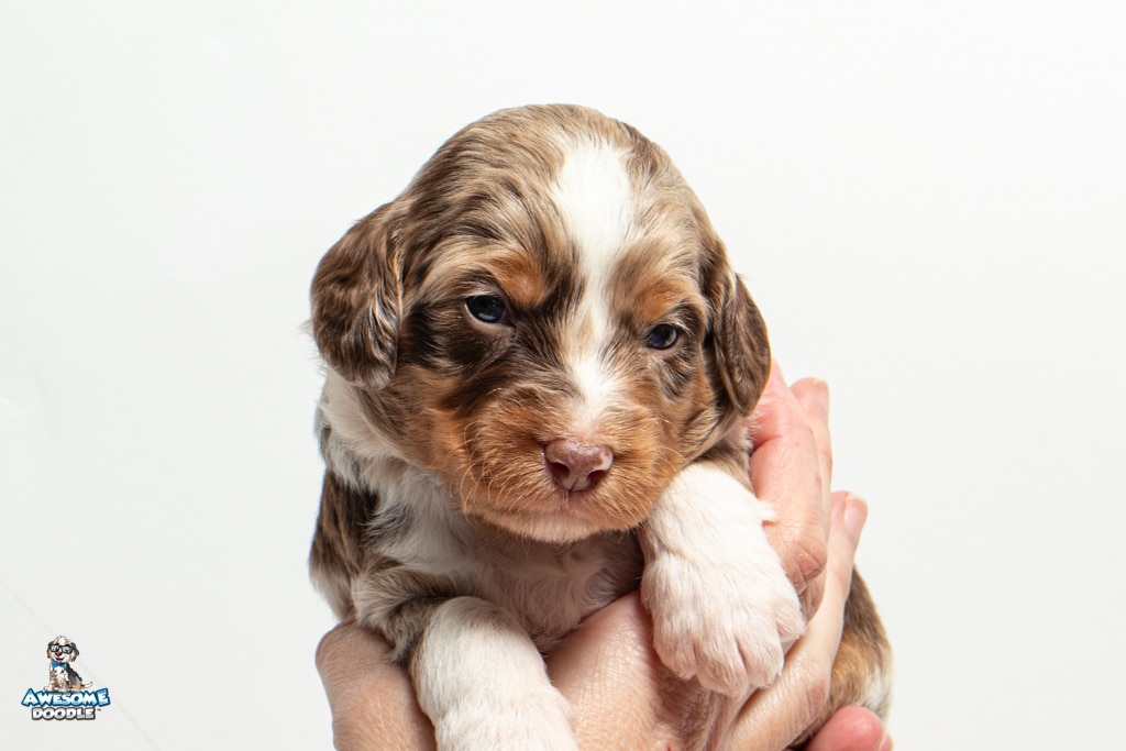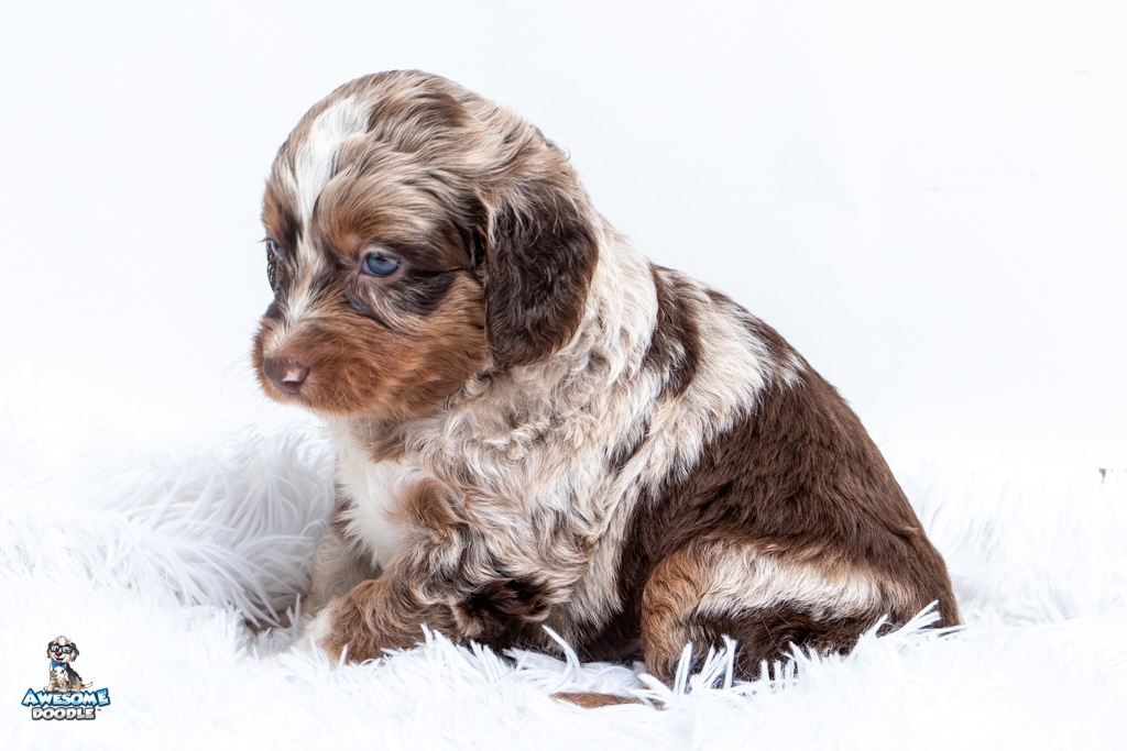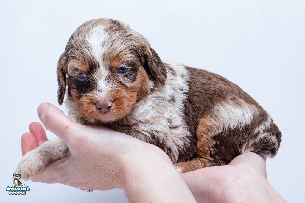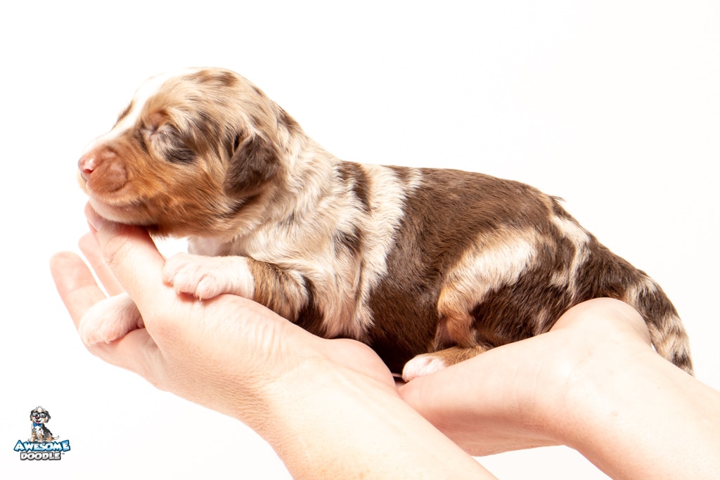 Benji is a male Phantom Chocolate Merle F1 AussieDoodle puppy.