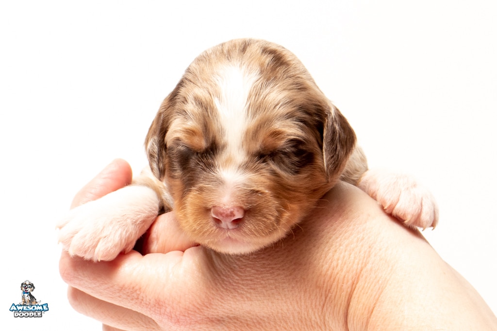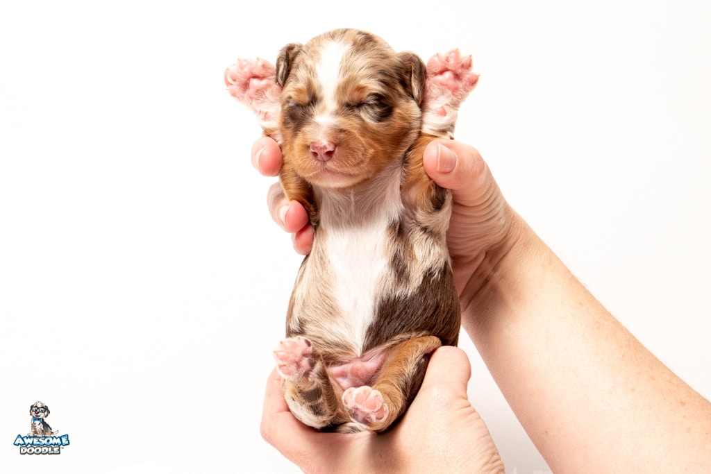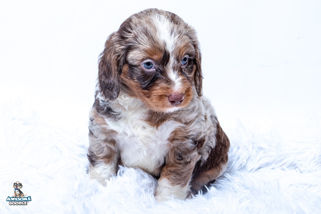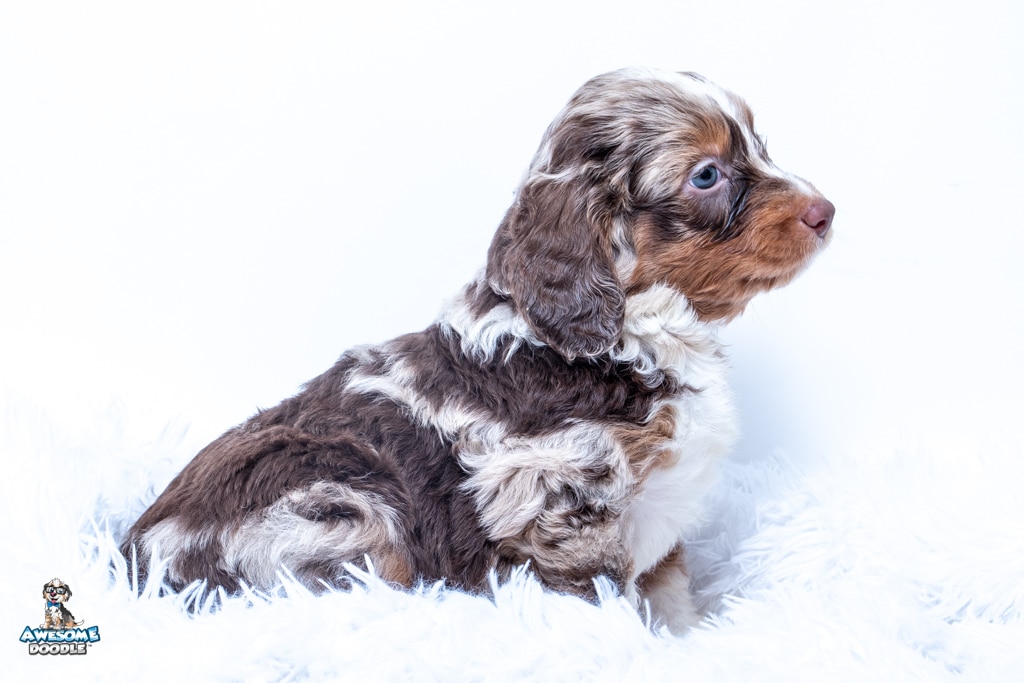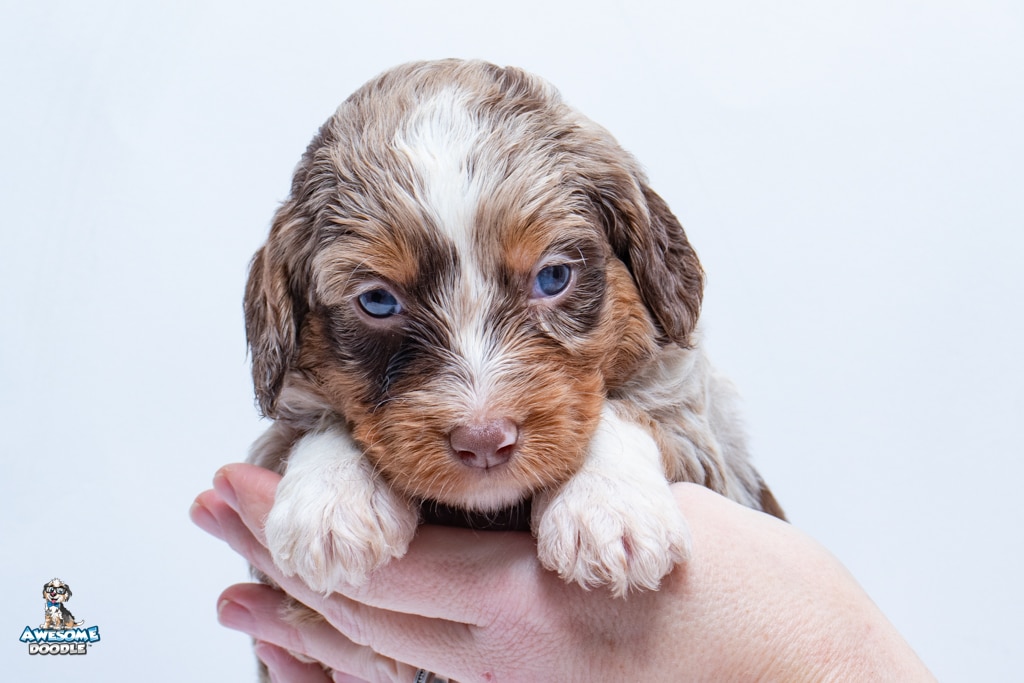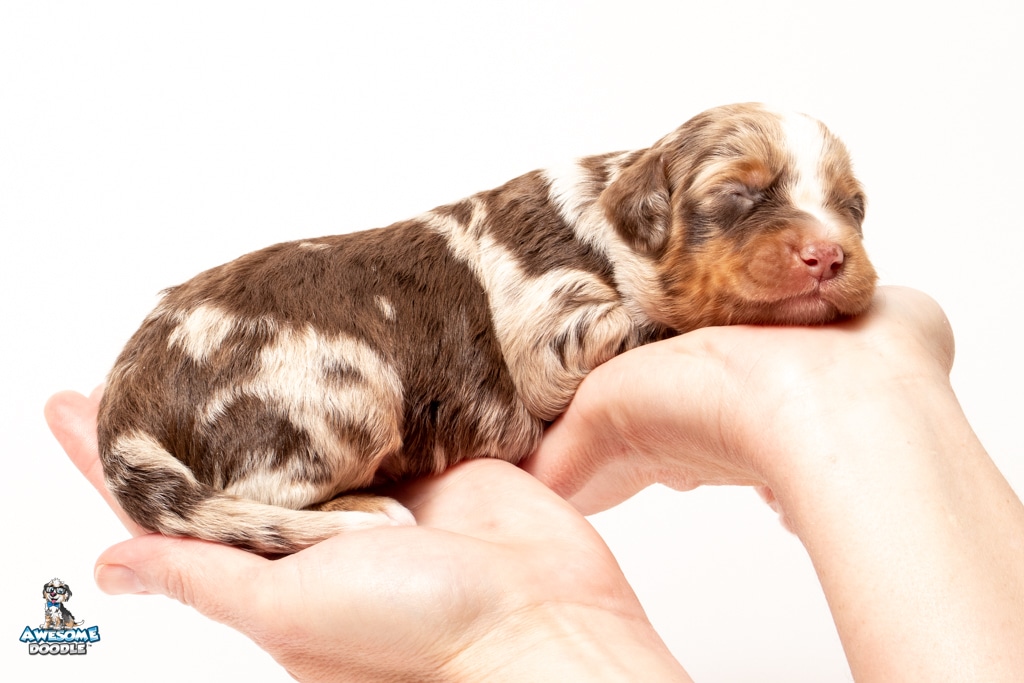 Benji is a male Phantom Chocolate Merle F1 AussieDoodle puppy.