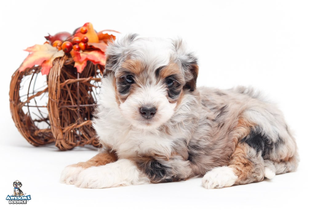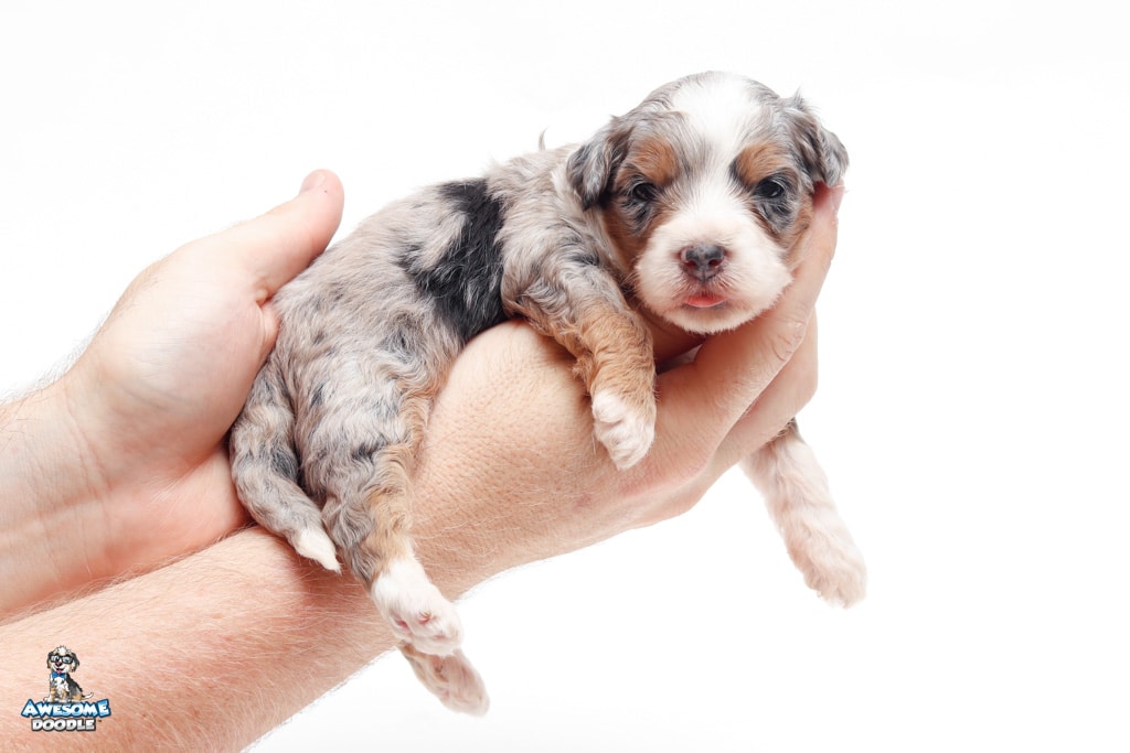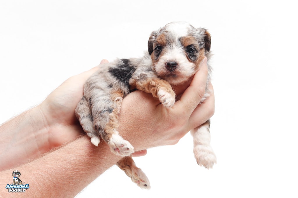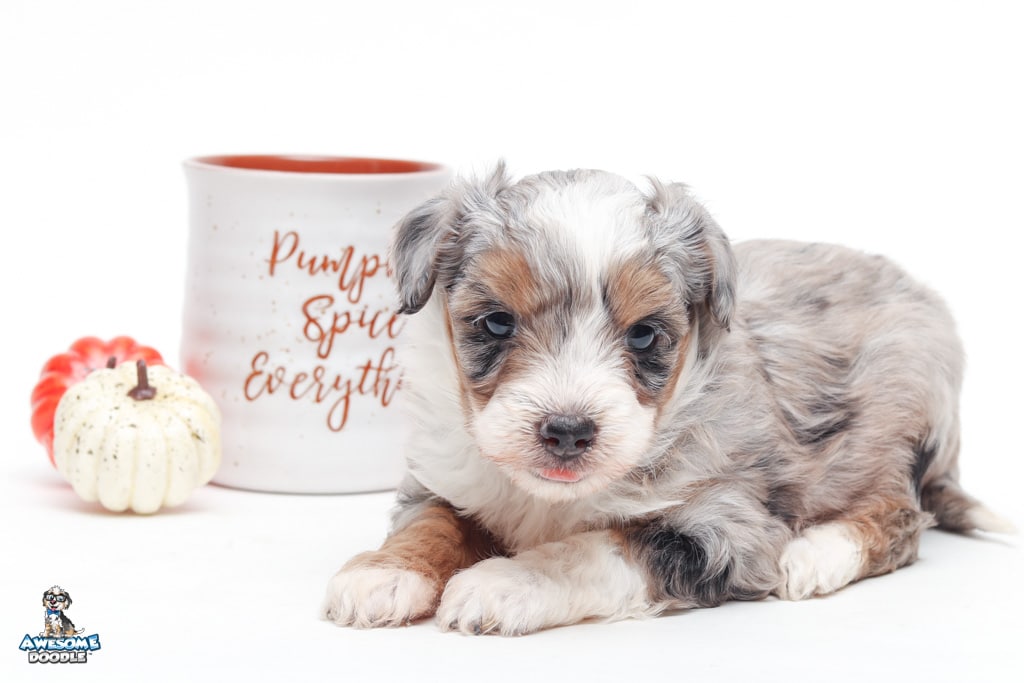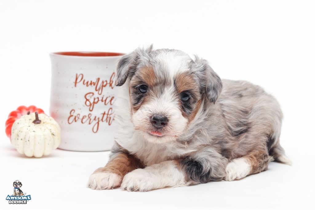 Sophie is a female Blue Merle w/ White & Copper F1 AussieDoodle puppy.