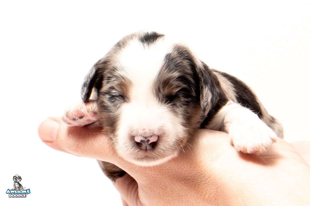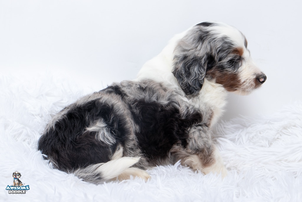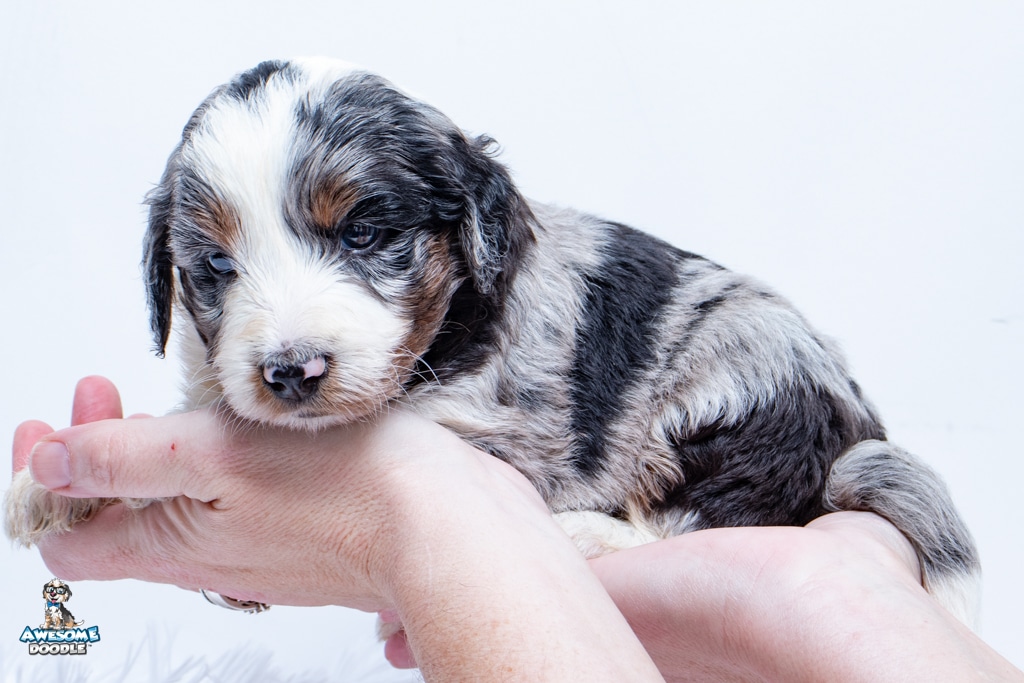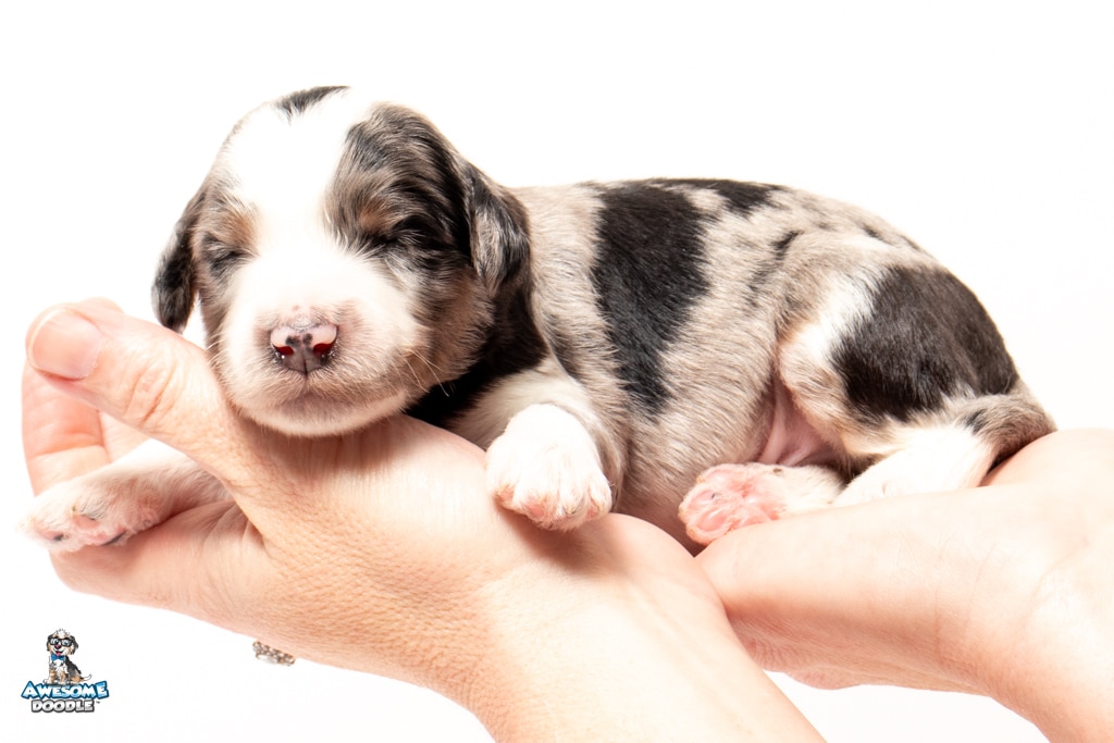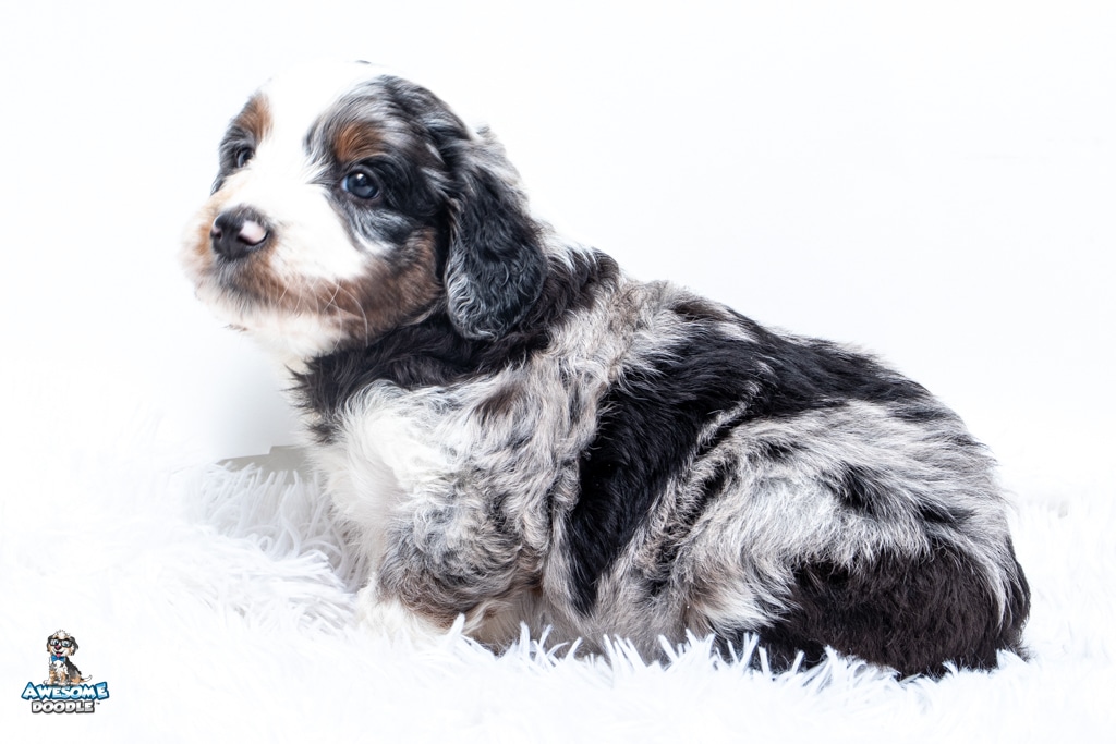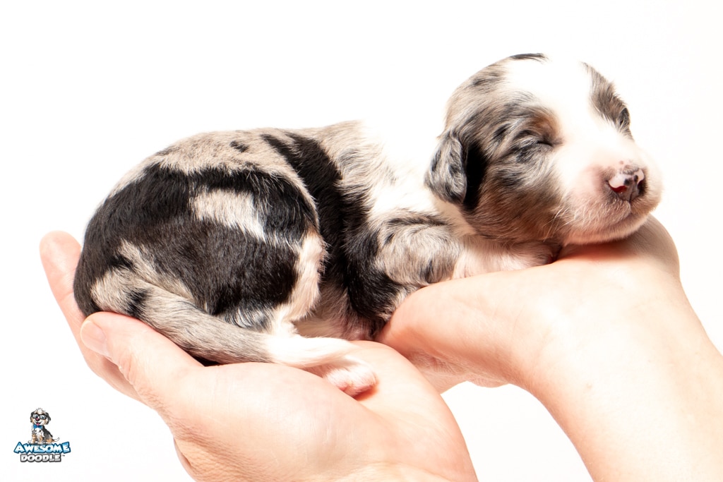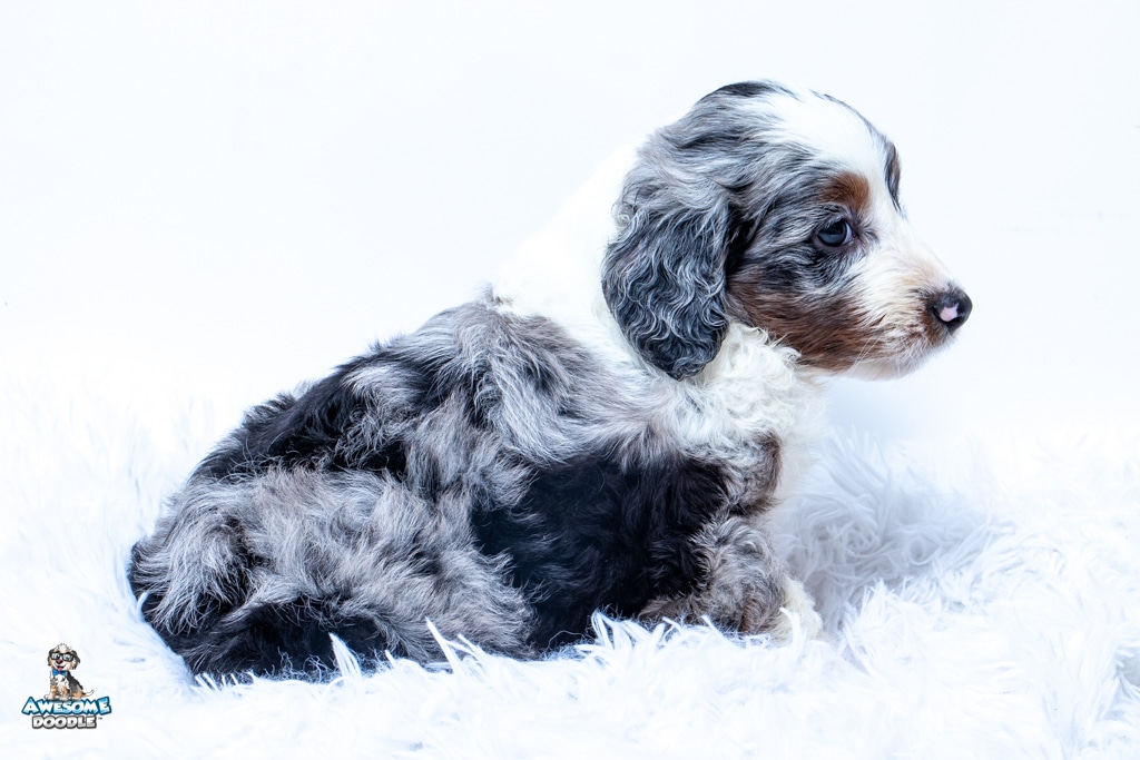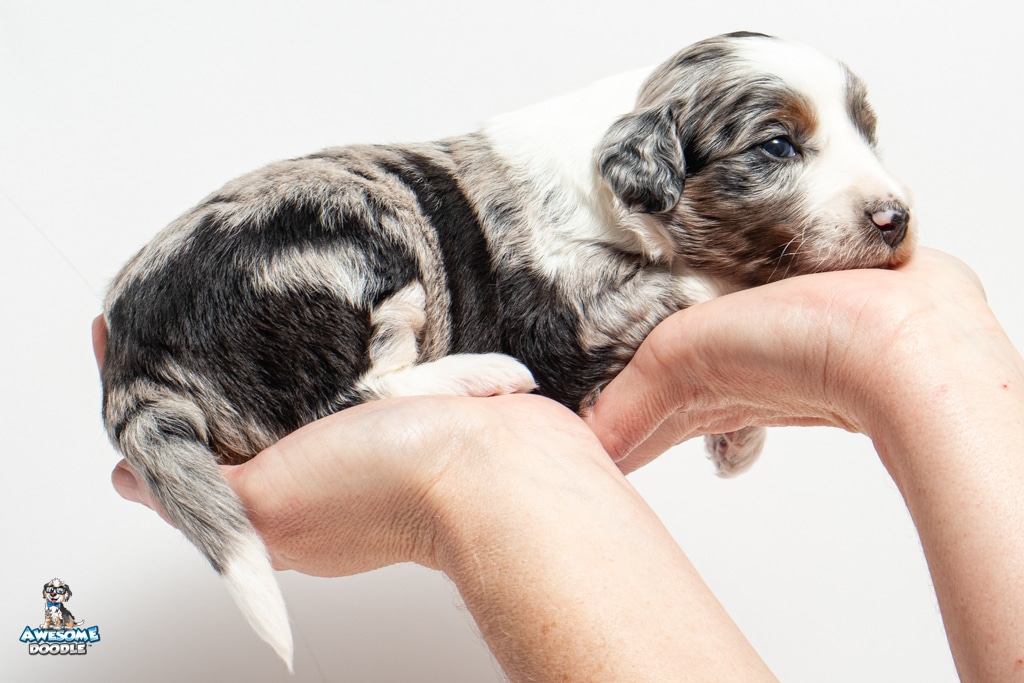 Archer is a male Blue Merle w/ White & Copper F1 AussieDoodle puppy.