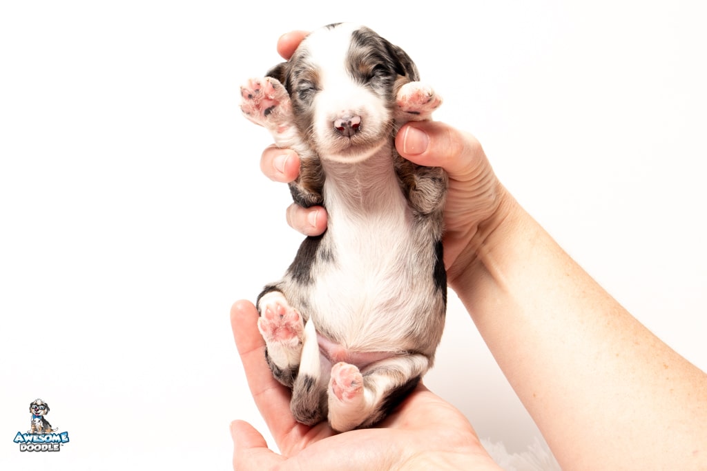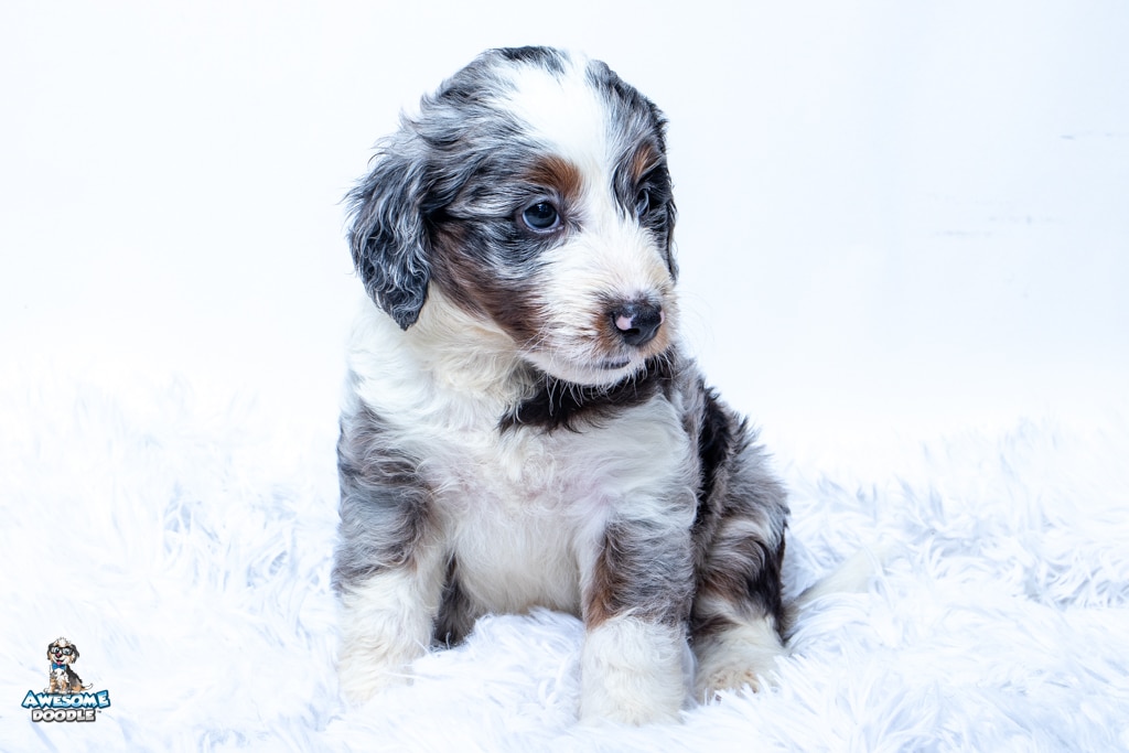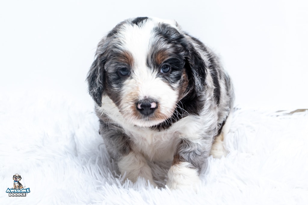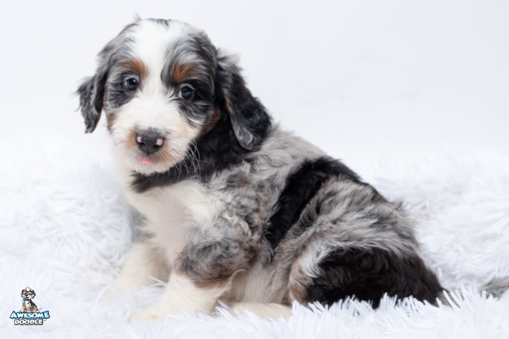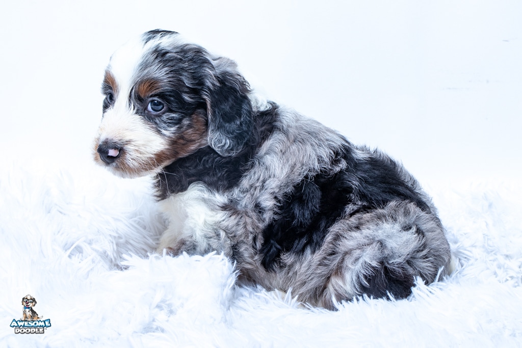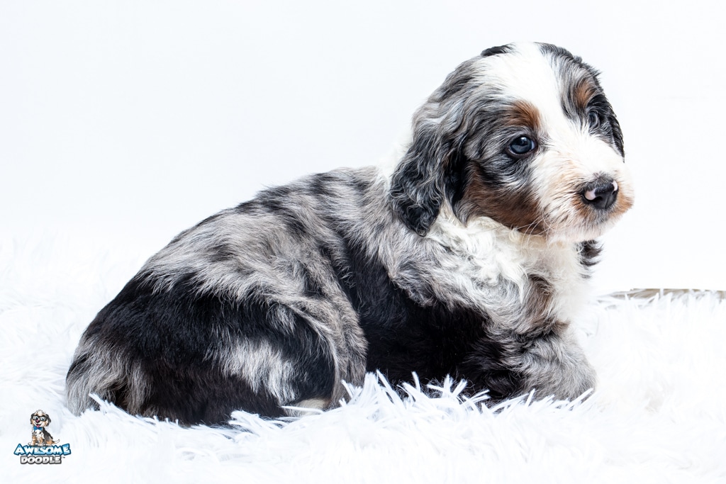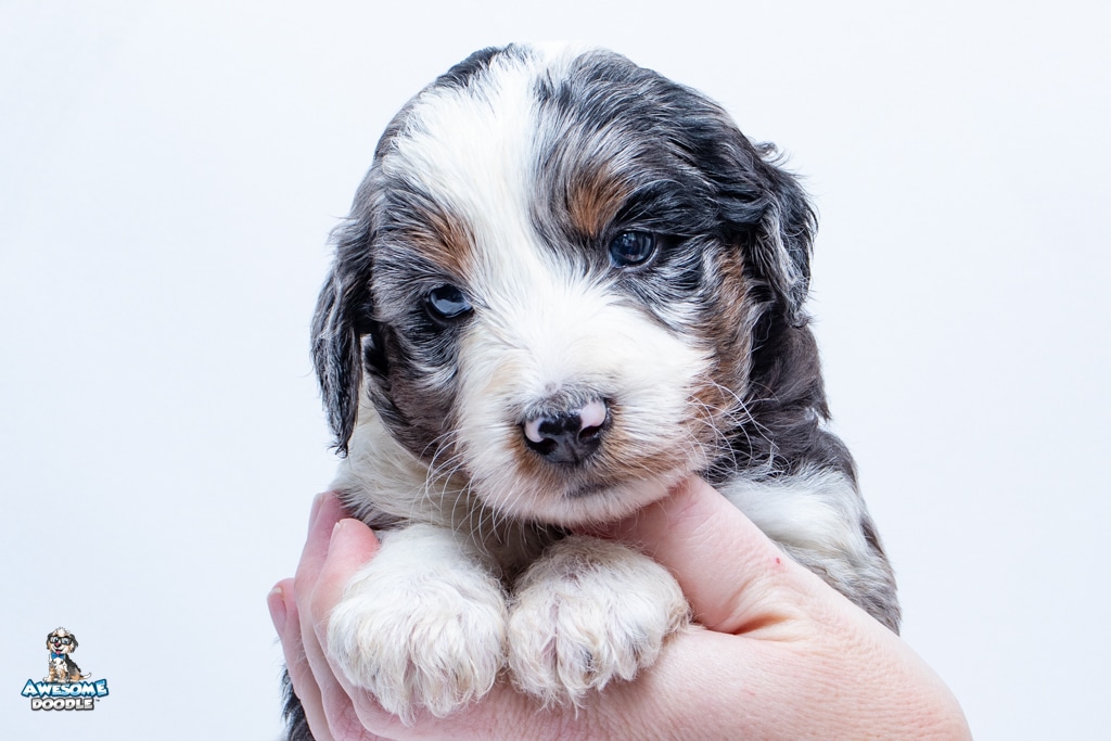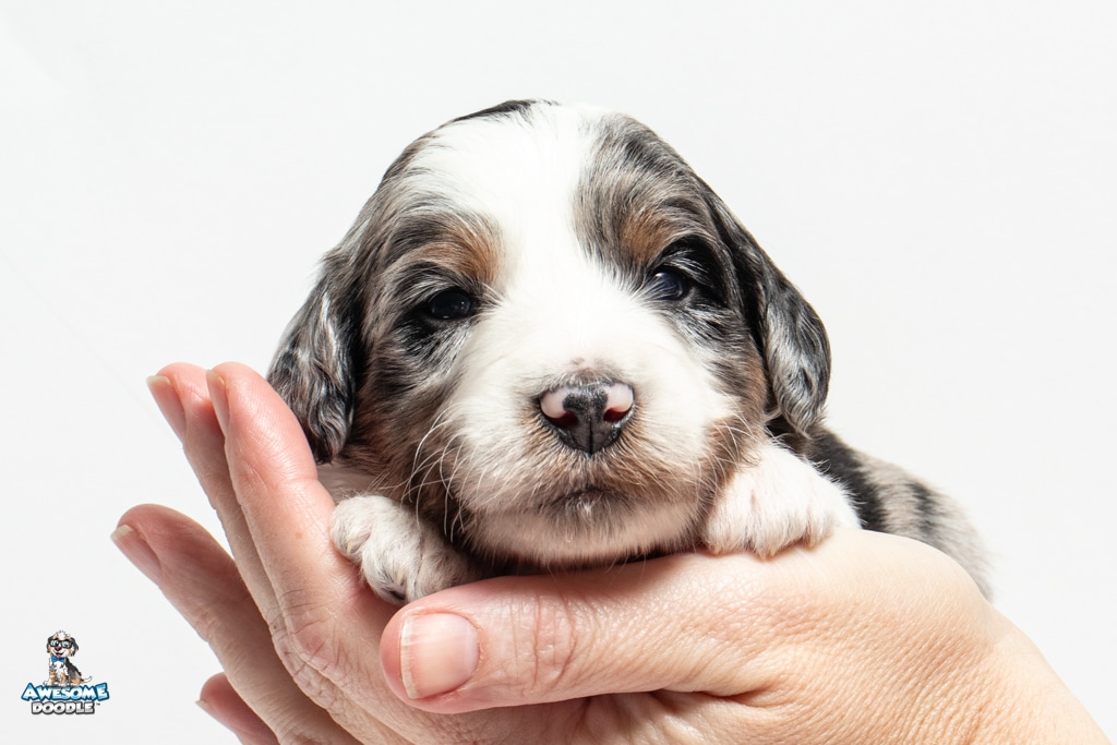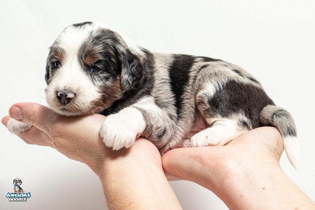 Archer is a male Blue Merle w/ White & Copper F1 AussieDoodle puppy.