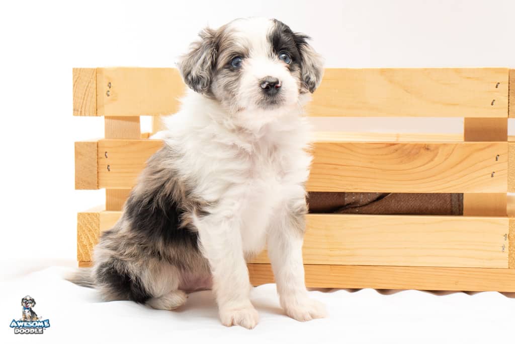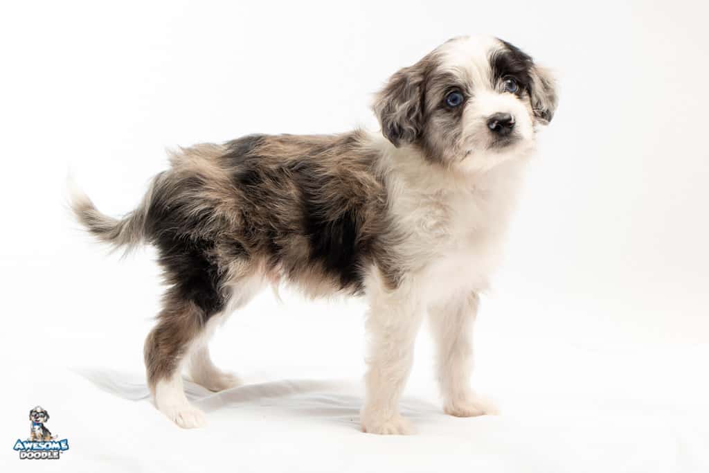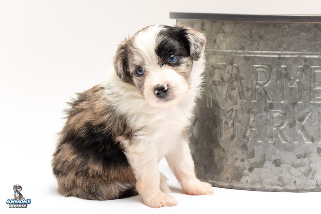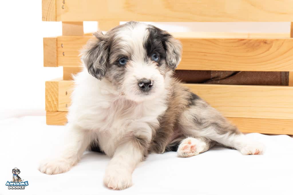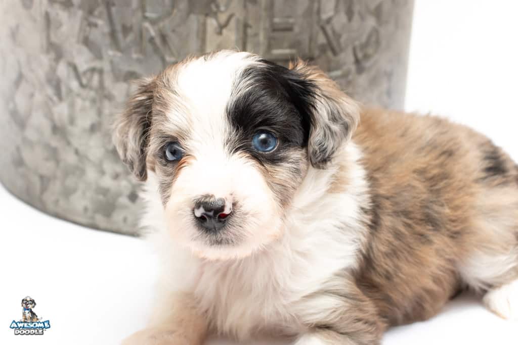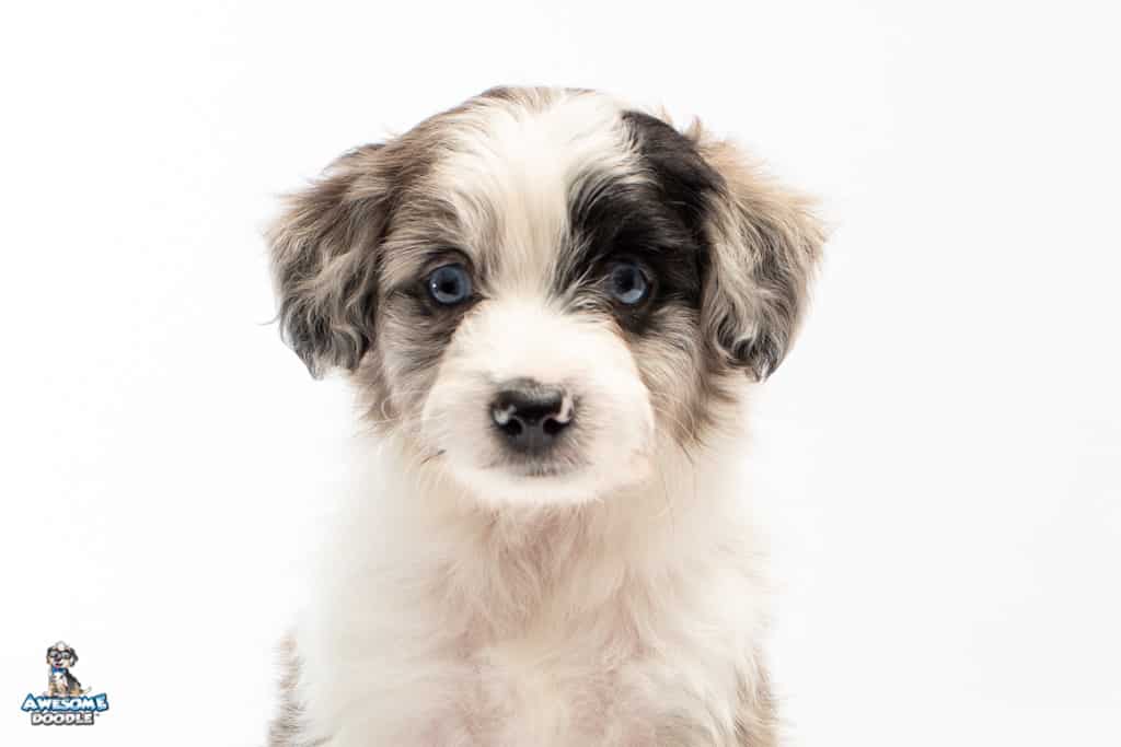 Boomer is a male Blue Merle w/White F1 AussieDoodle puppy.