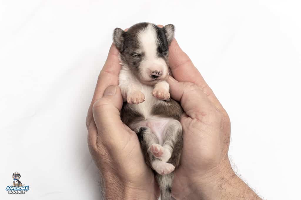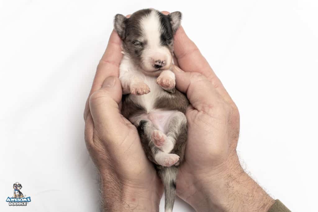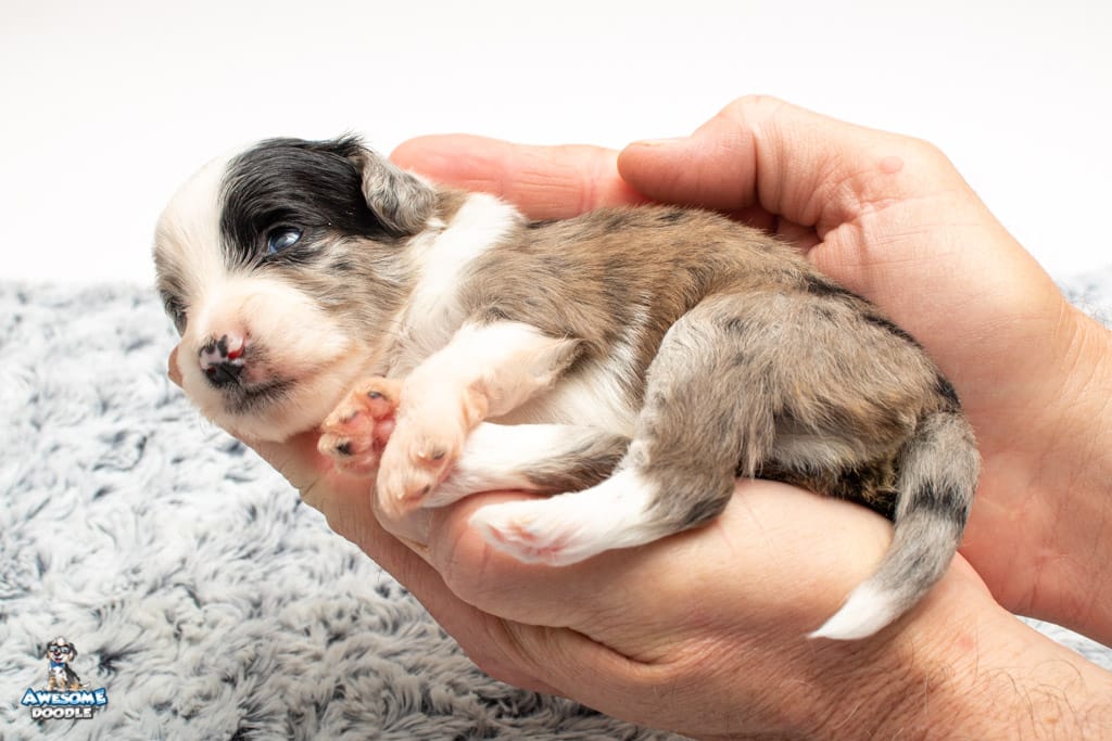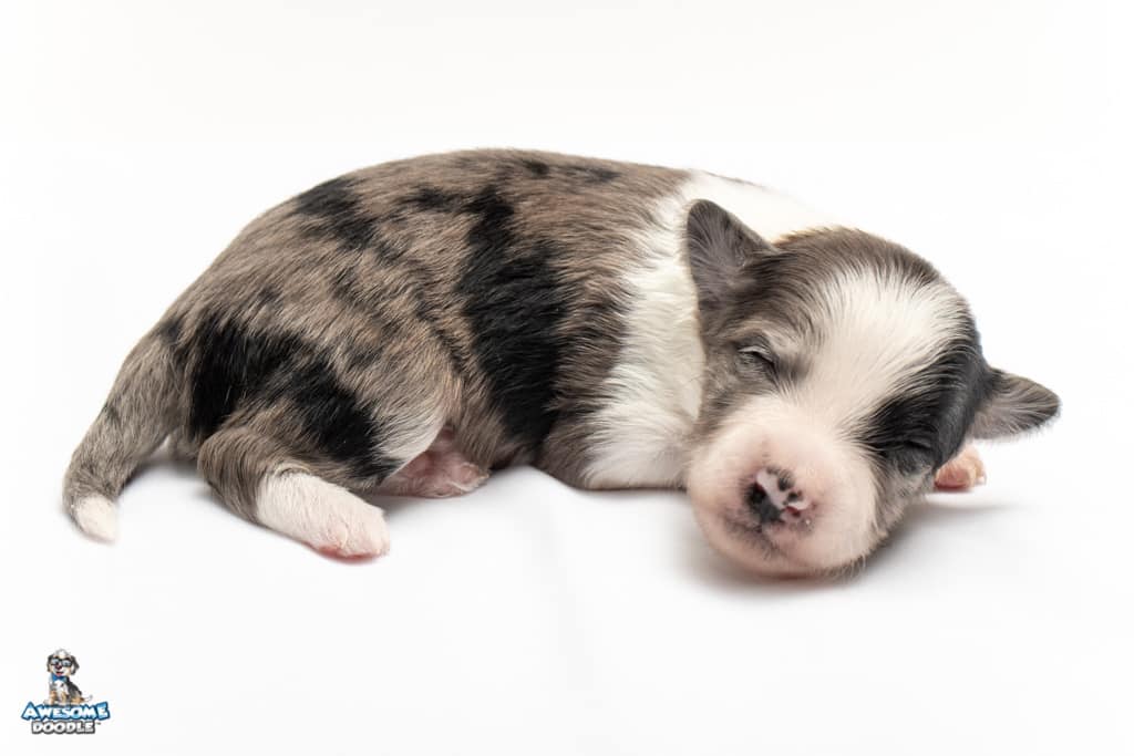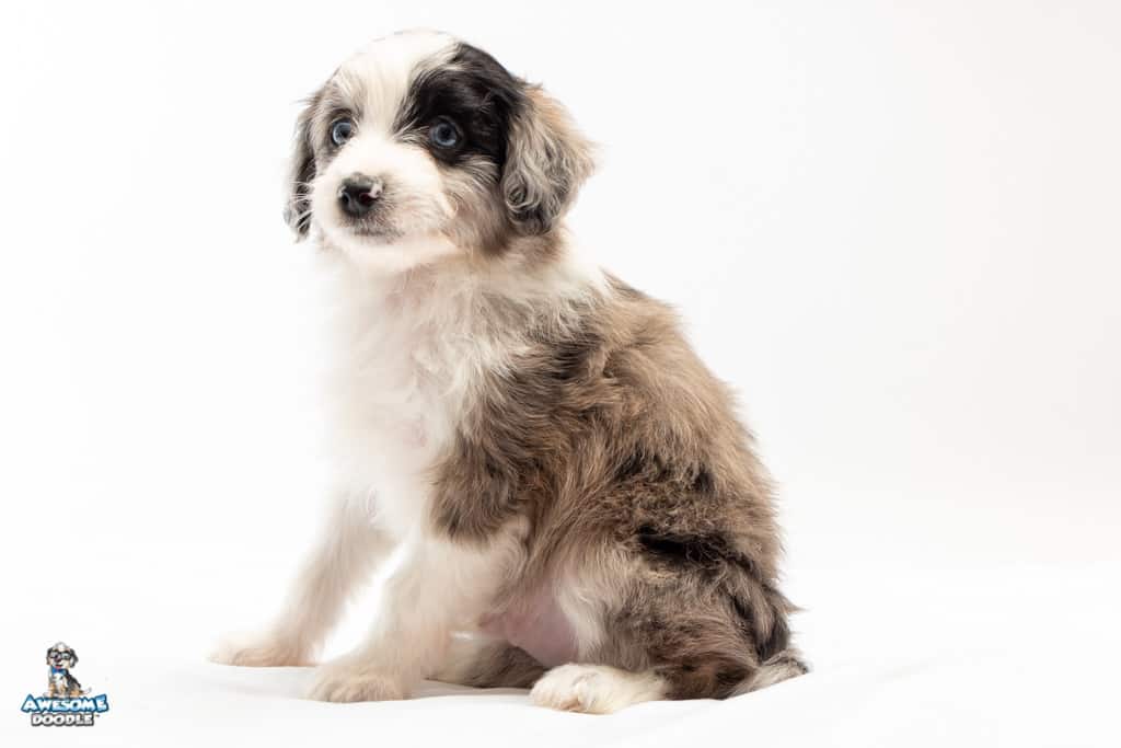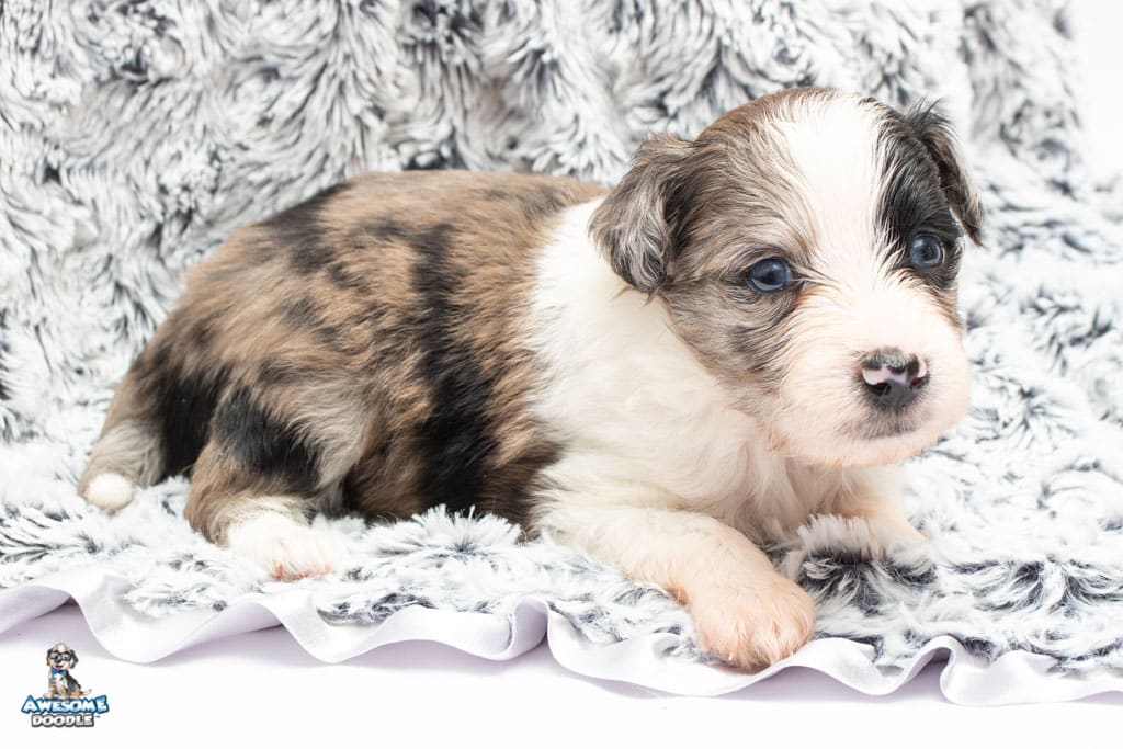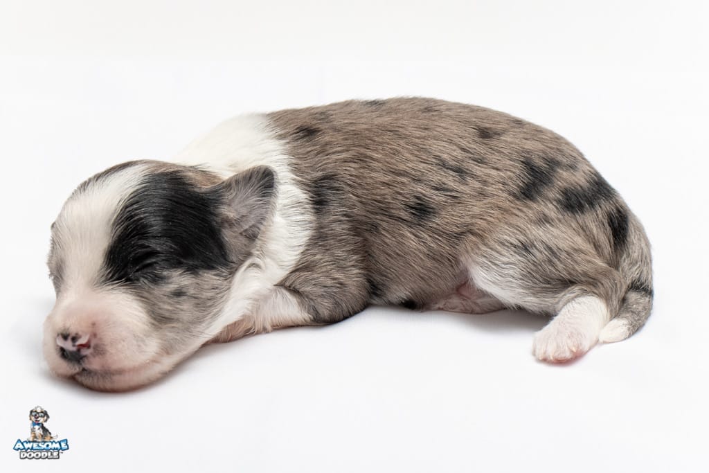 Boomer is a male Blue Merle w/White F1 AussieDoodle puppy.