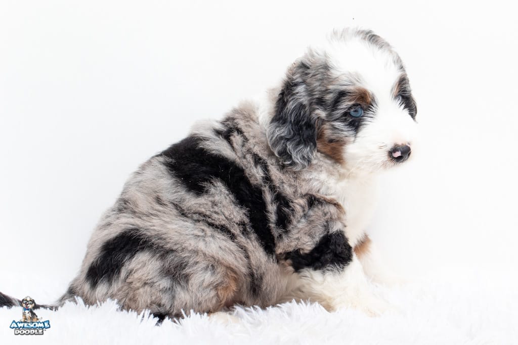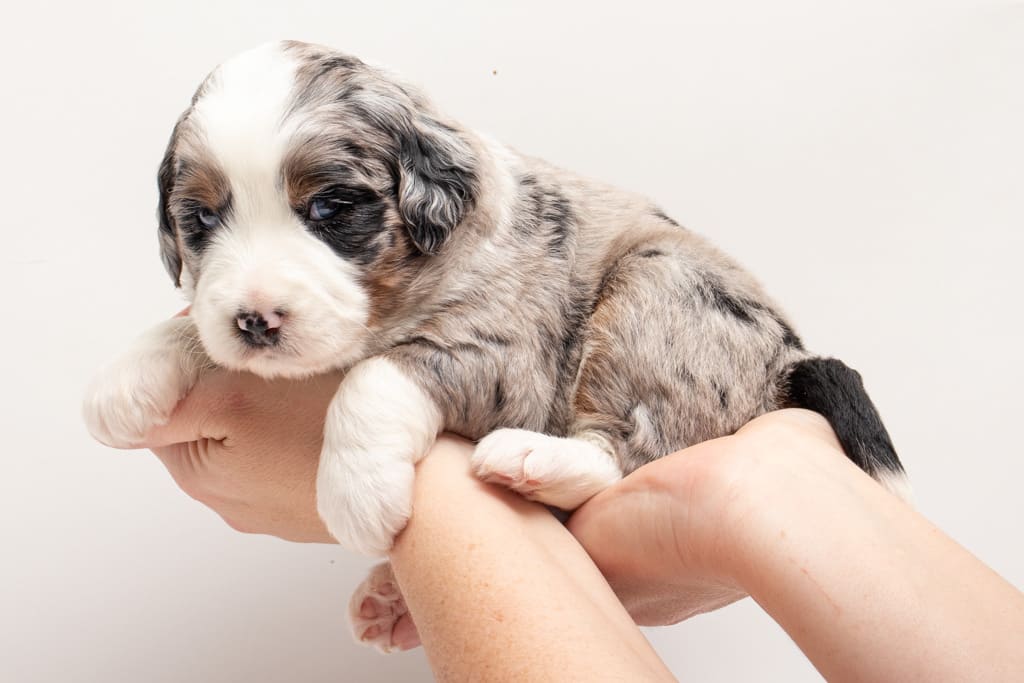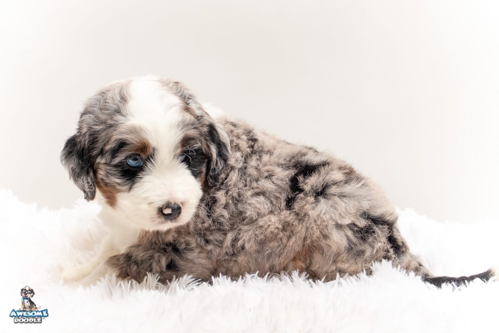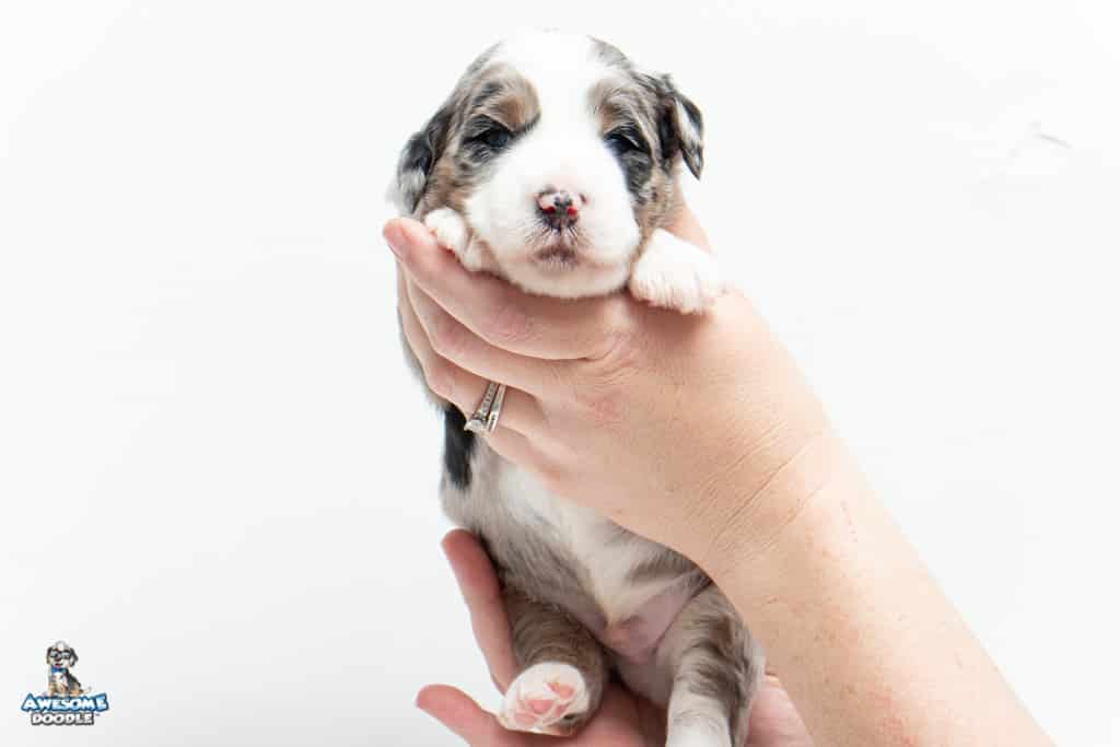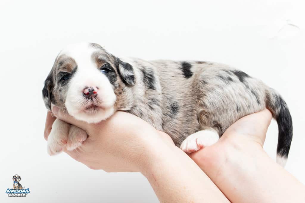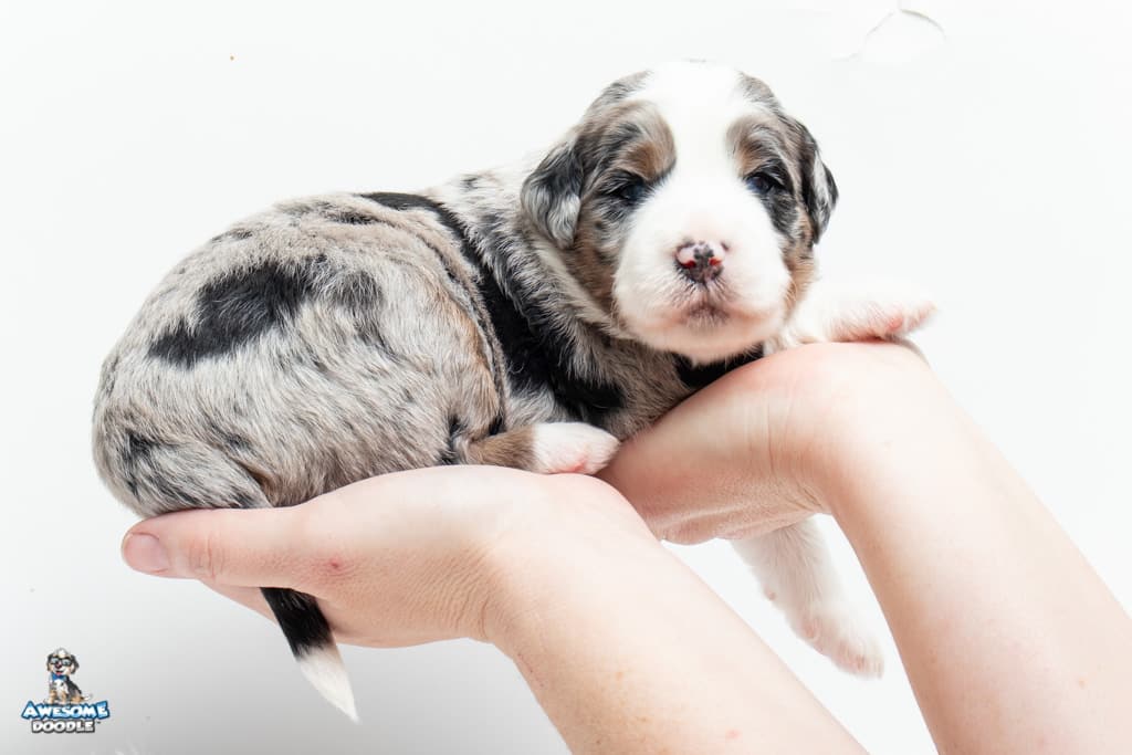 Oreo is a male Blue Merle w/ White & Copper F1 AussieDoodle puppy.