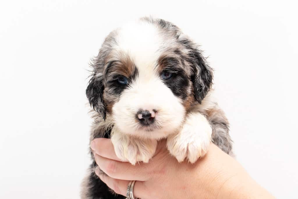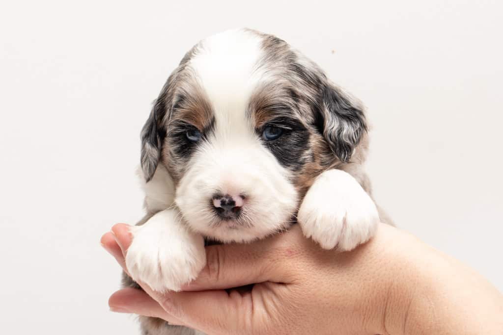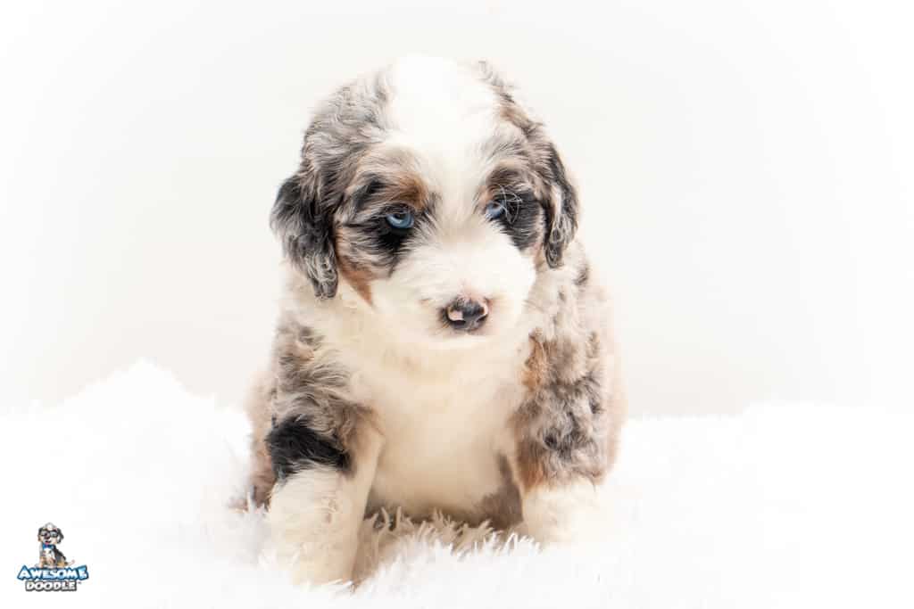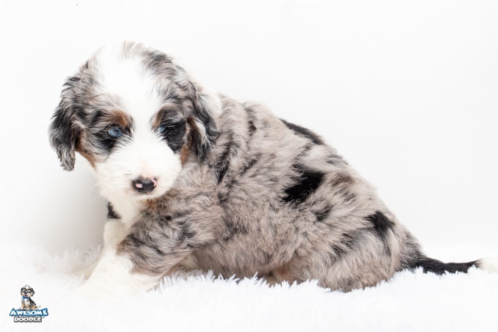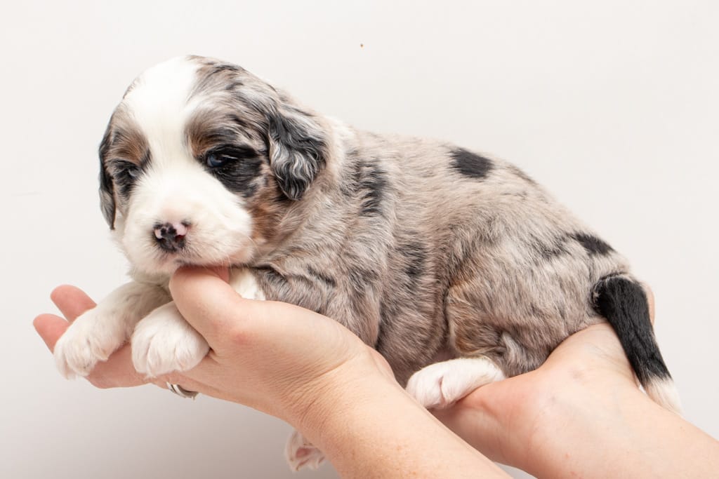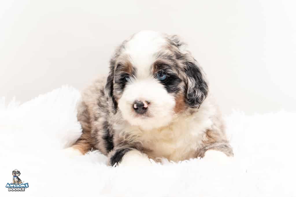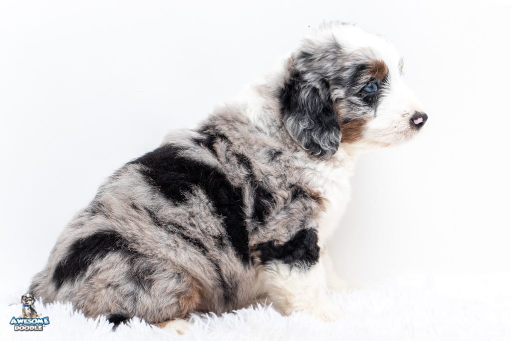 Oreo is a male Blue Merle w/ White & Copper F1 AussieDoodle puppy.