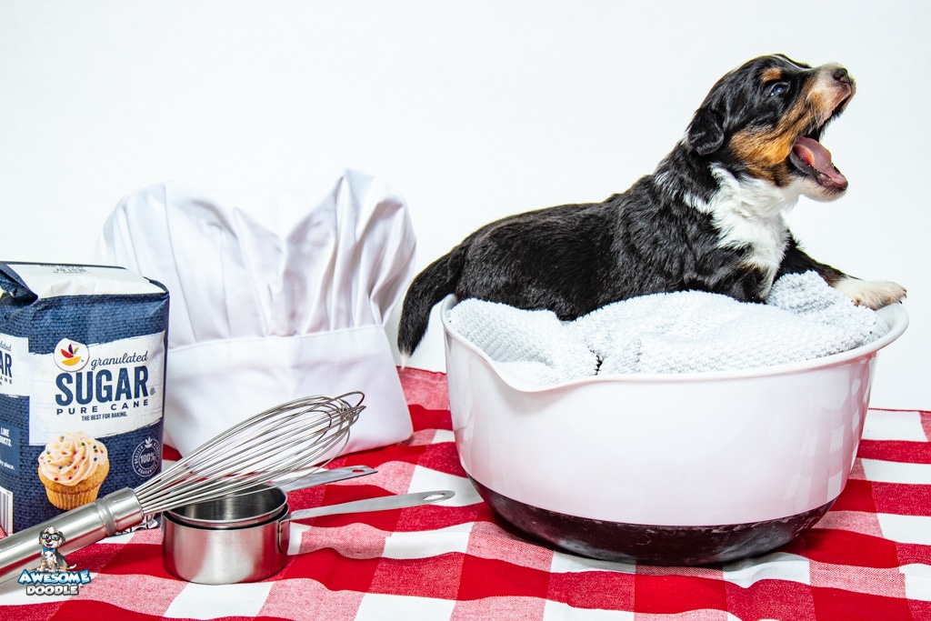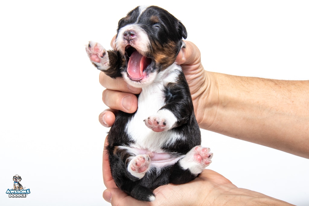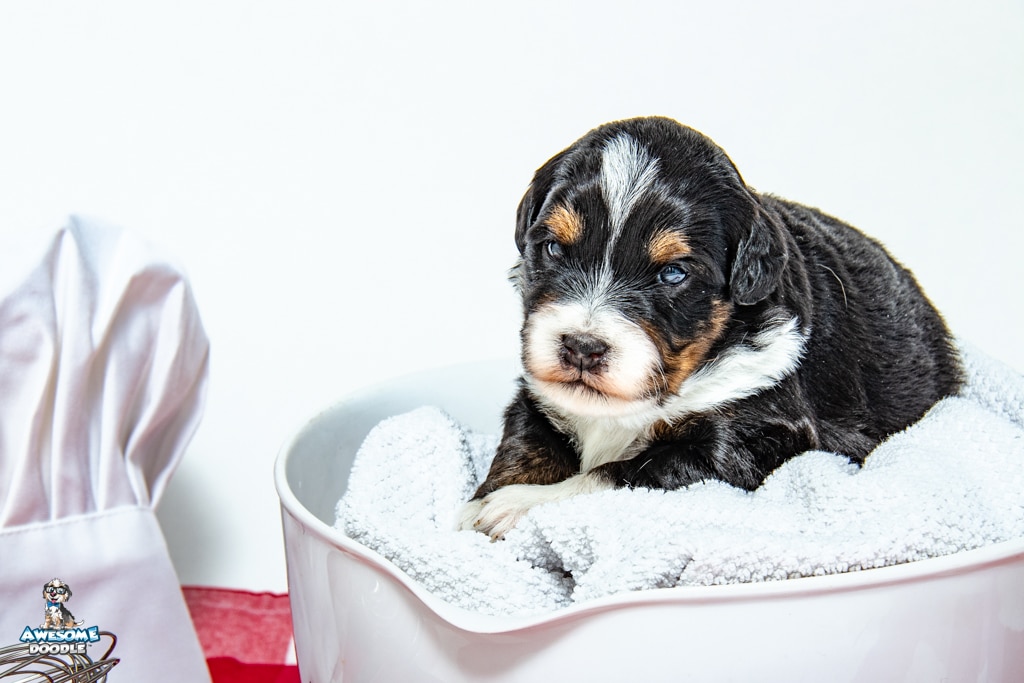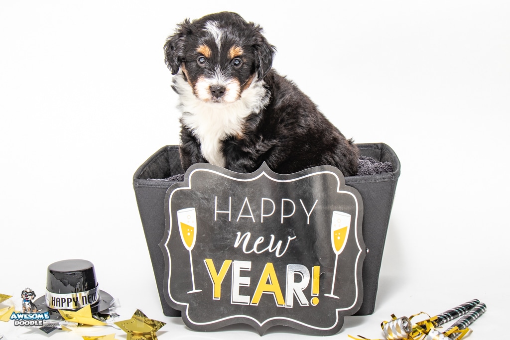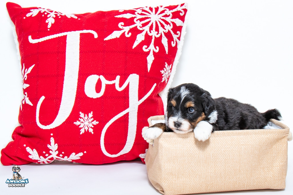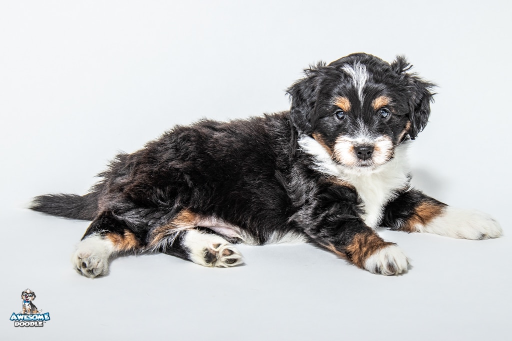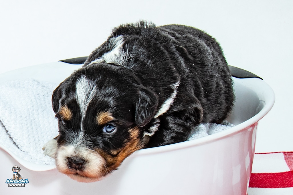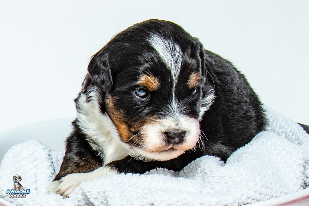 Tuck is a male Black Tri-Color F1 AussieDoodle puppy.