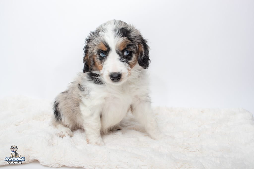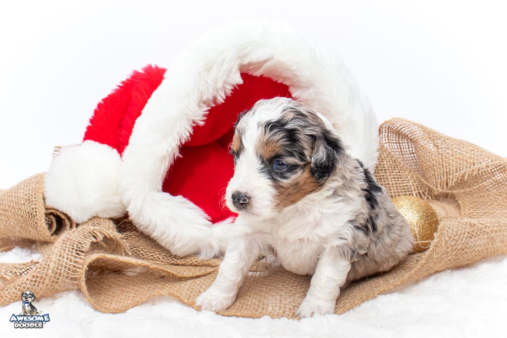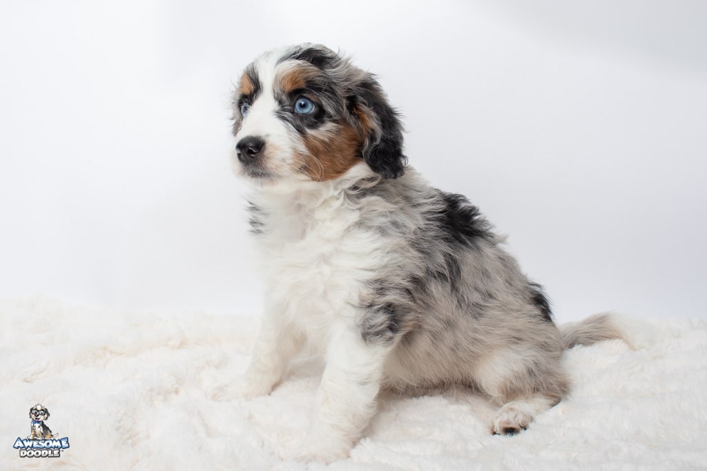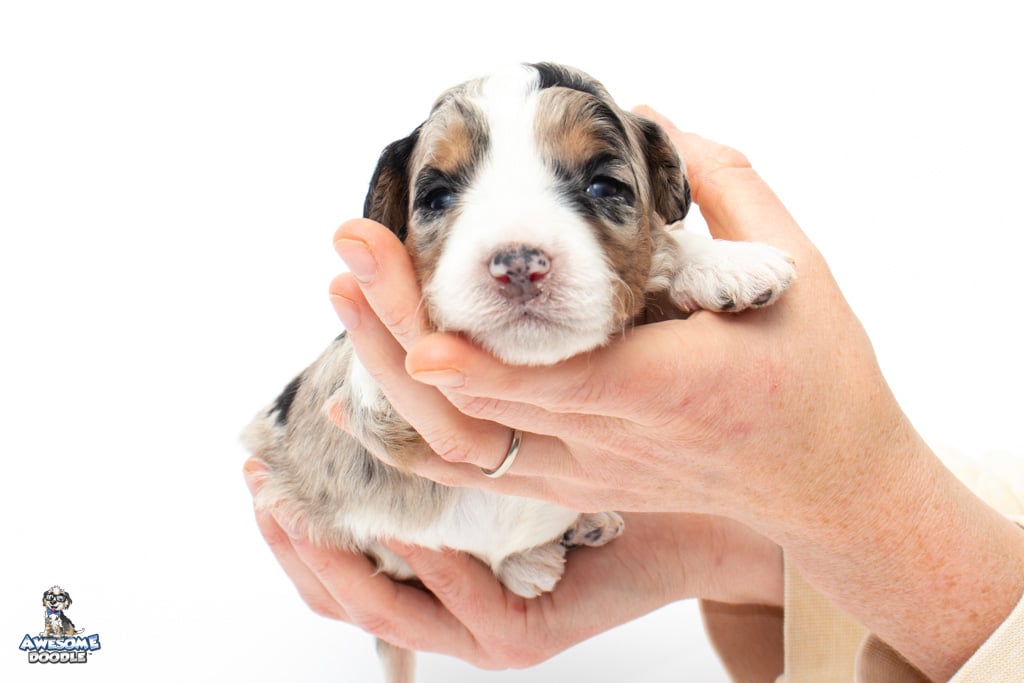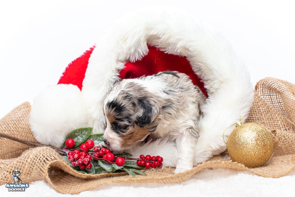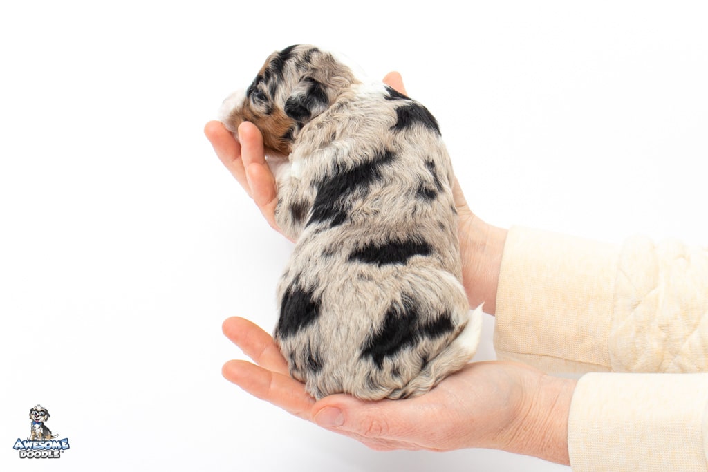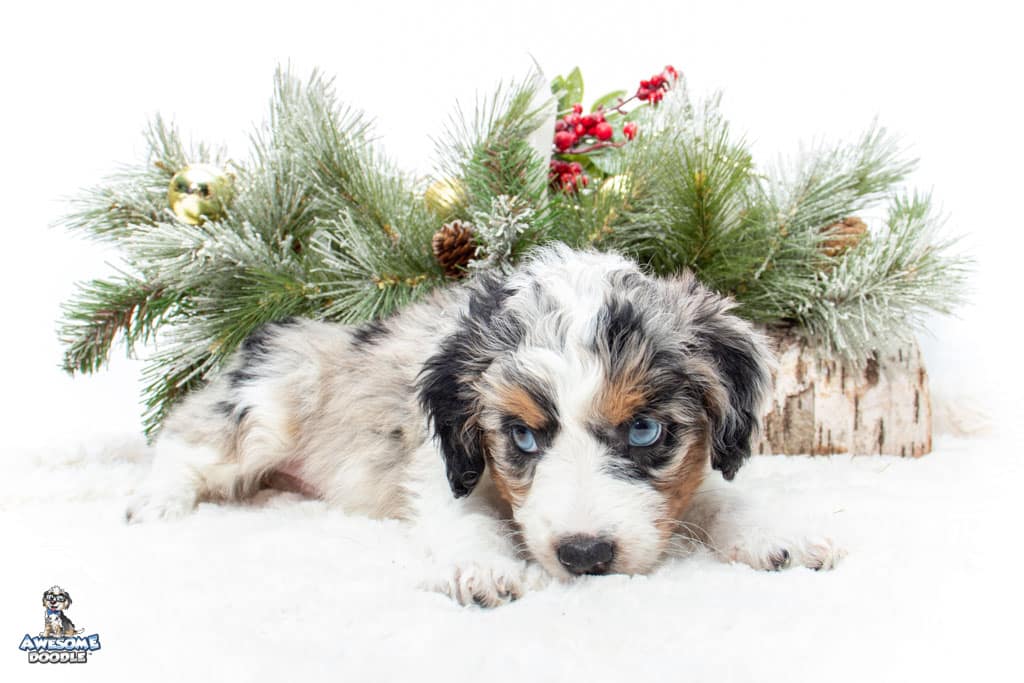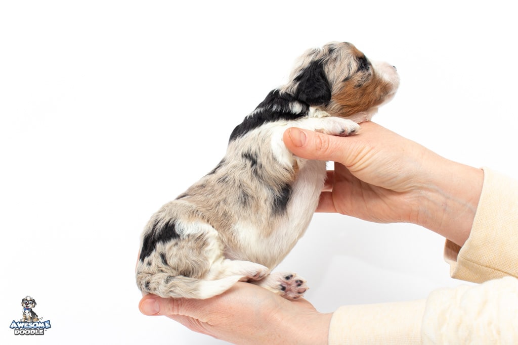 Celeste is a female Blue Merle w/ White & Copper F1 AussieDoodle puppy.