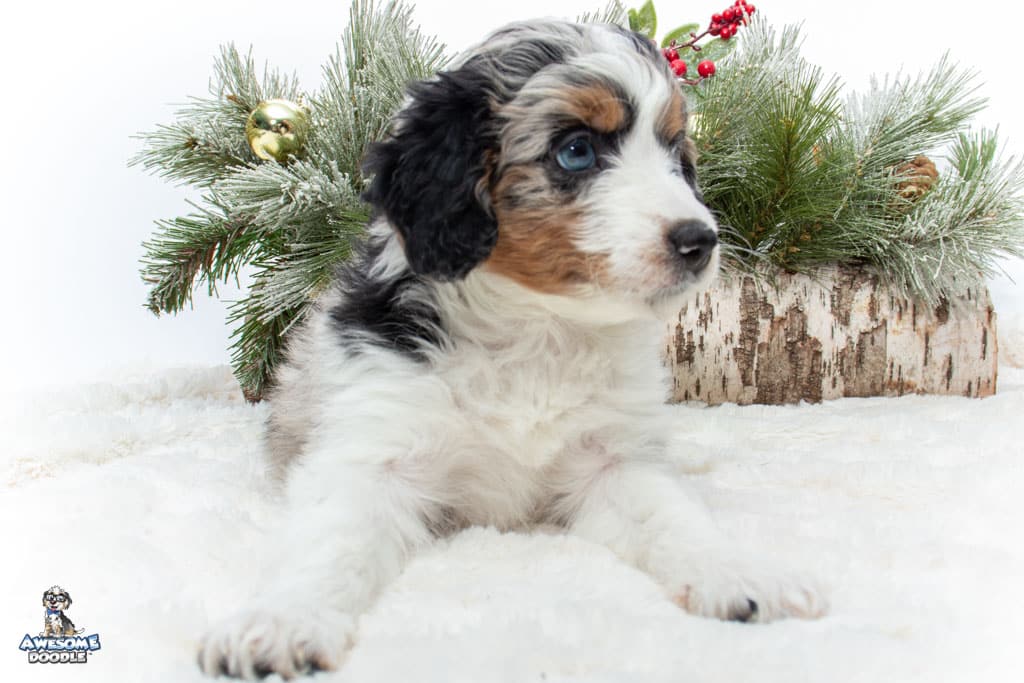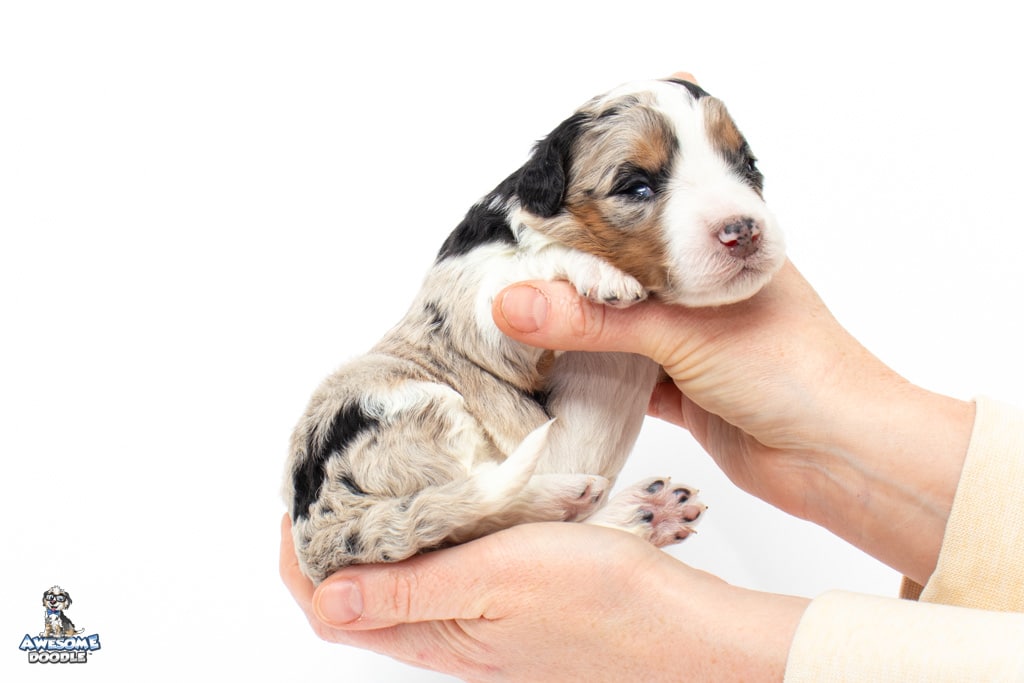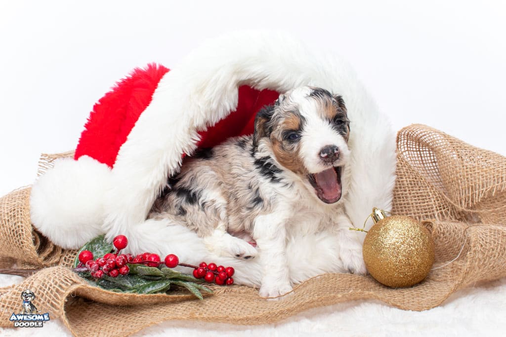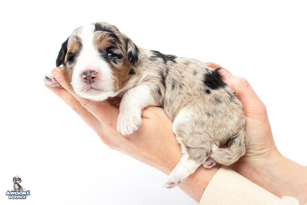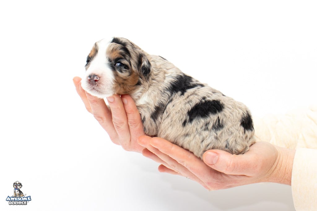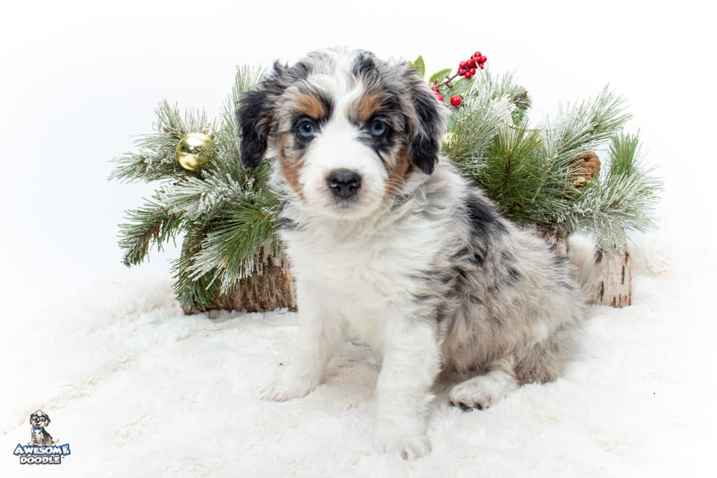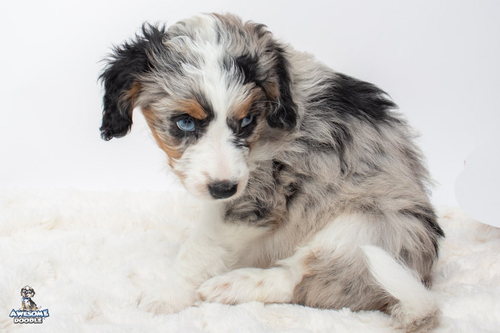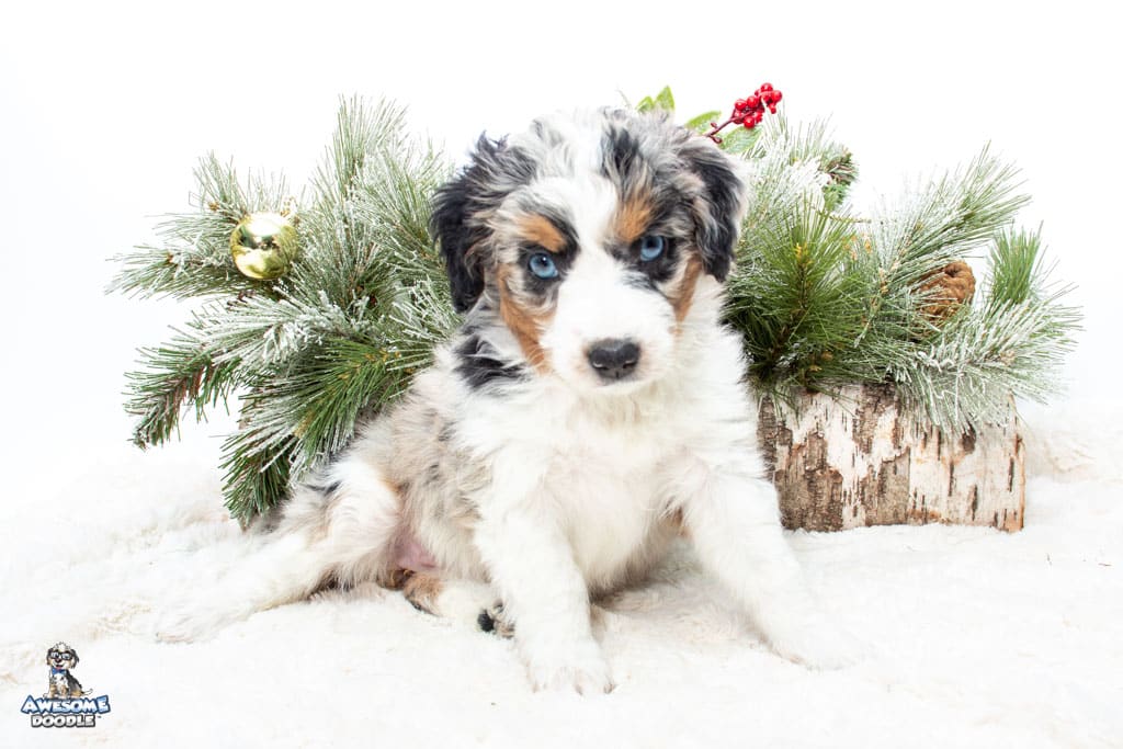 Celeste is a female Blue Merle w/ White & Copper F1 AussieDoodle puppy.