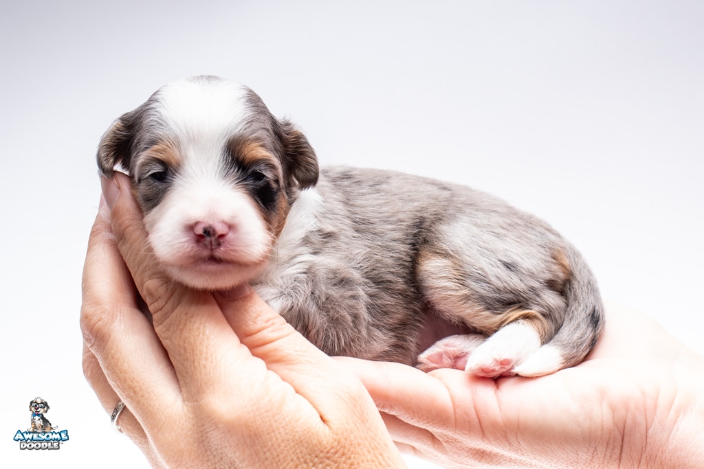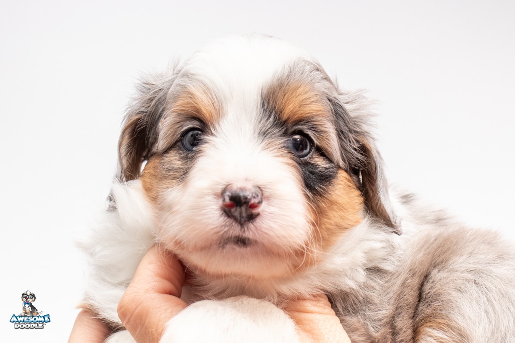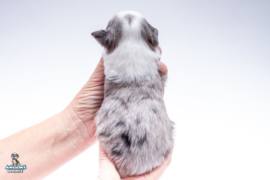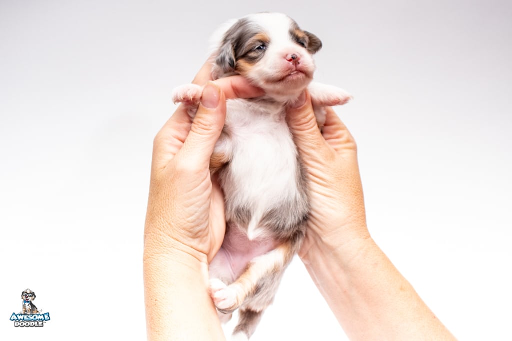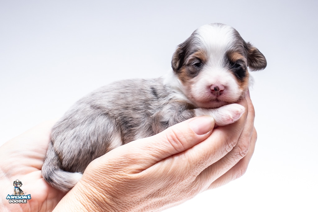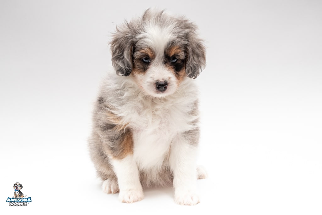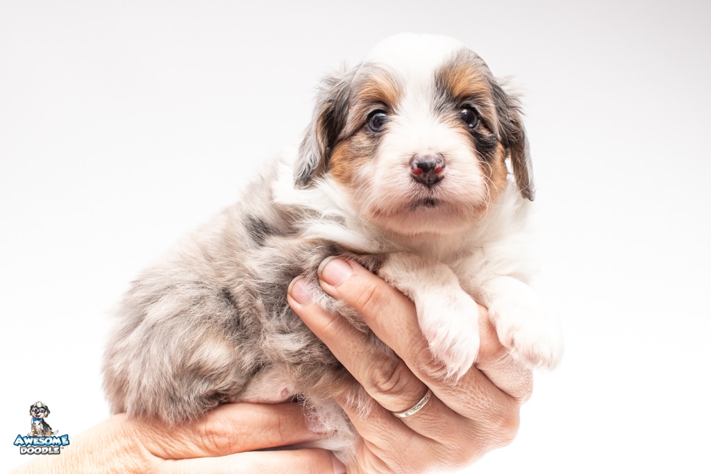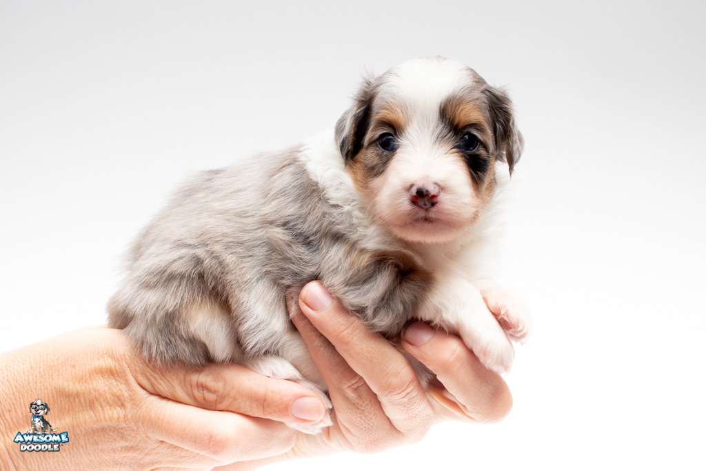 Blu is a female Blue Merle w/ White & Copper F1 AussieDoodle puppy.