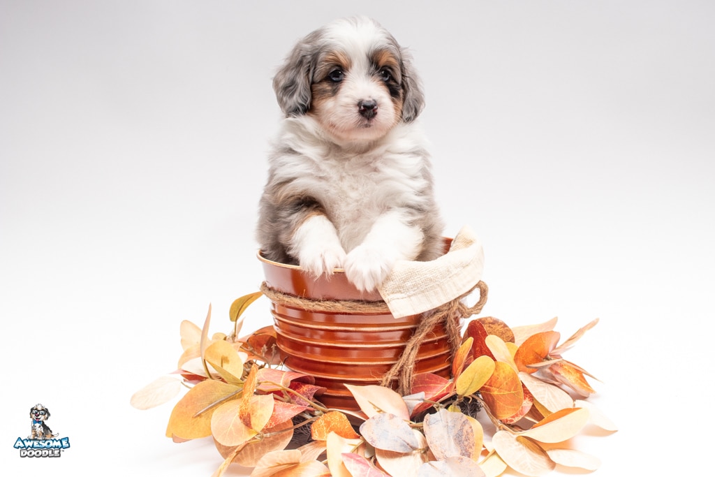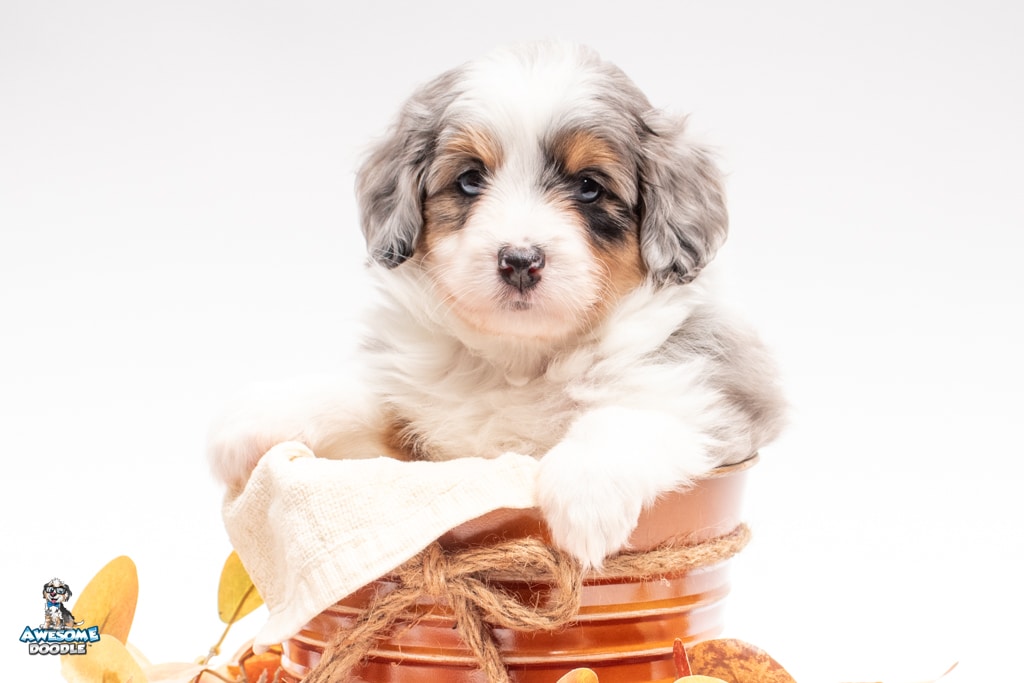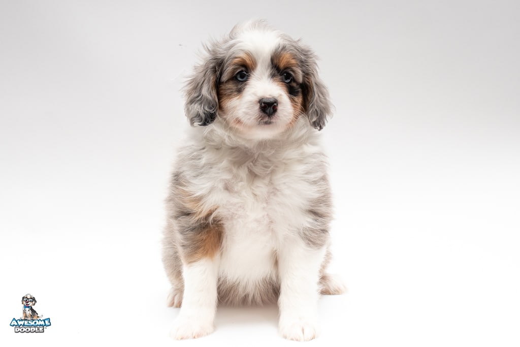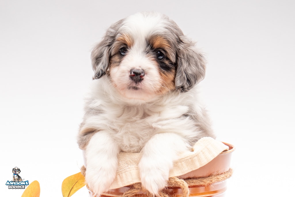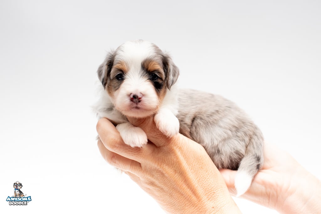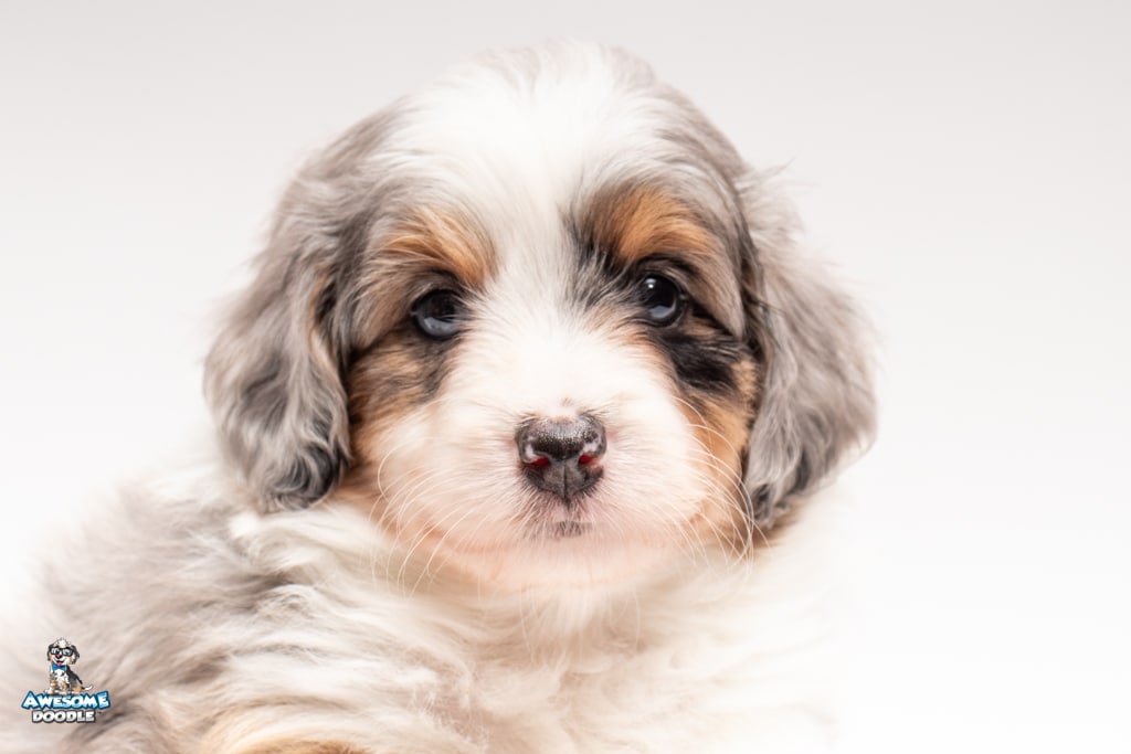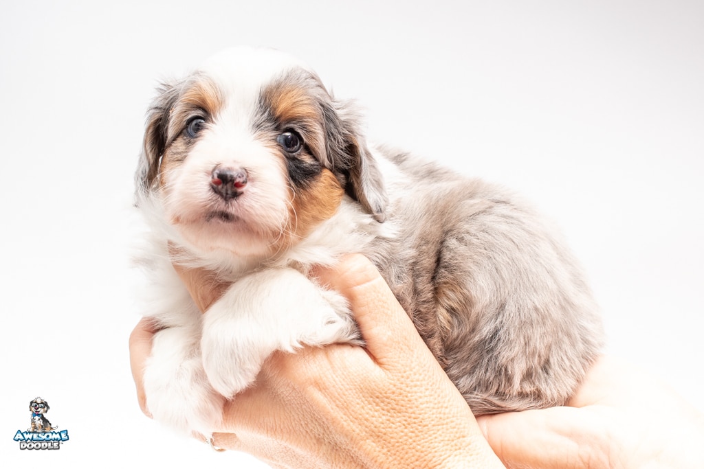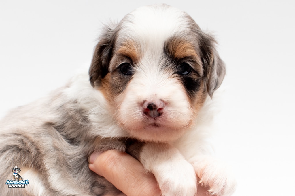 Blu is a female Blue Merle w/ White & Copper F1 AussieDoodle puppy.