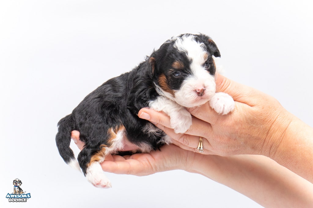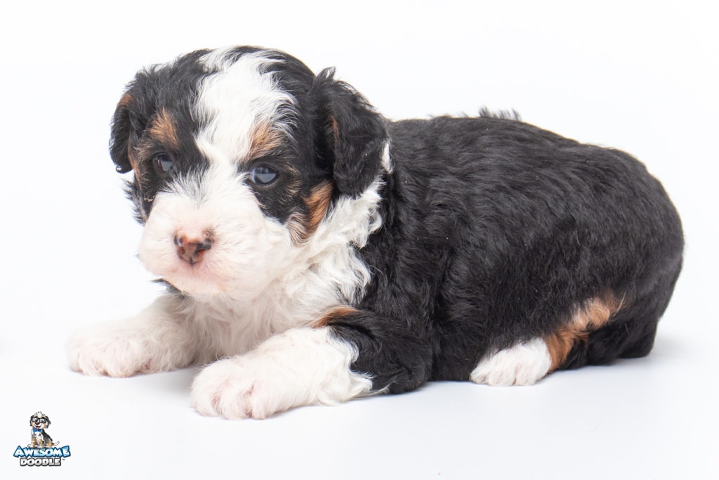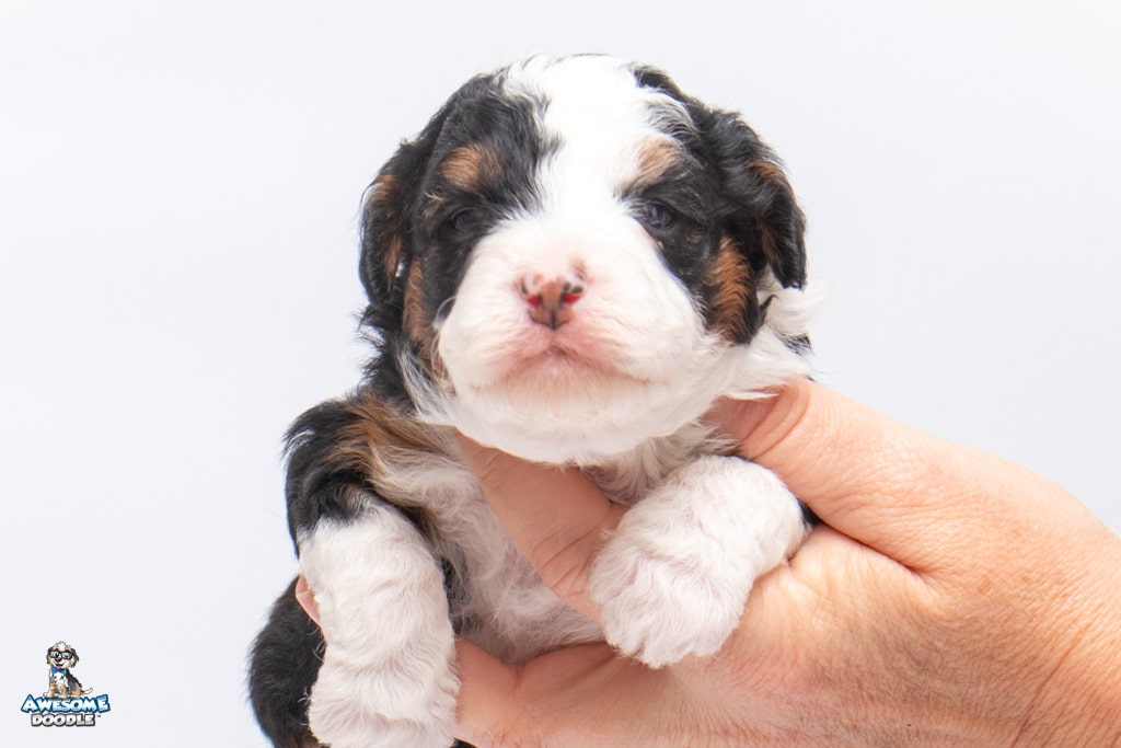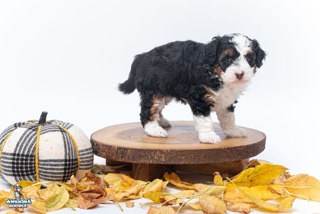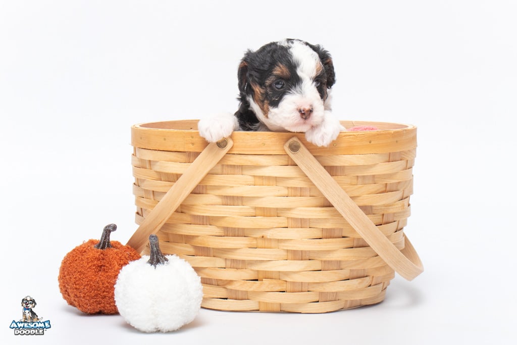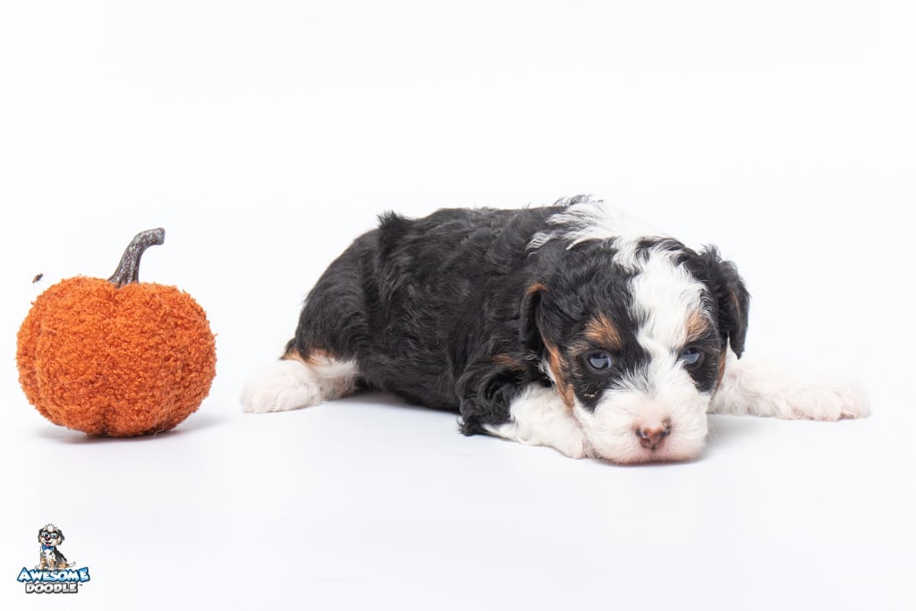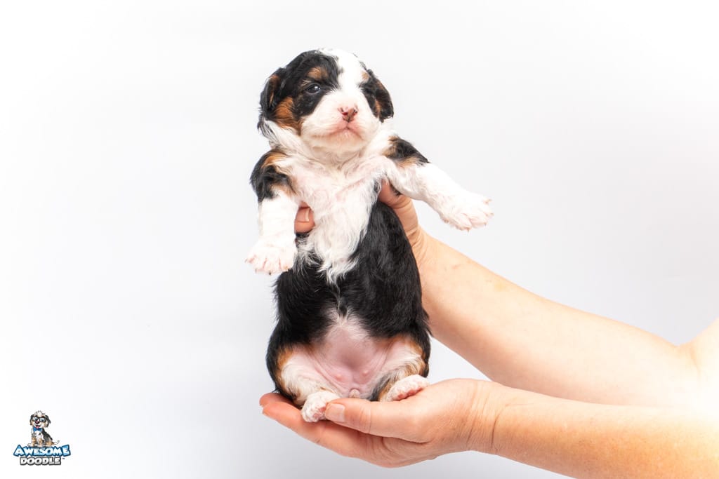 Cider is a female Black Tri-Color F1 AussieDoodle puppy.