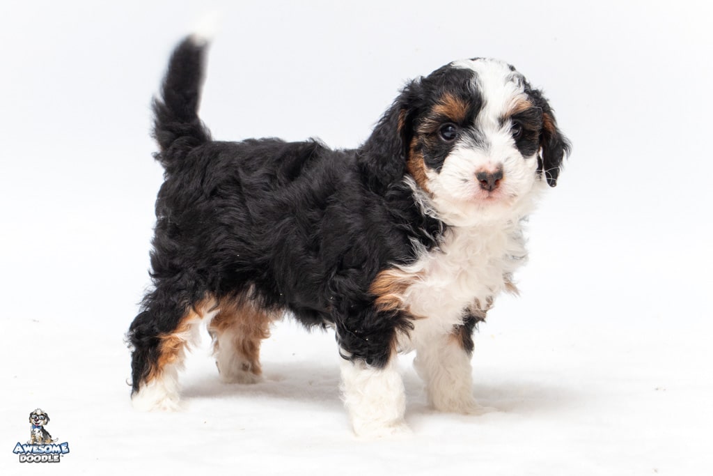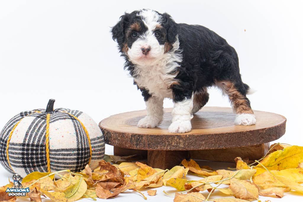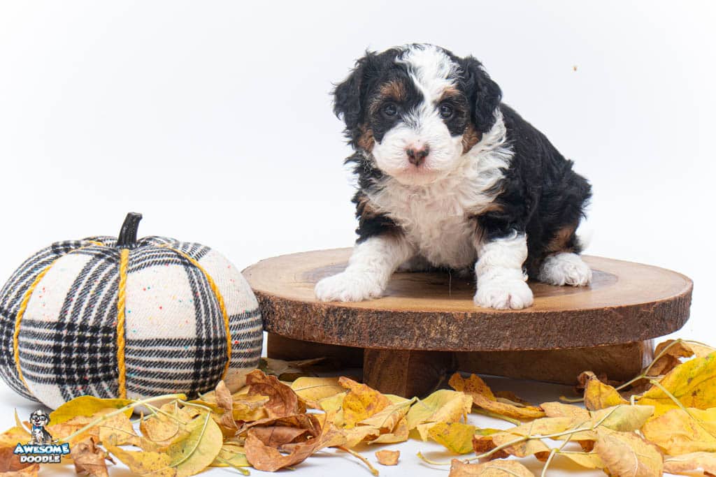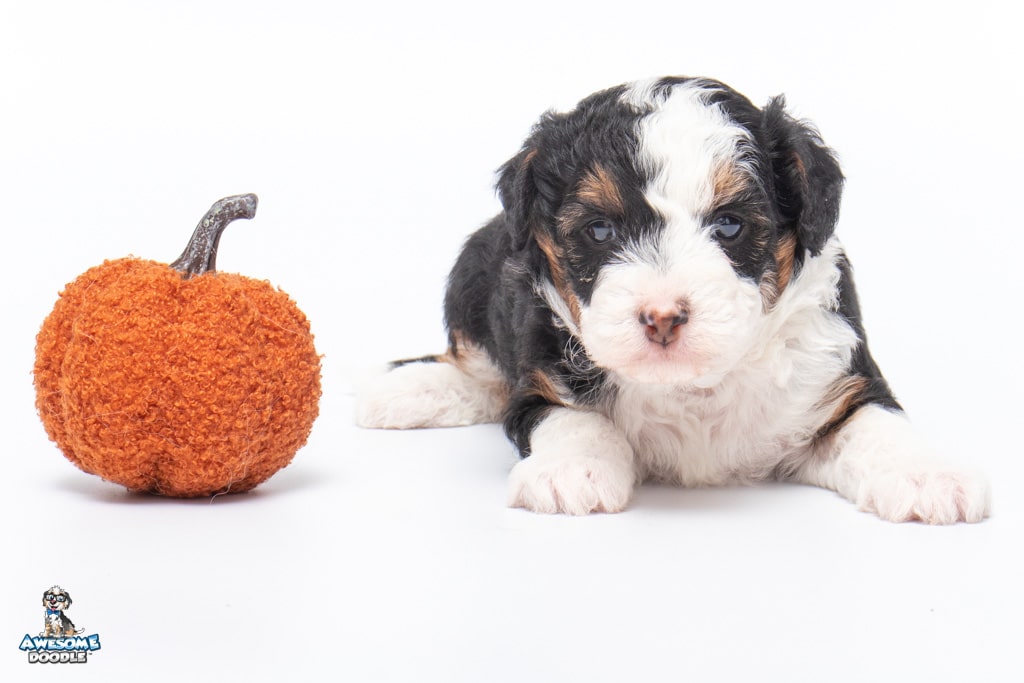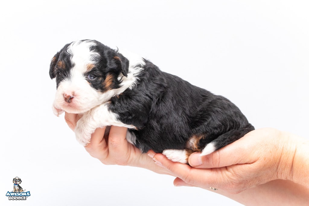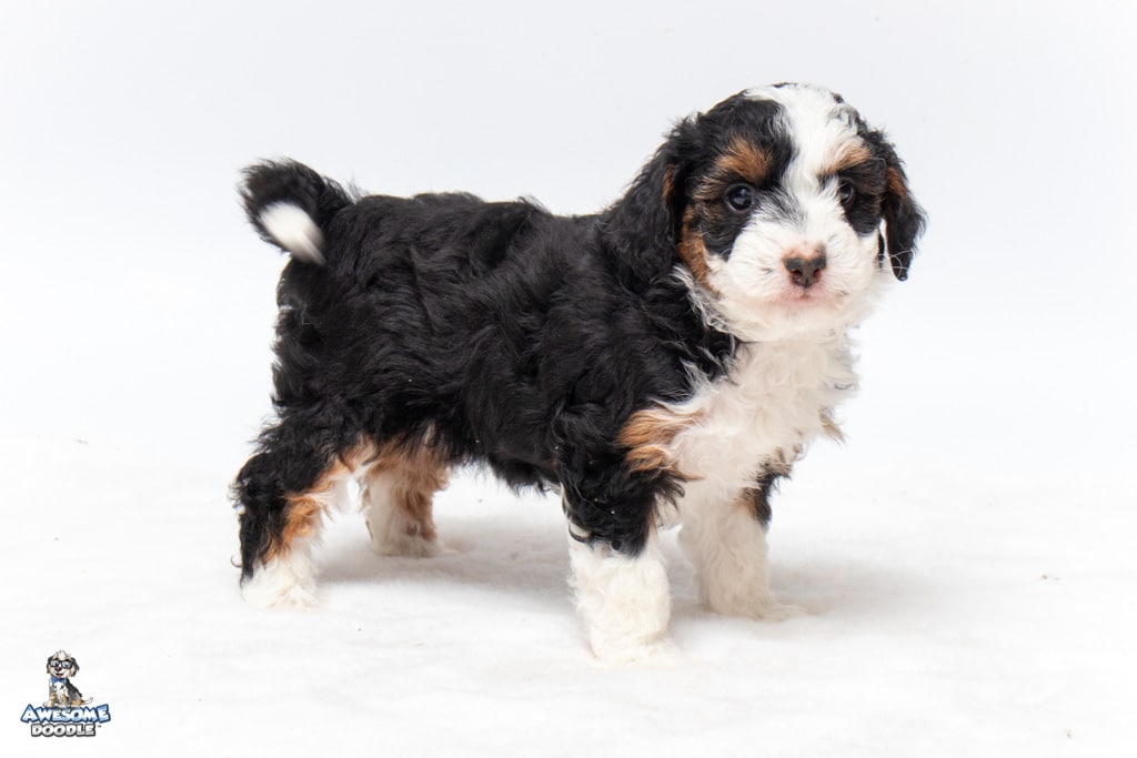 Cider is a female Black Tri-Color F1 AussieDoodle puppy.