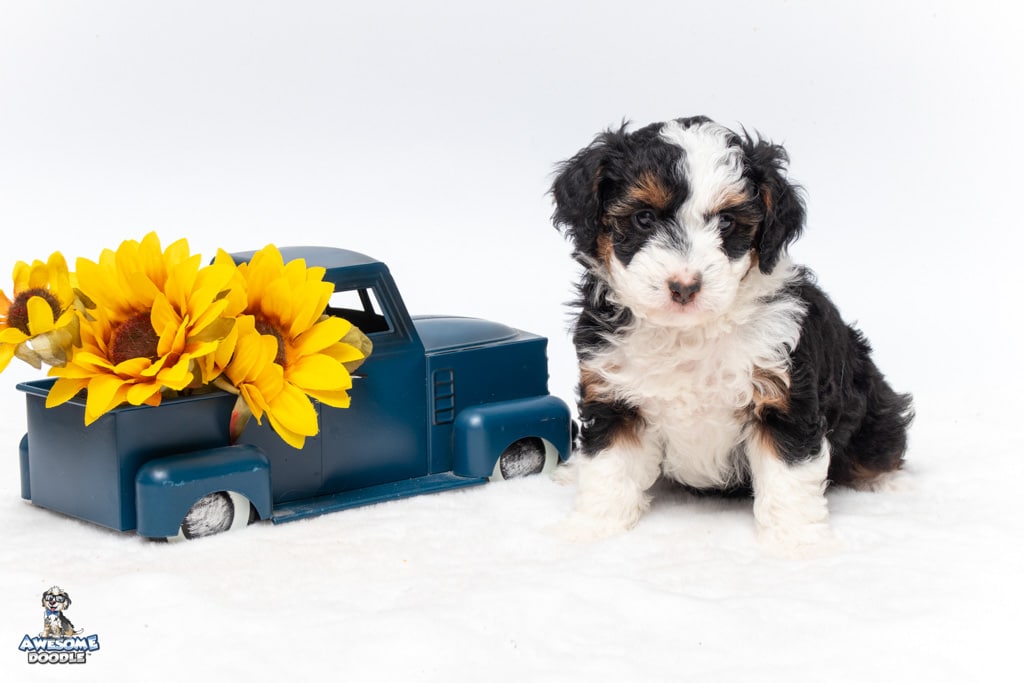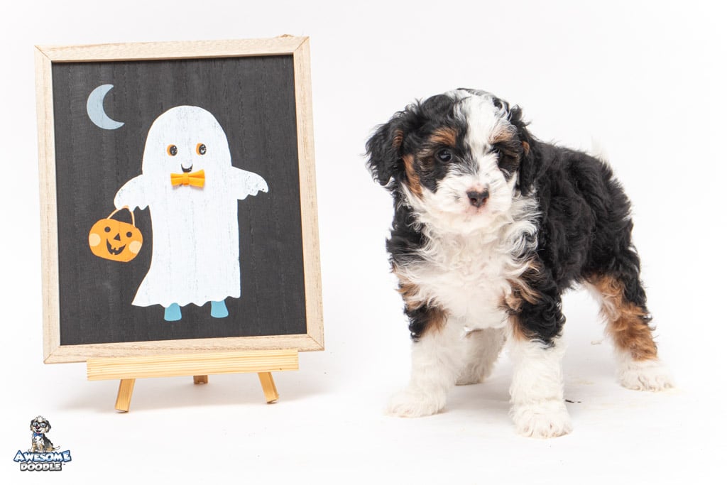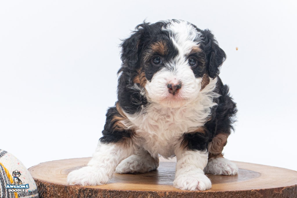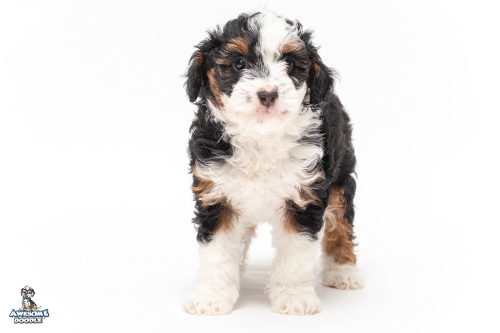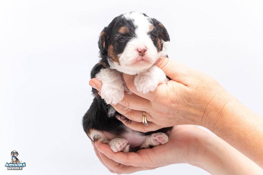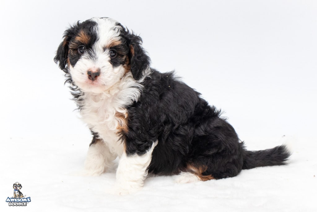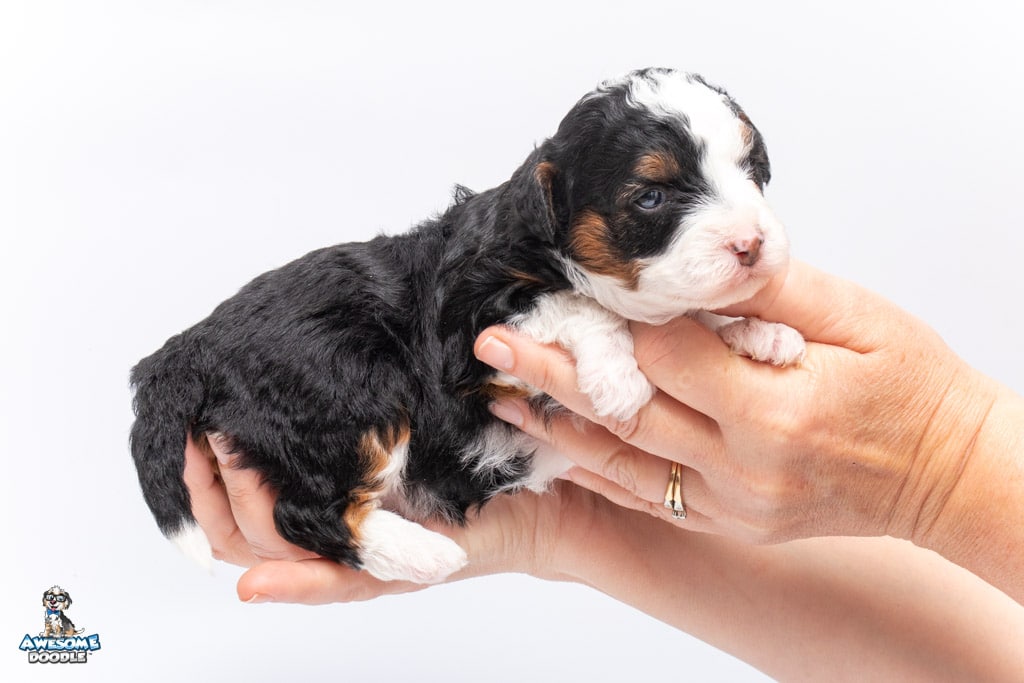 Cider is a female Black Tri-Color F1 AussieDoodle puppy.