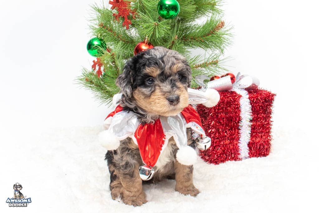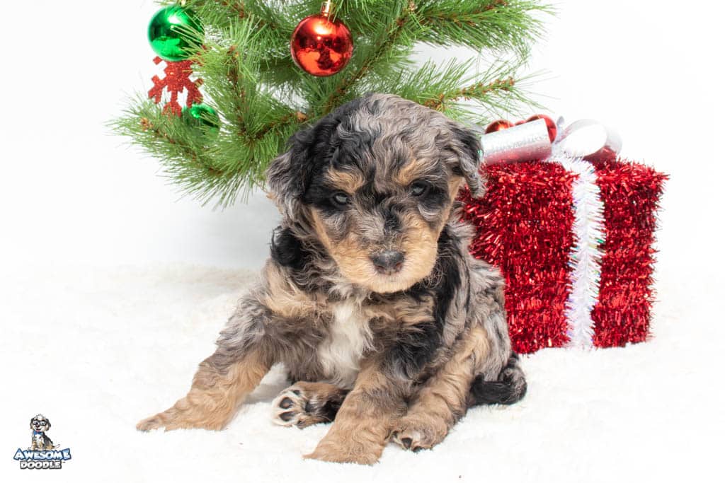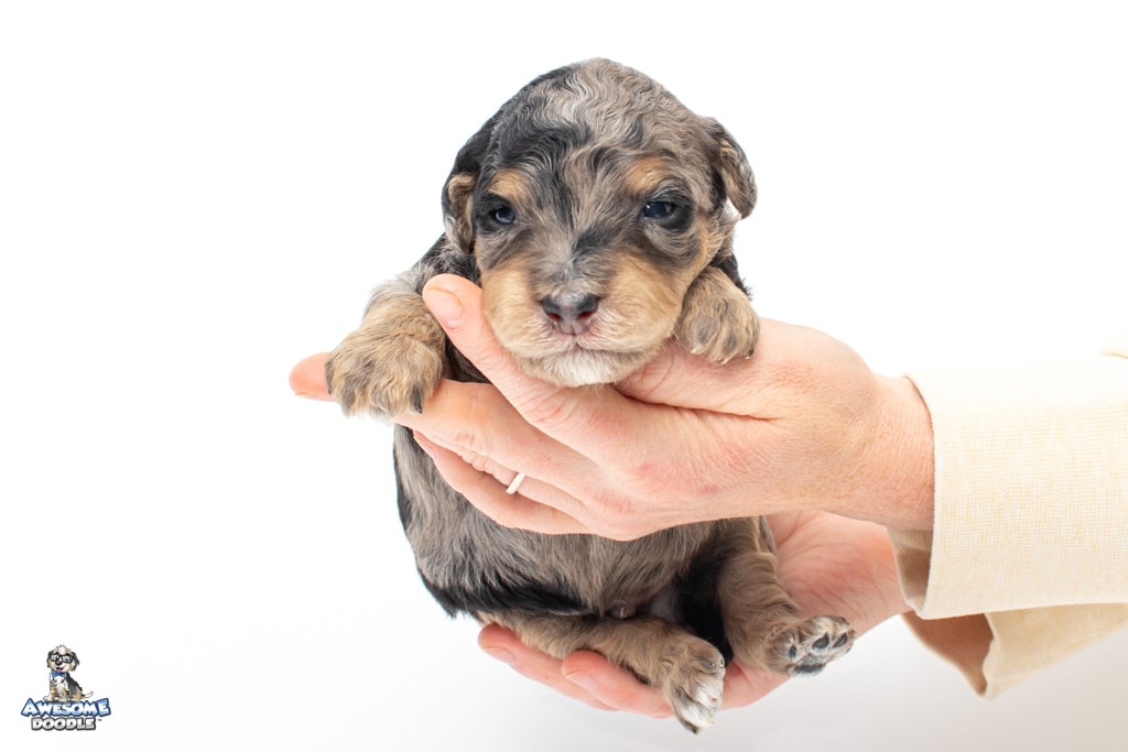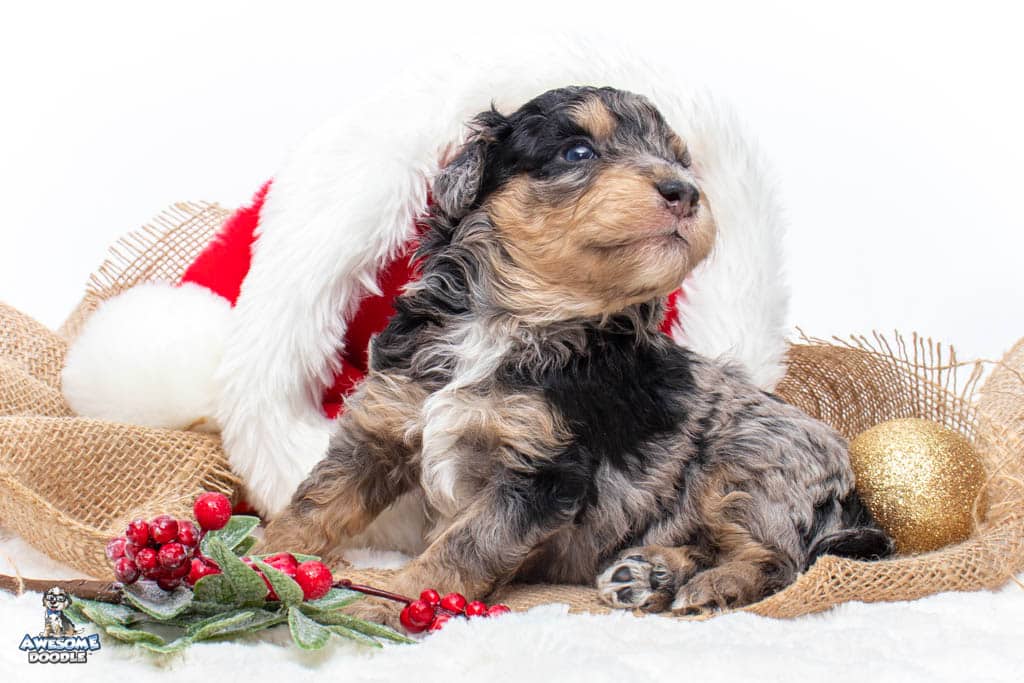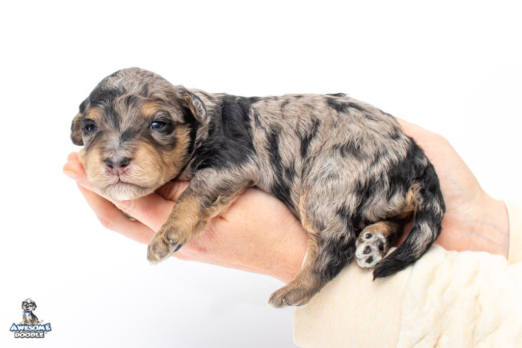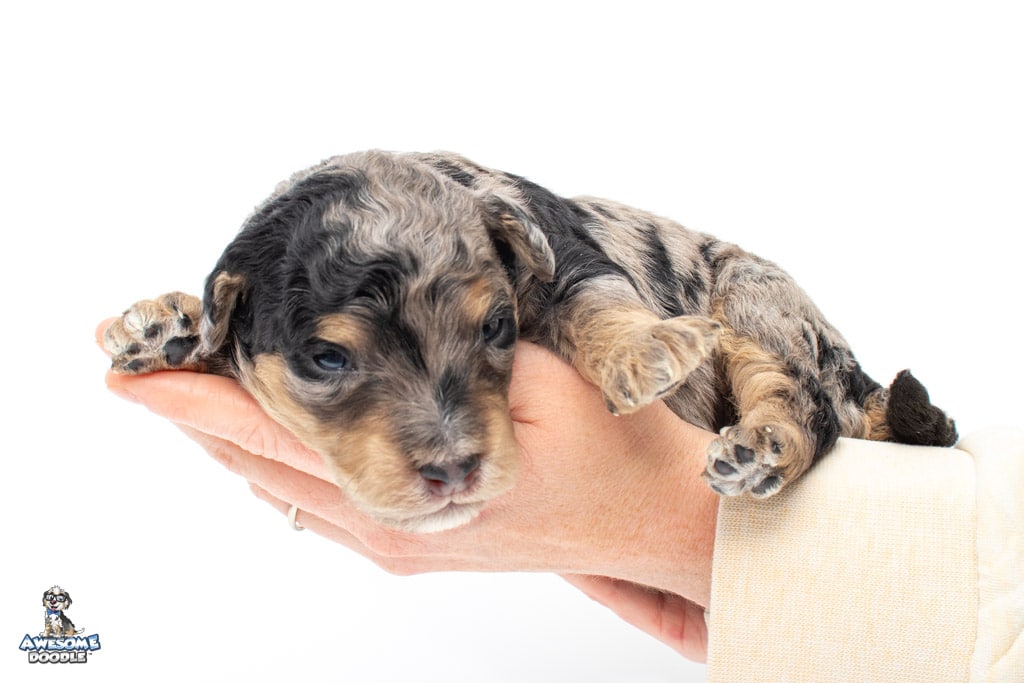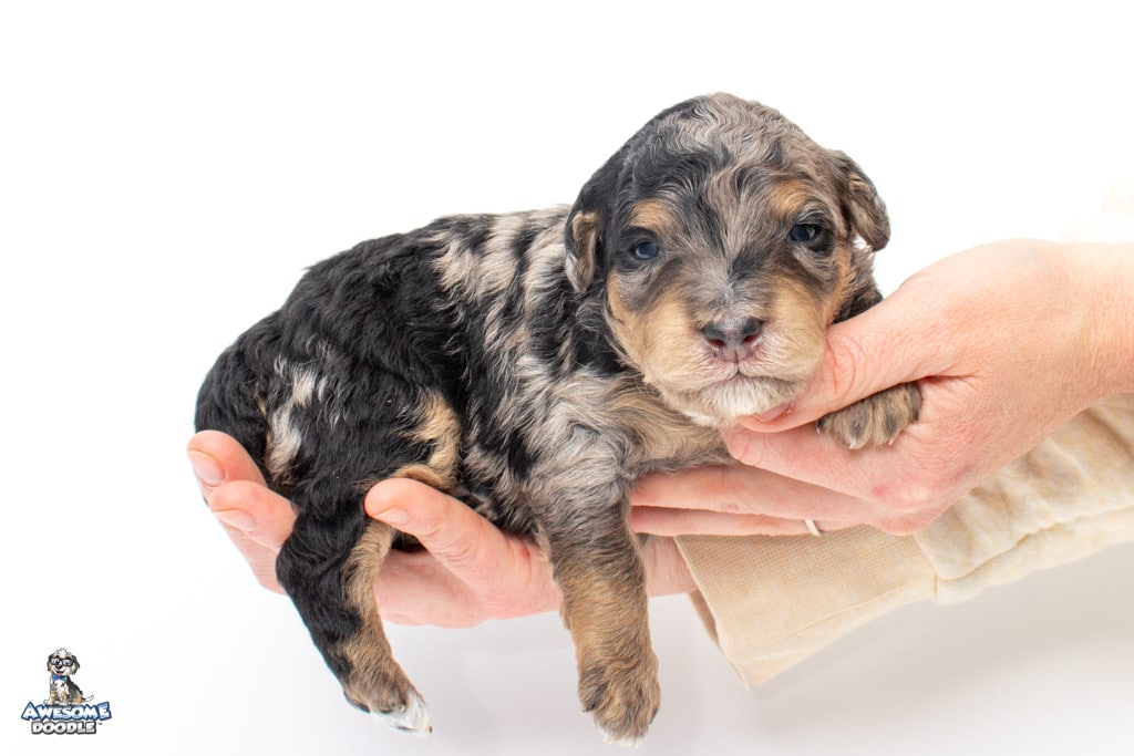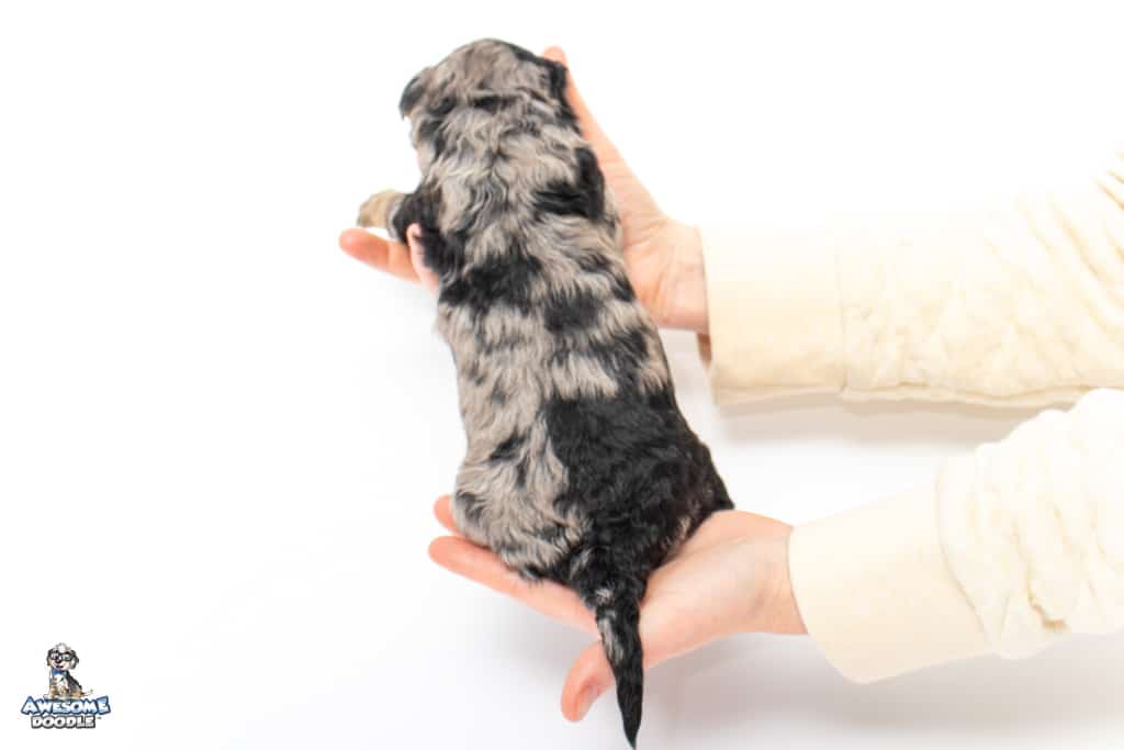 Cosmo is a male Phantom Blue Merle F1 AussieDoodle puppy.