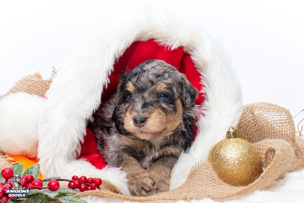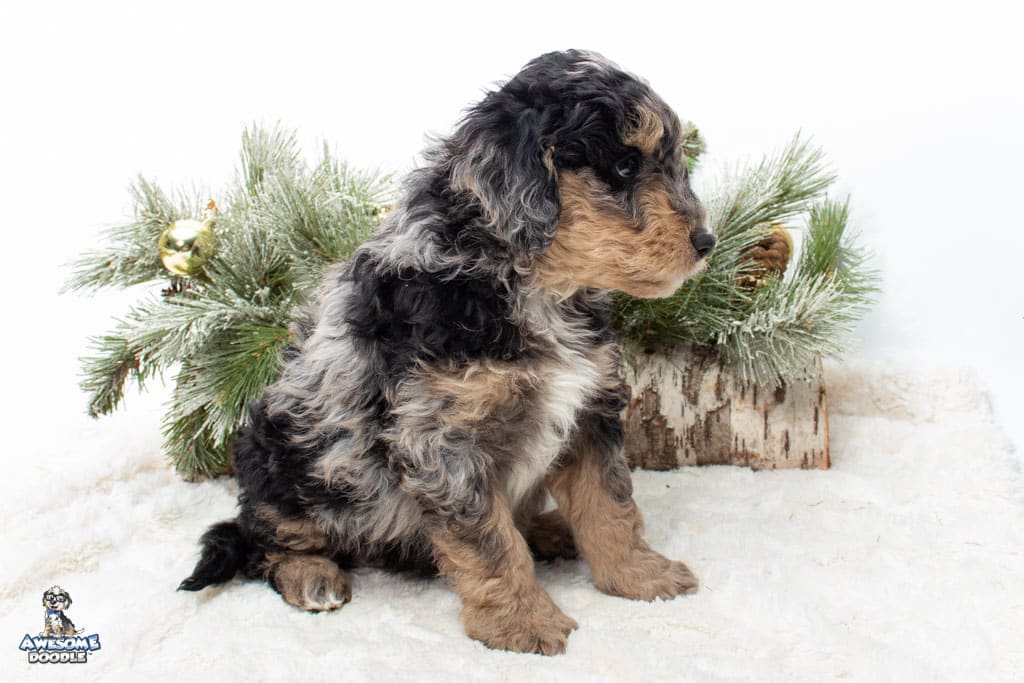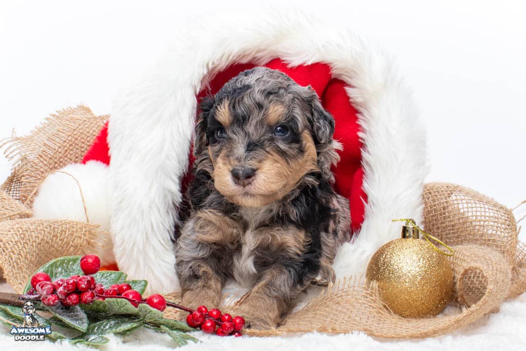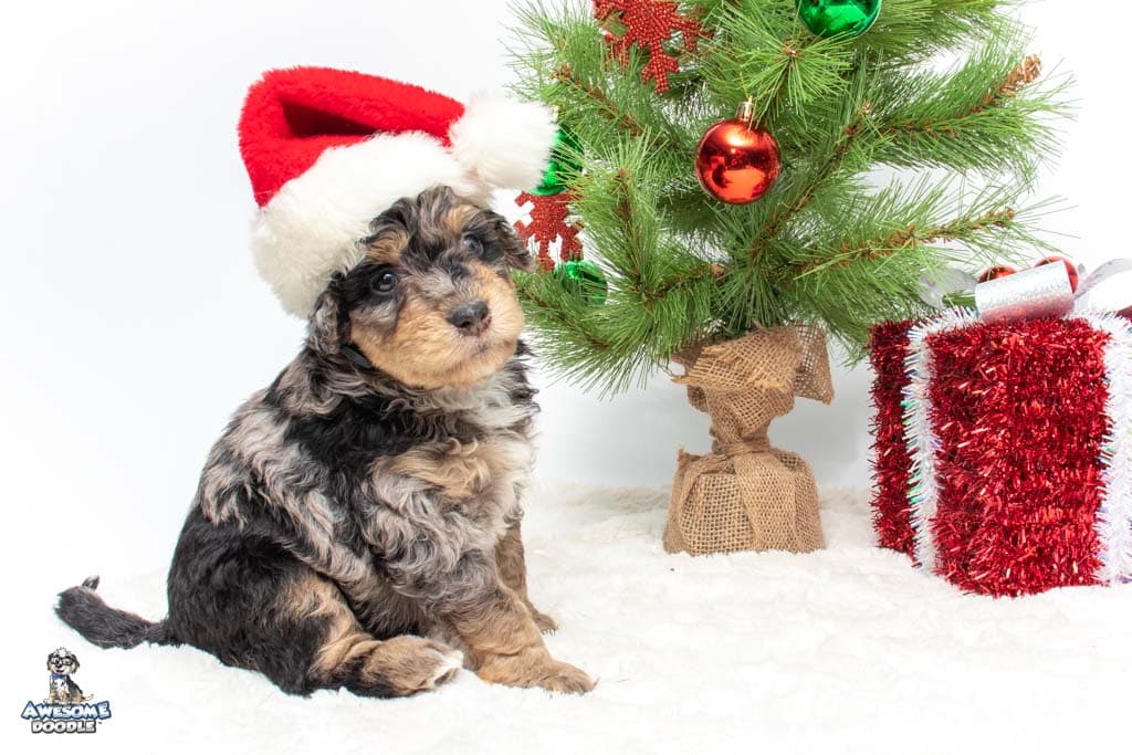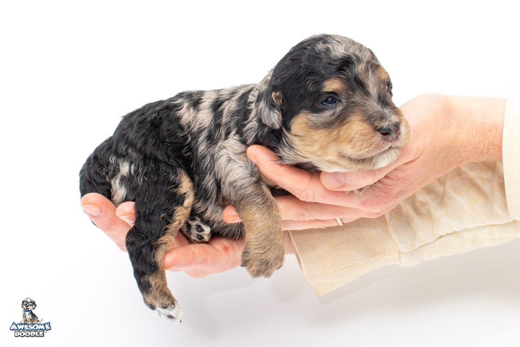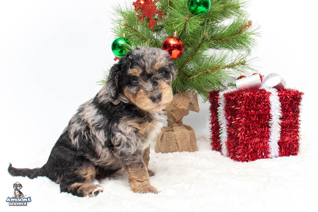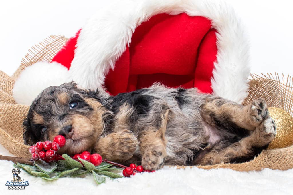 Cosmo is a male Phantom Blue Merle F1 AussieDoodle puppy.