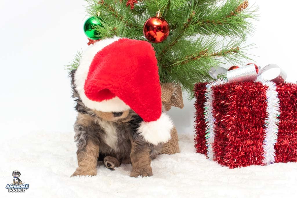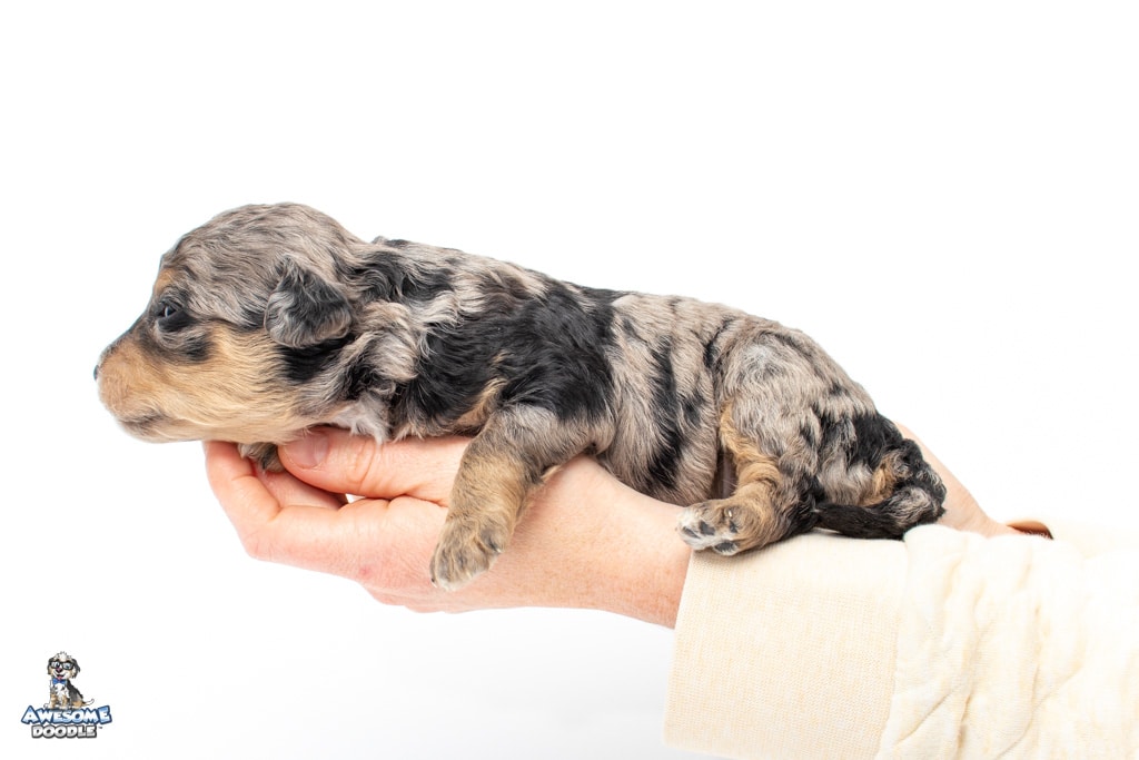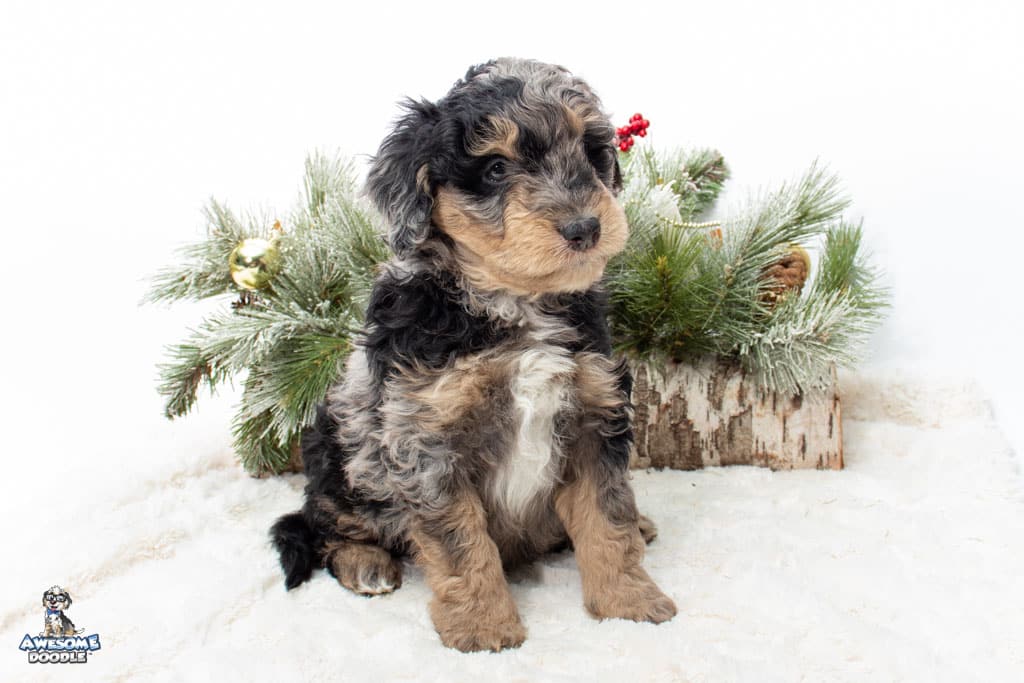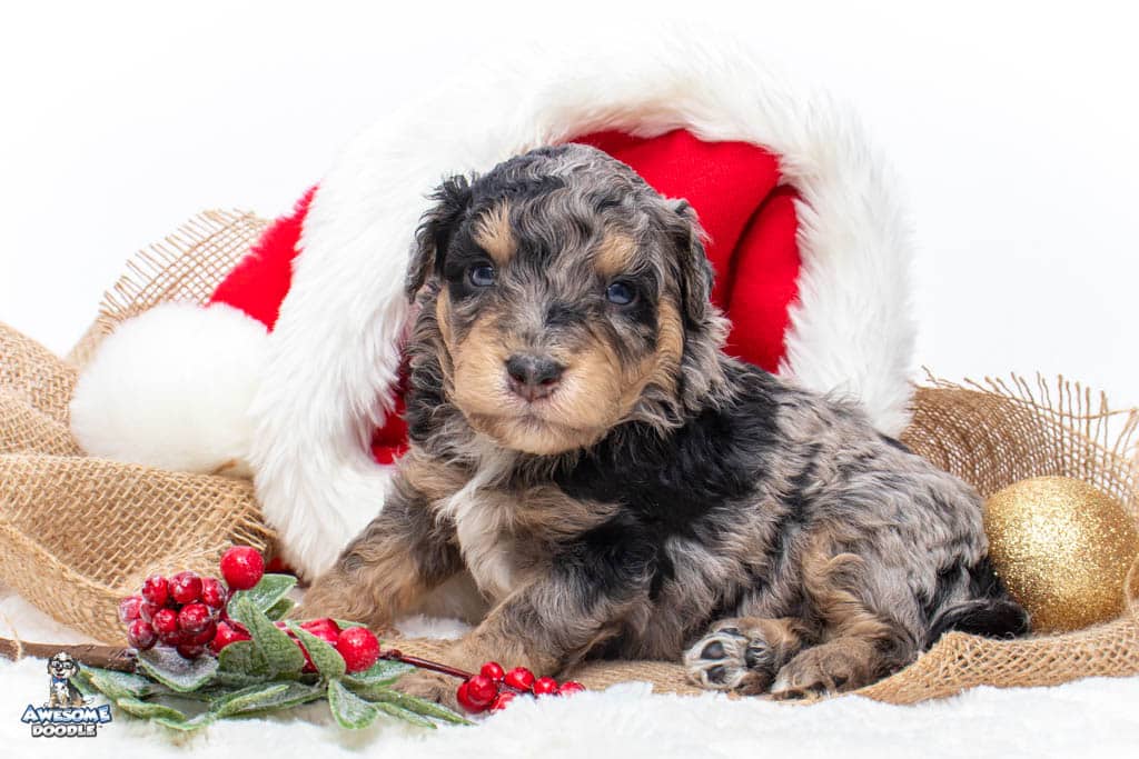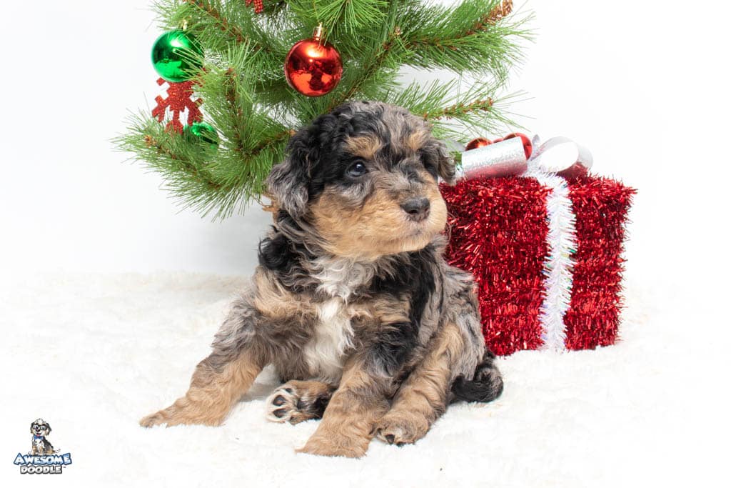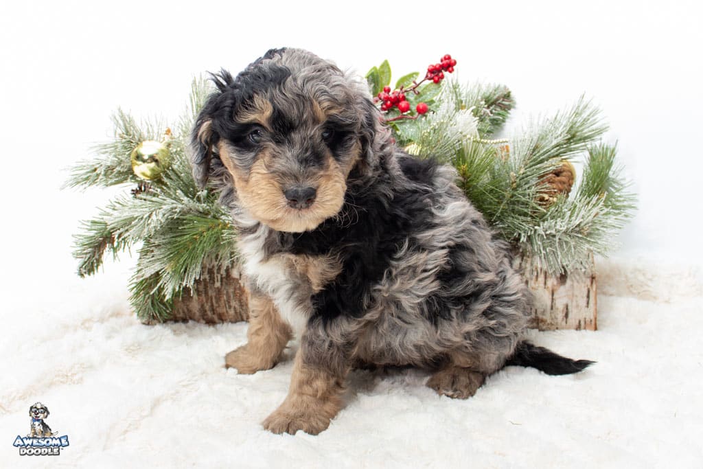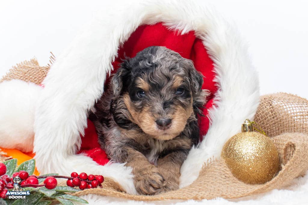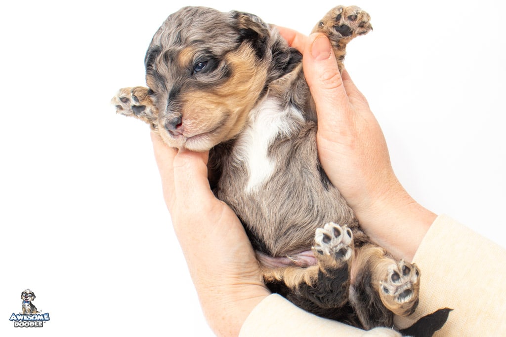 Cosmo is a male Phantom Blue Merle F1 AussieDoodle puppy.
