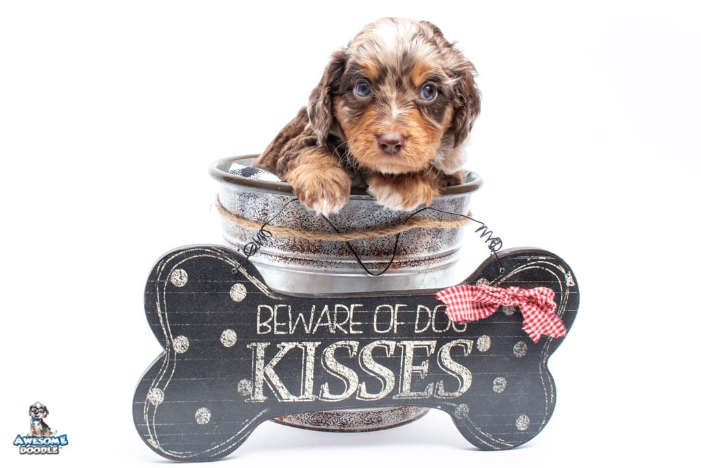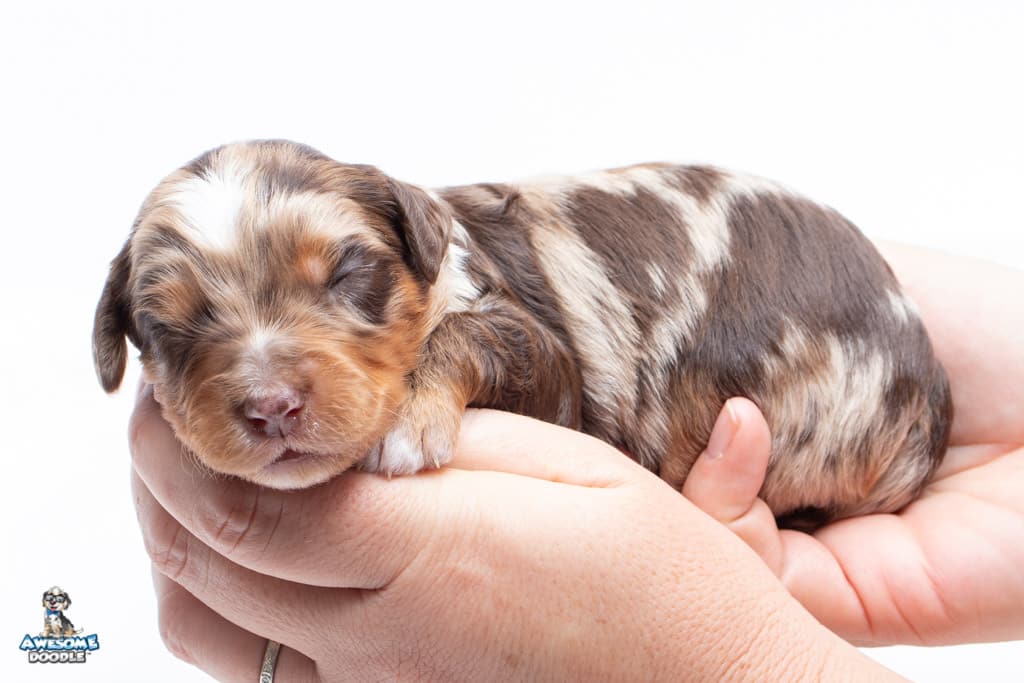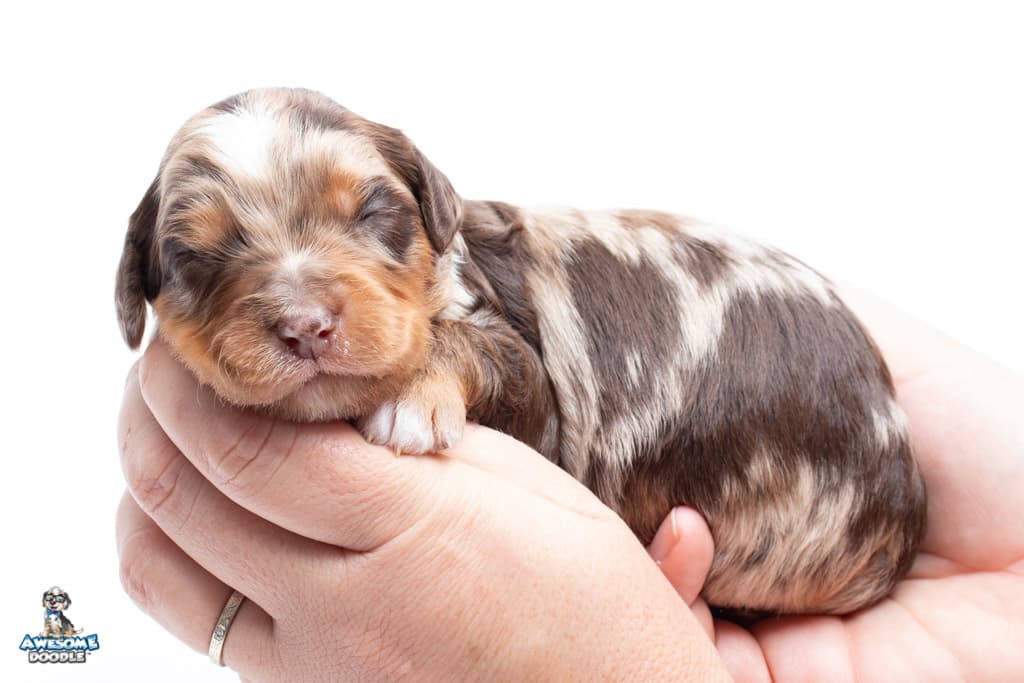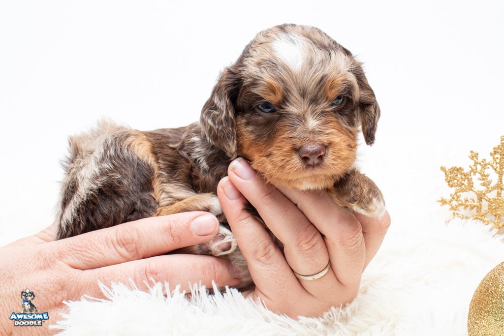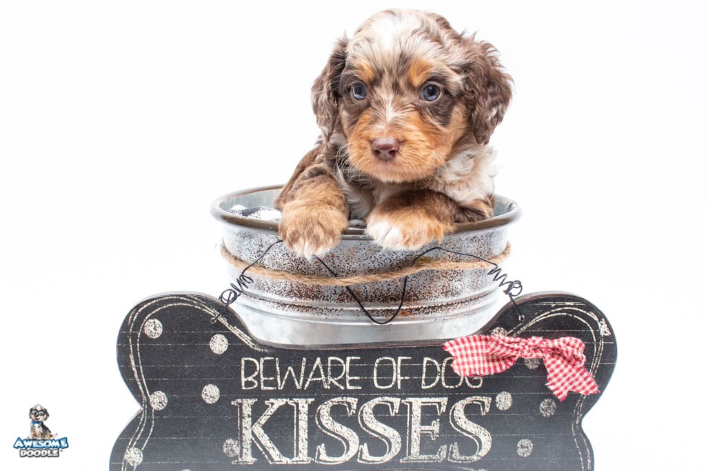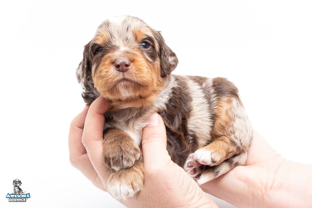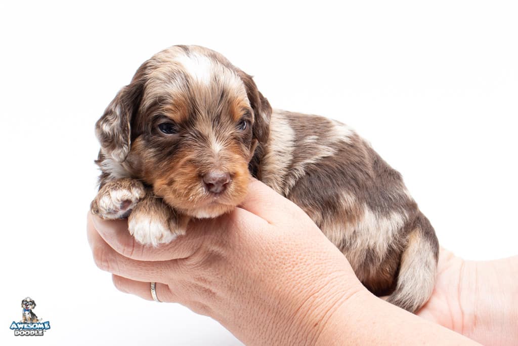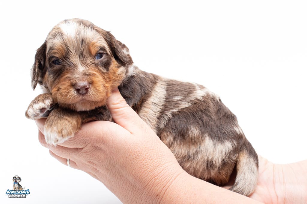 Rusti is a male Phantom Chocolate Merle F1 AussieDoodle puppy.