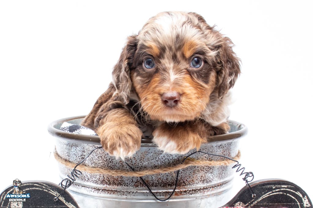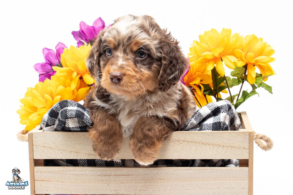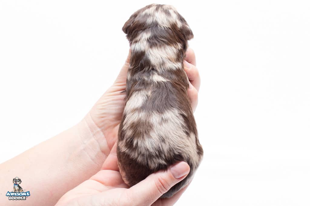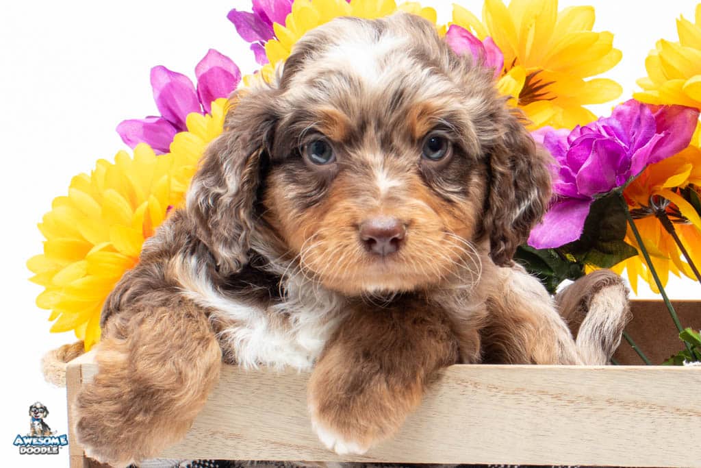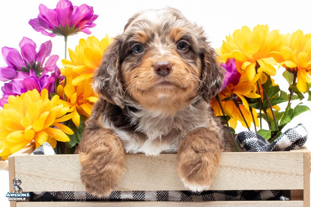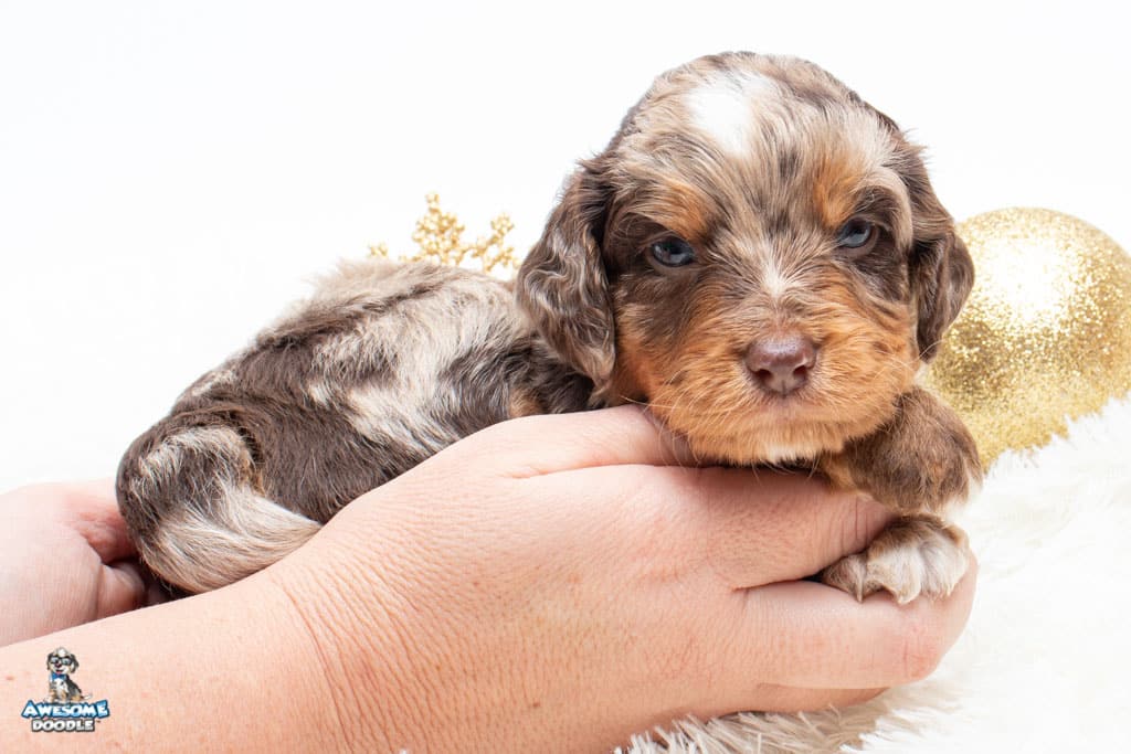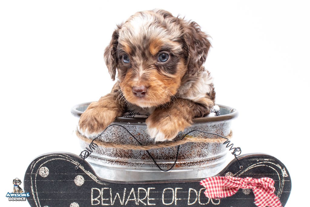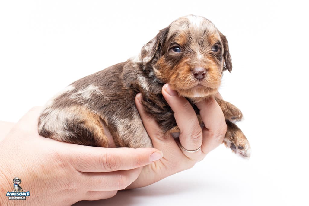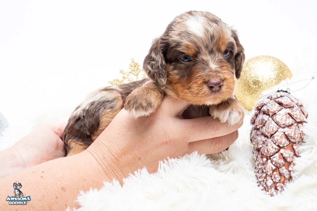Rusti is a male Phantom Chocolate Merle F1 AussieDoodle puppy.