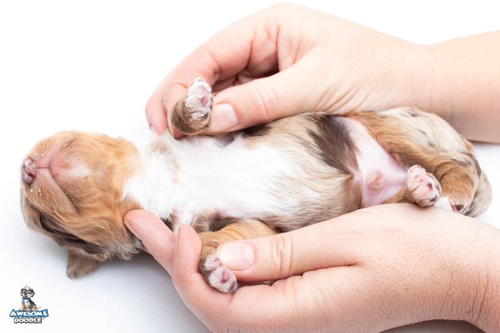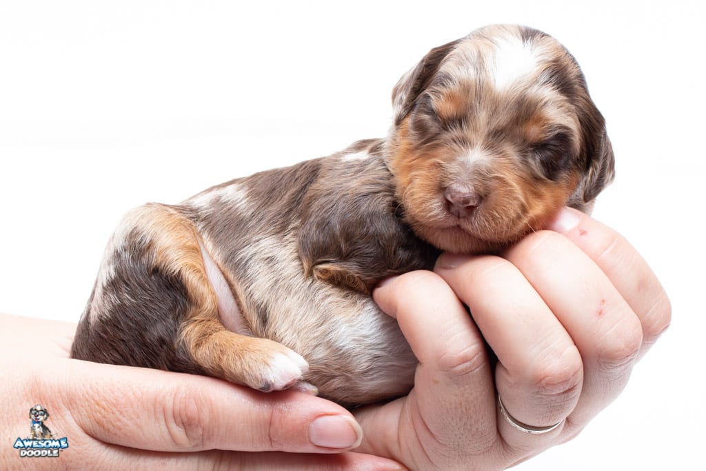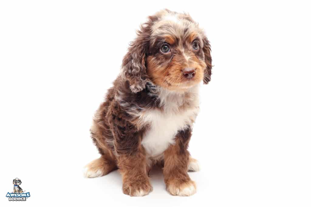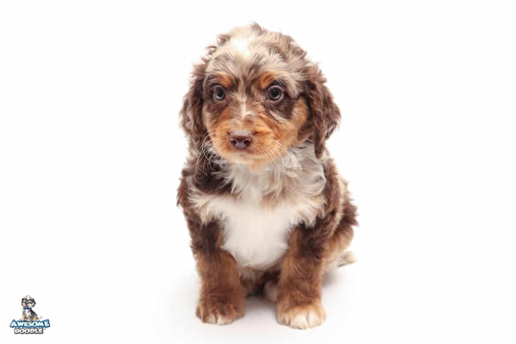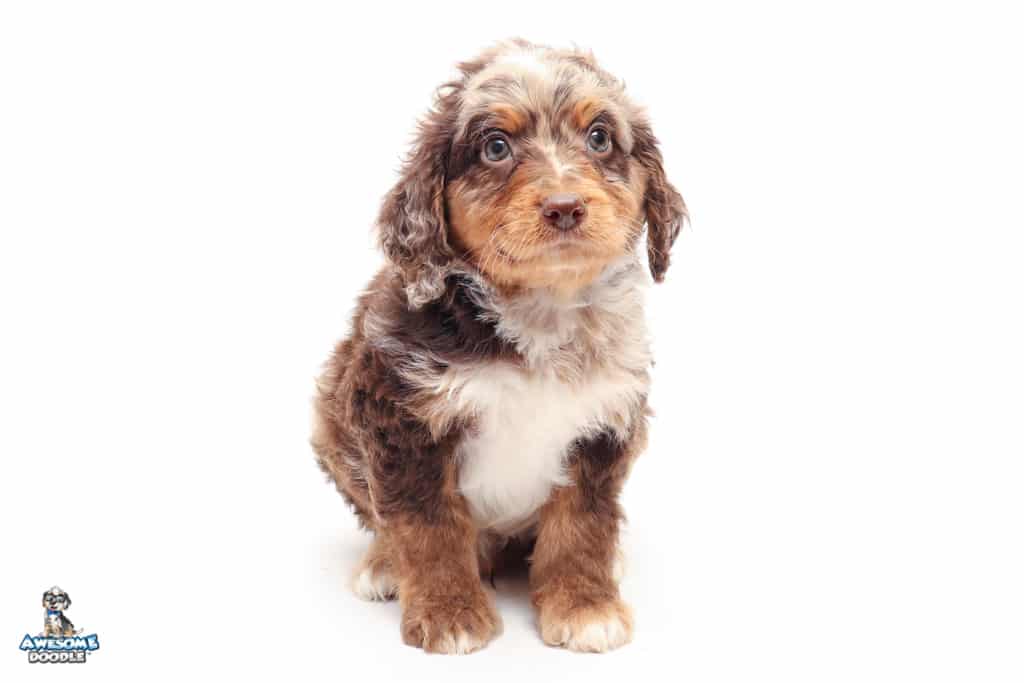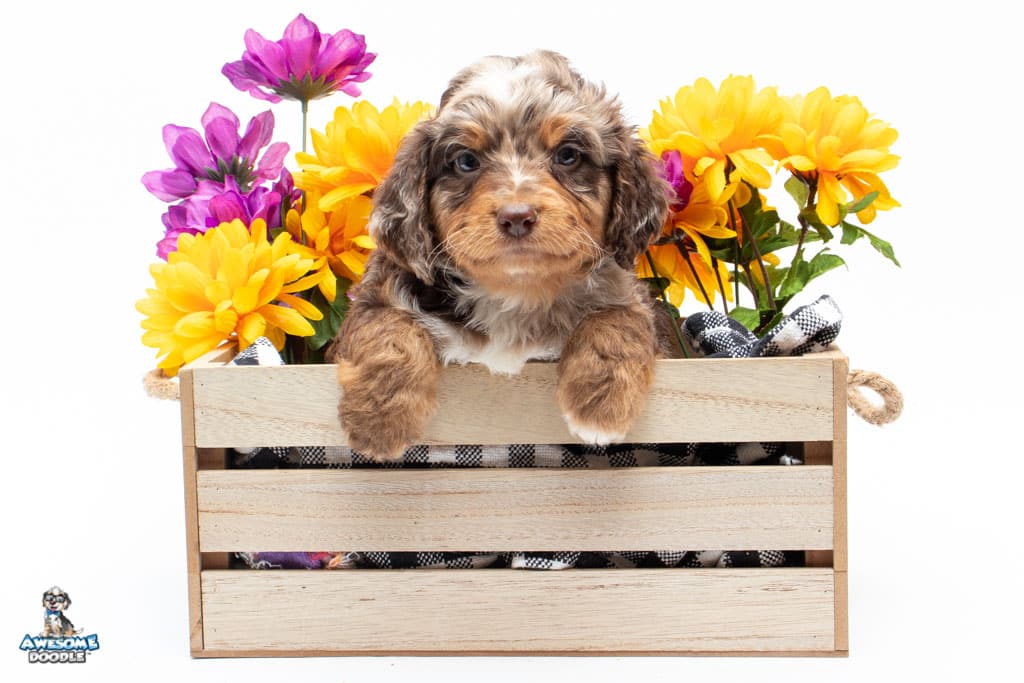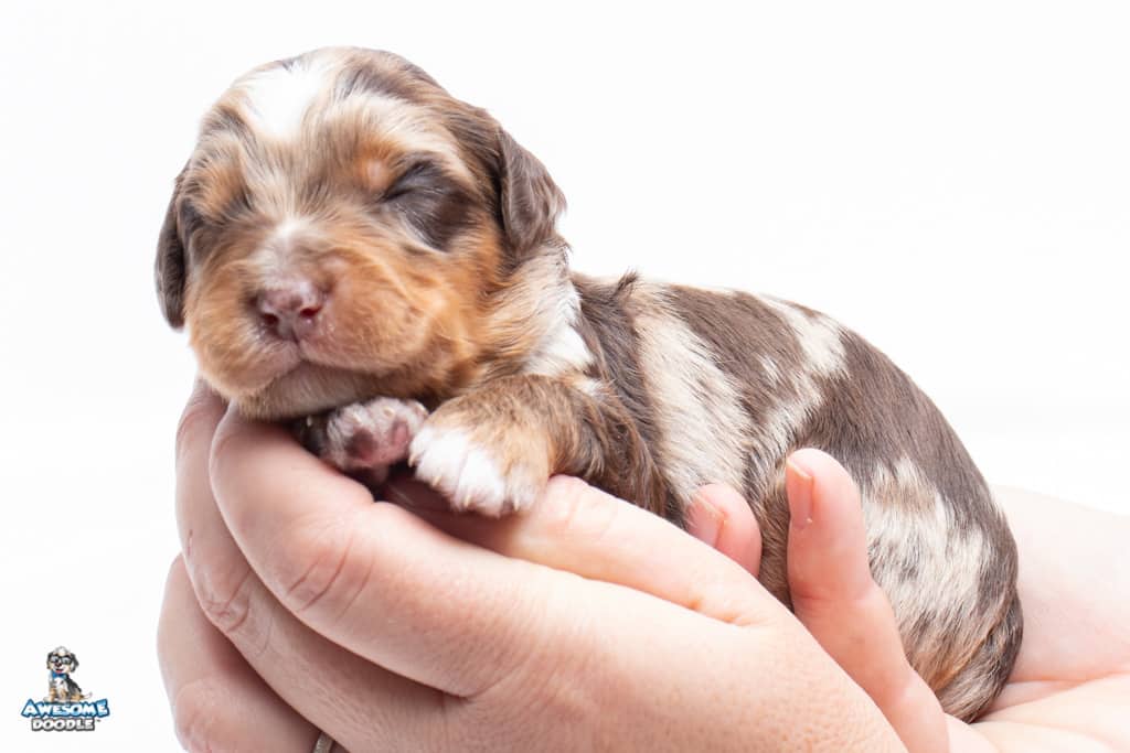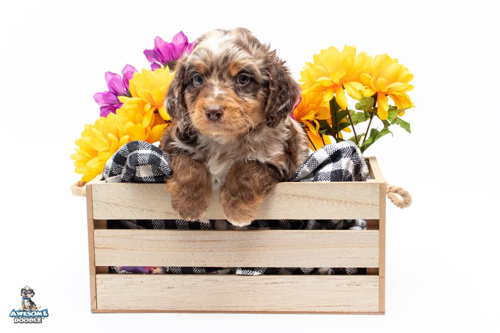 Rusti is a male Phantom Chocolate Merle F1 AussieDoodle puppy.