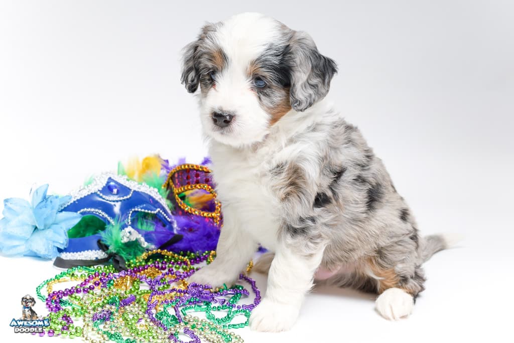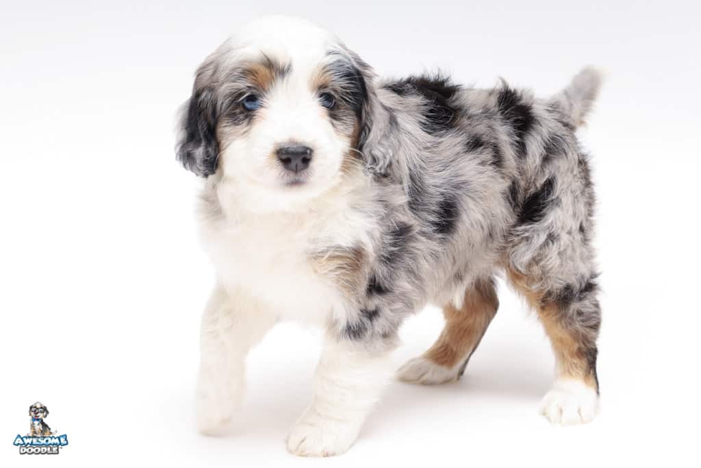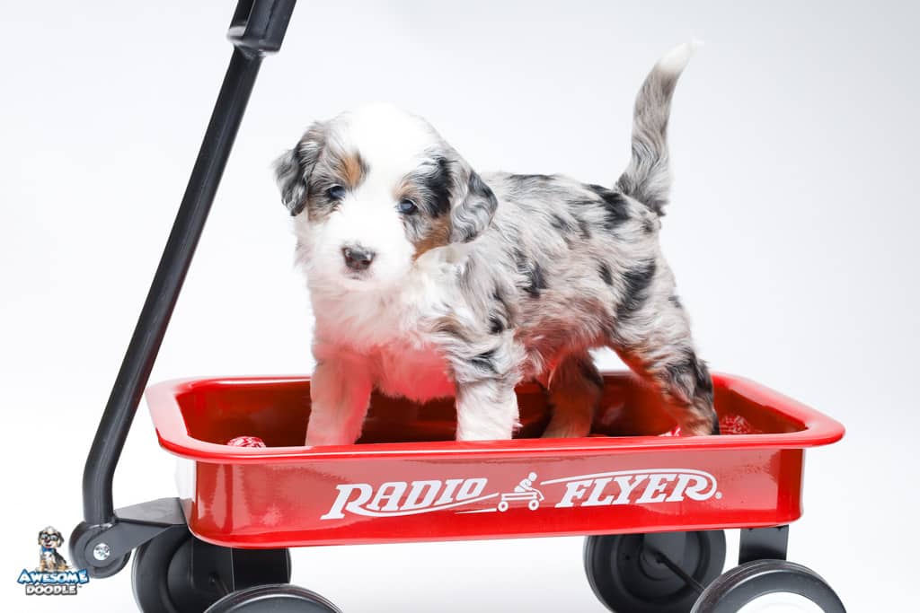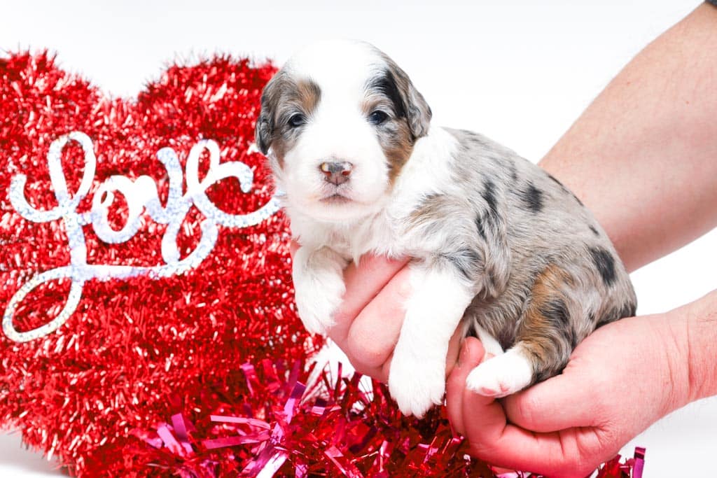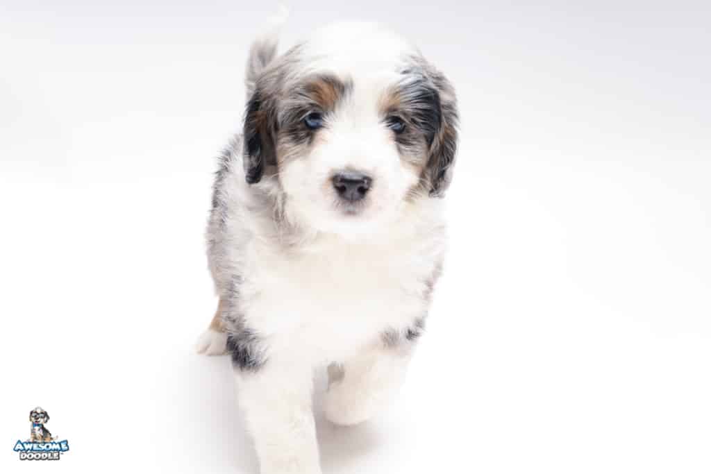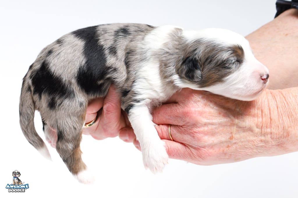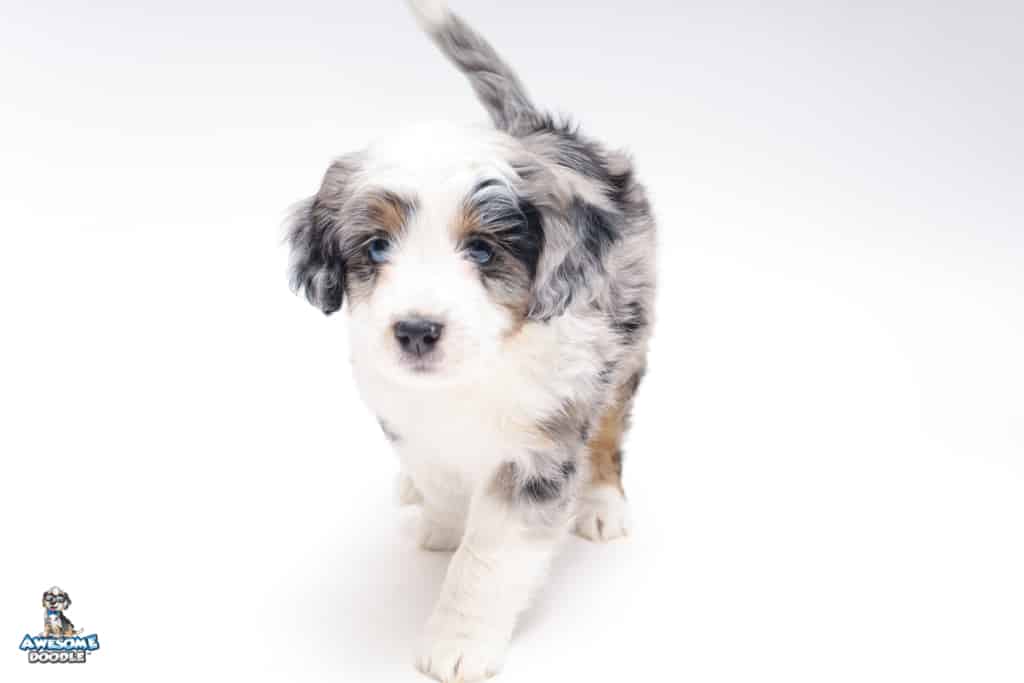 Rigby is a male Blue Merle w/ White & Copper F1 AussieDoodle puppy.