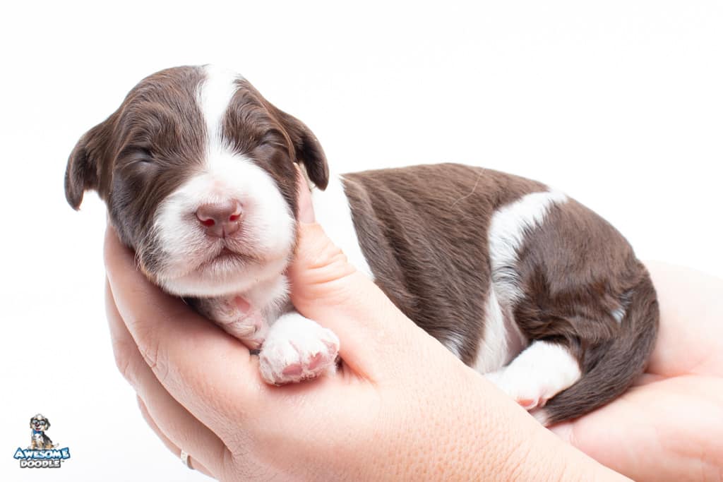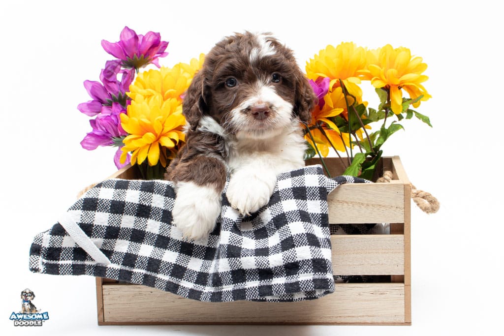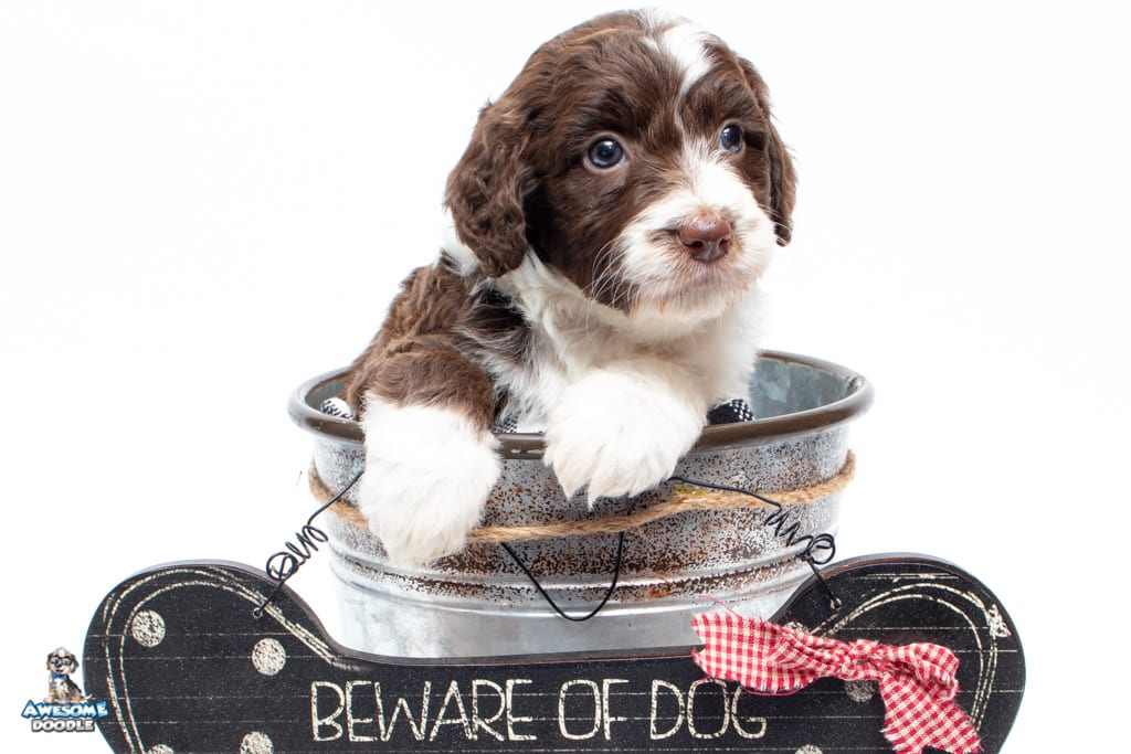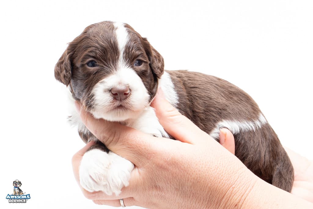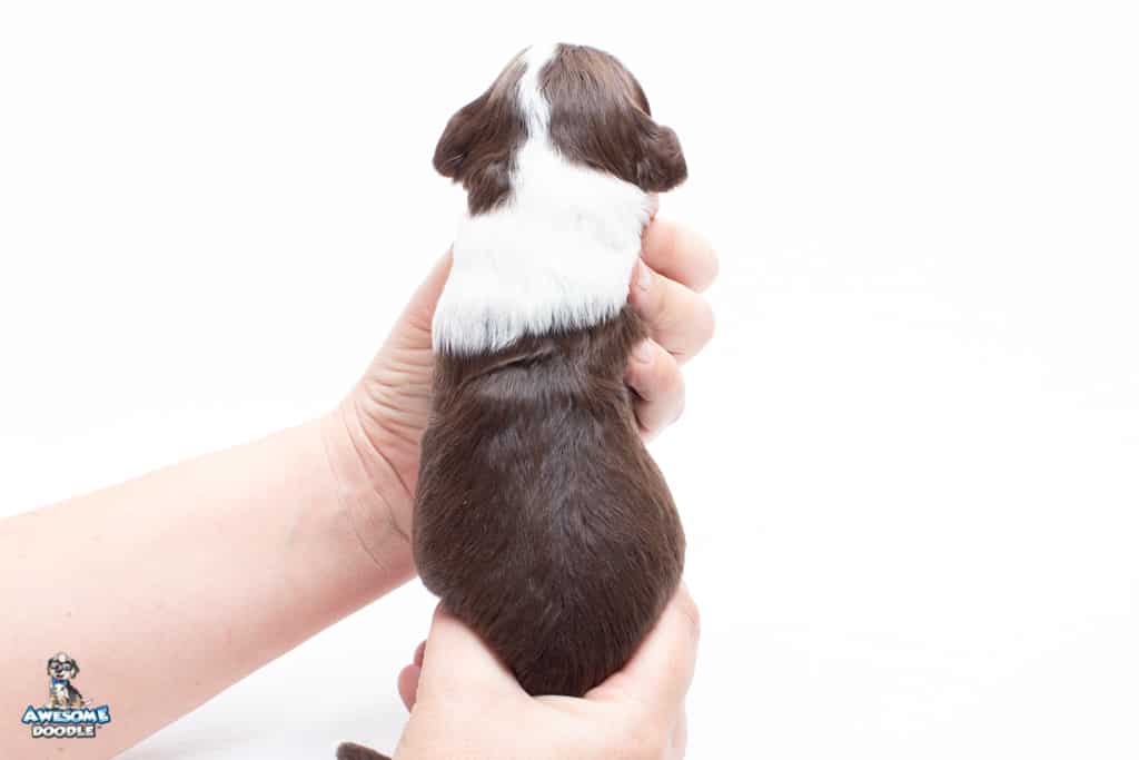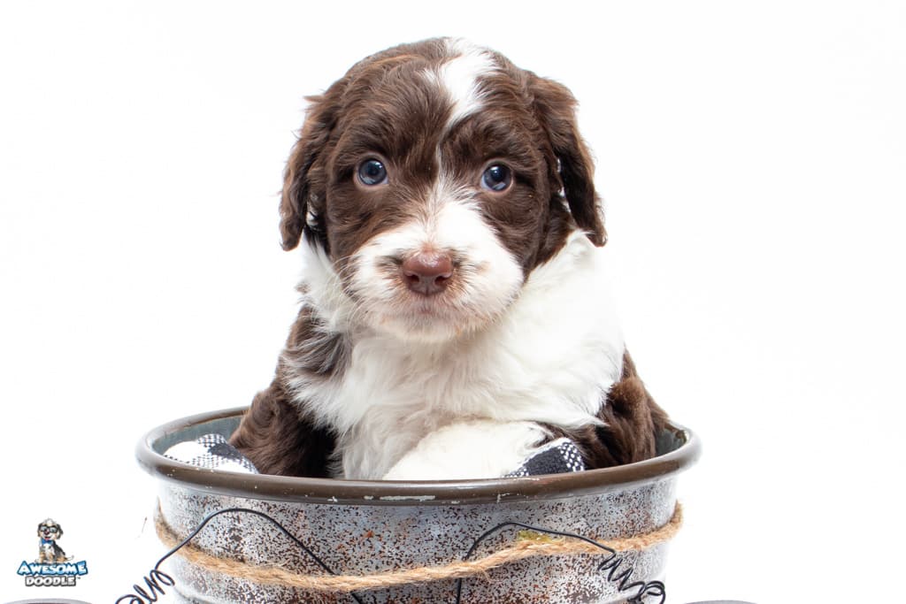 Dolly is a female Chocolate Tri-Color F1 AussieDoodle puppy.