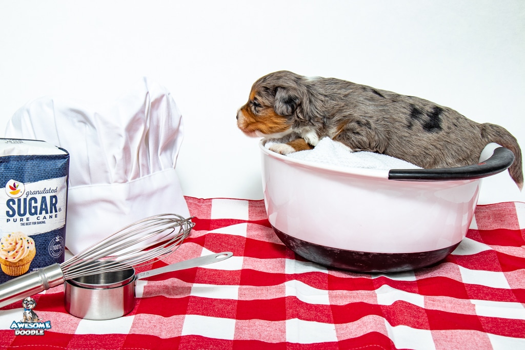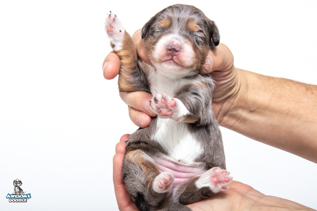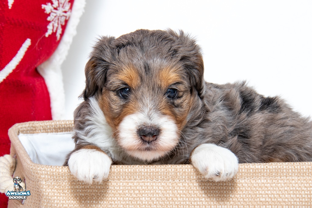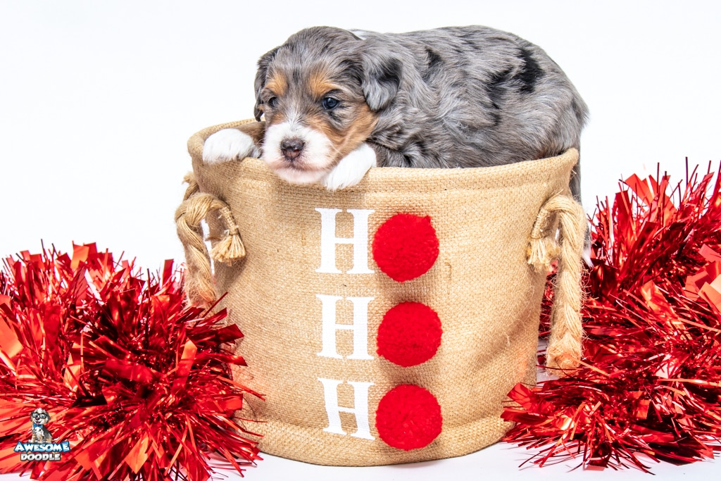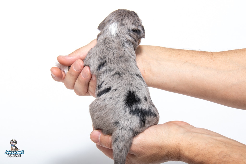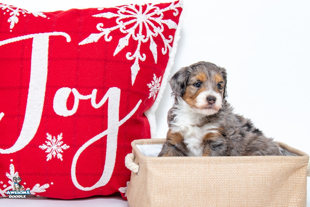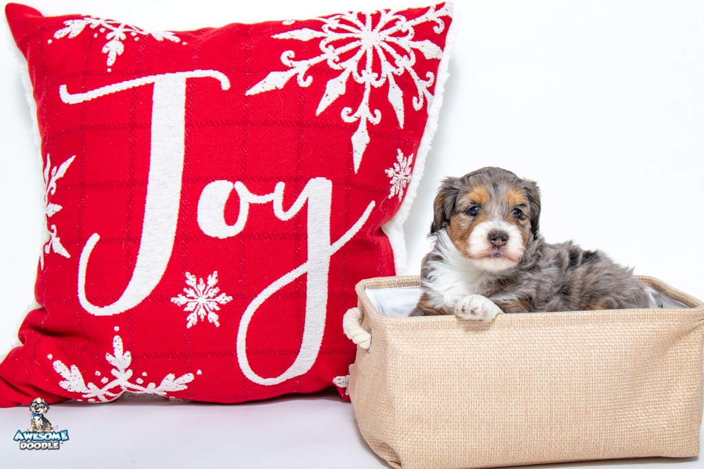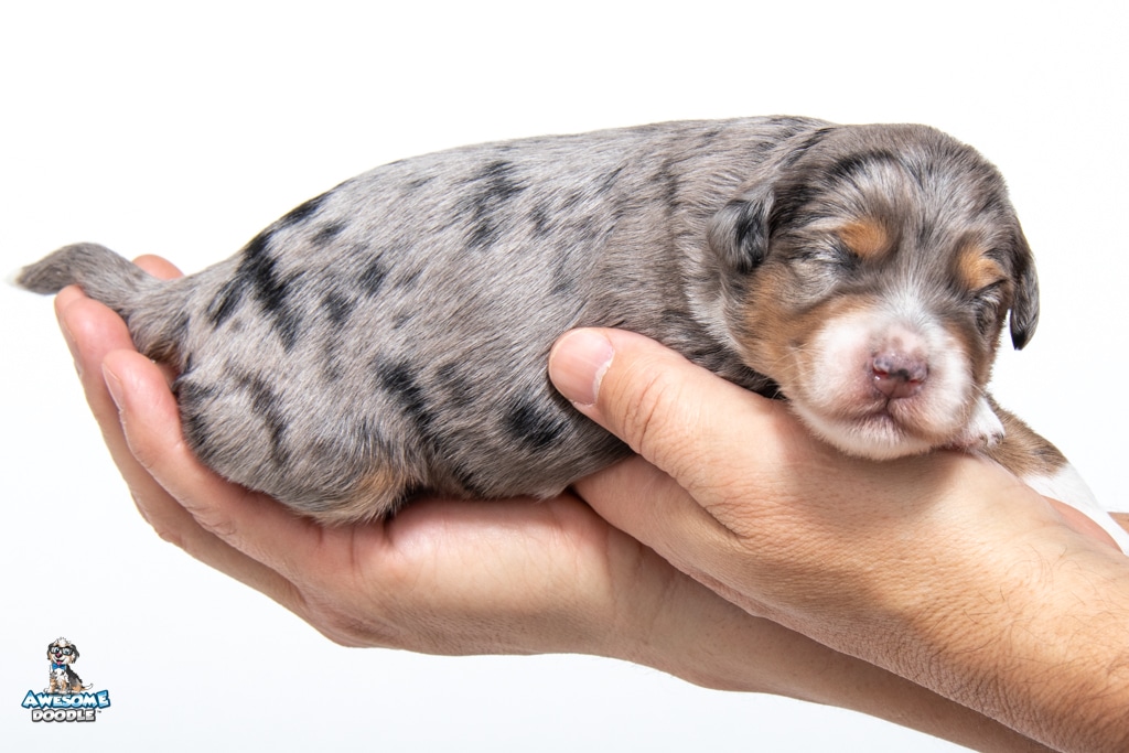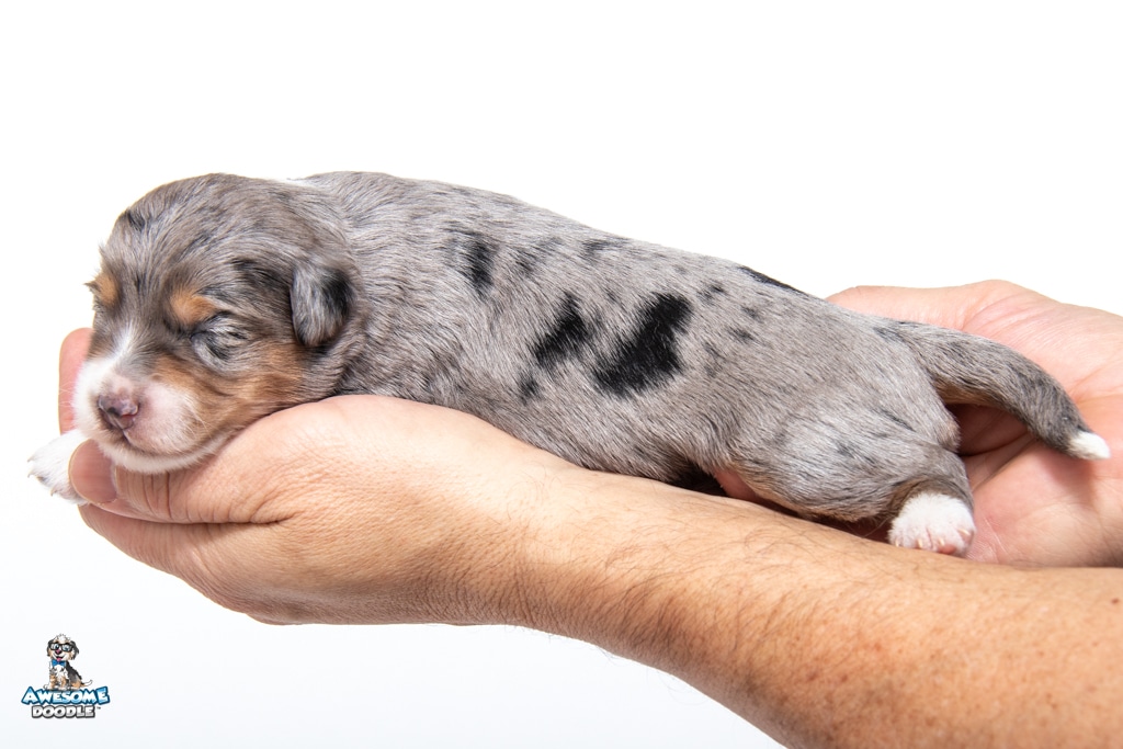 Violet is a female Blue Merle w/ White & Copper F1 AussieDoodle puppy.