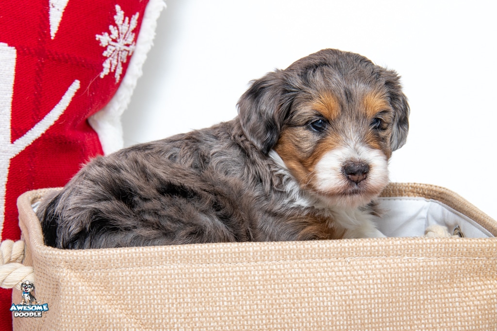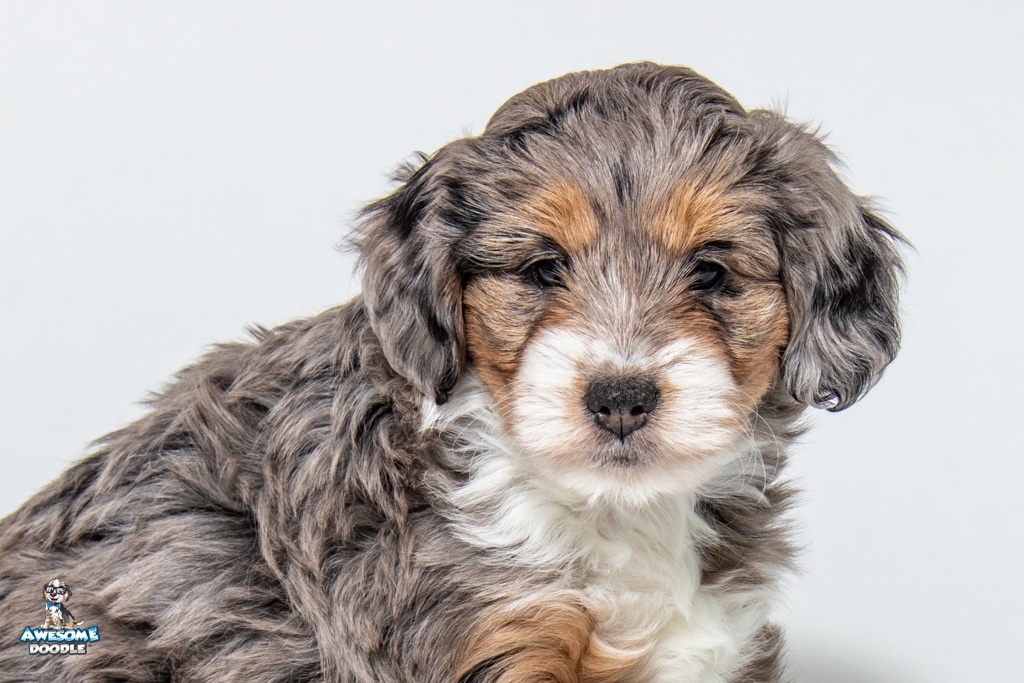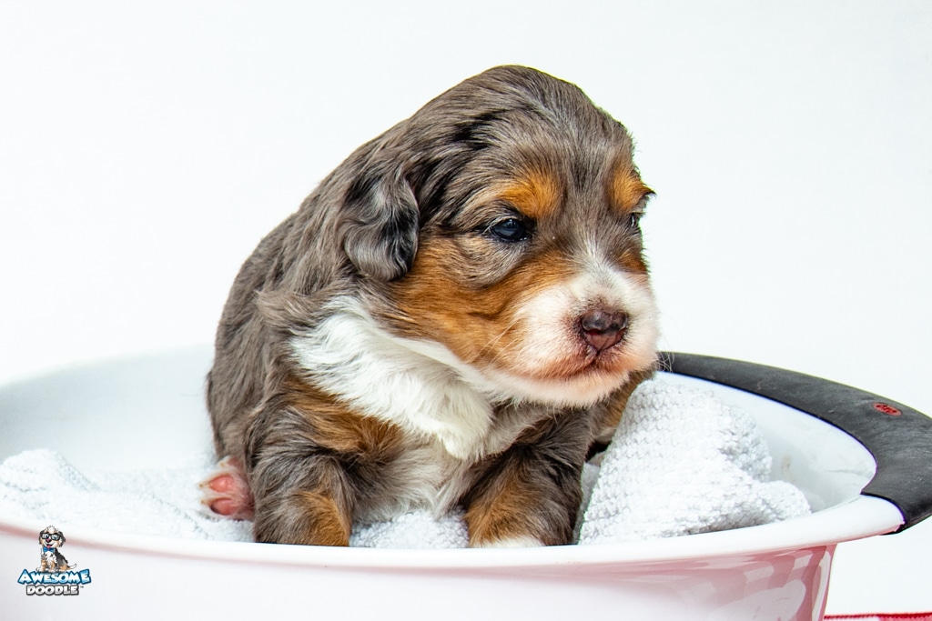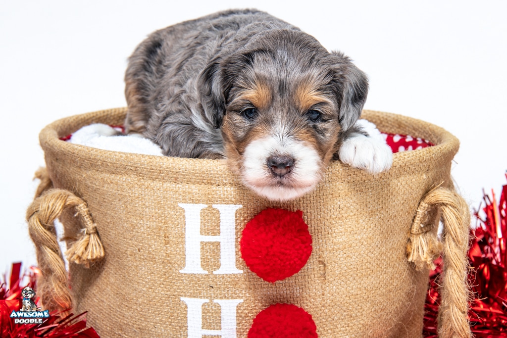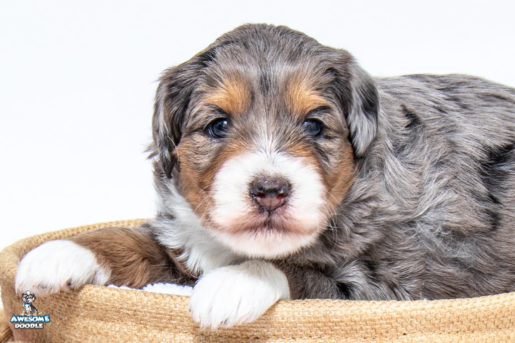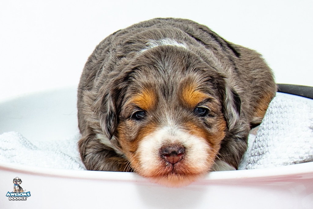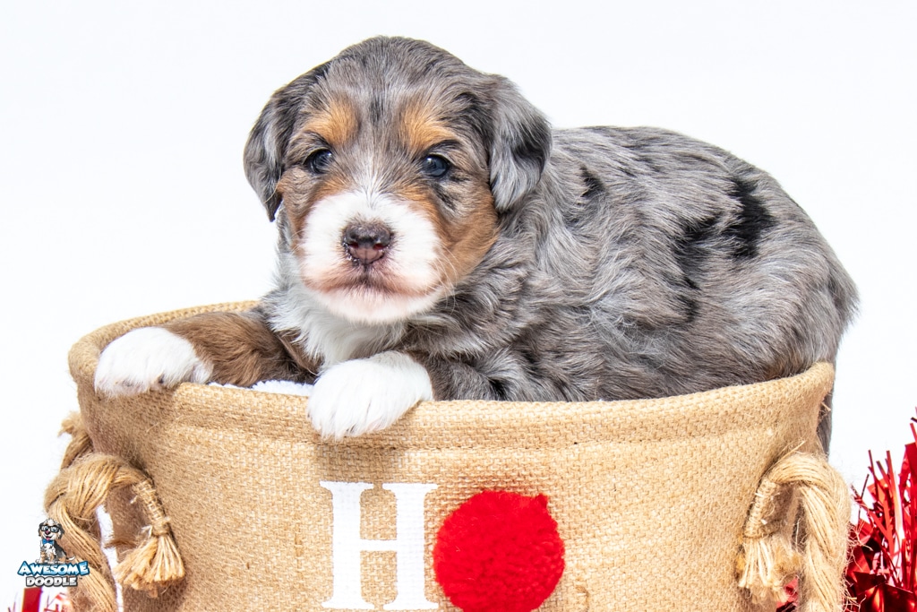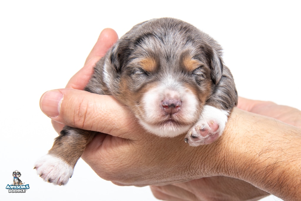 Violet is a female Blue Merle w/ White & Copper F1 AussieDoodle puppy.