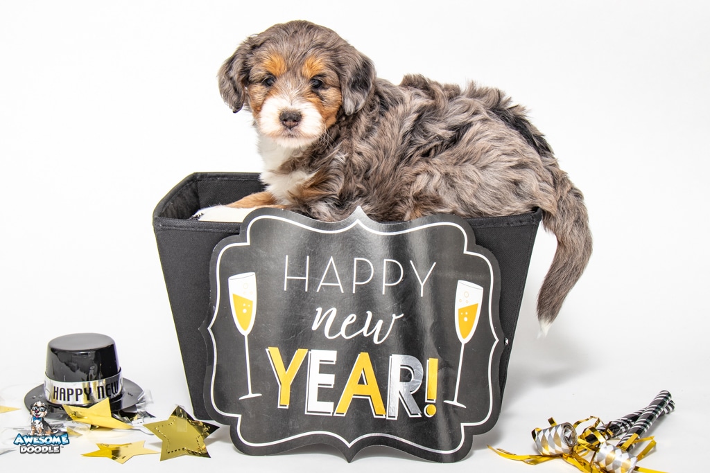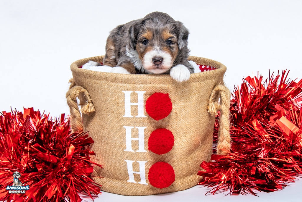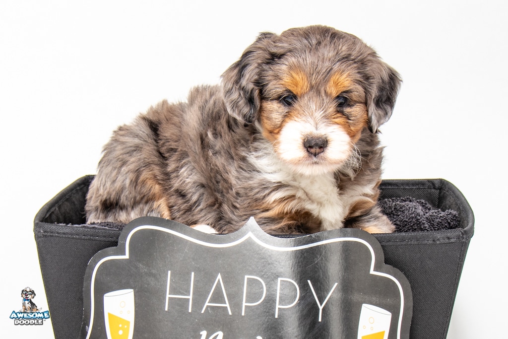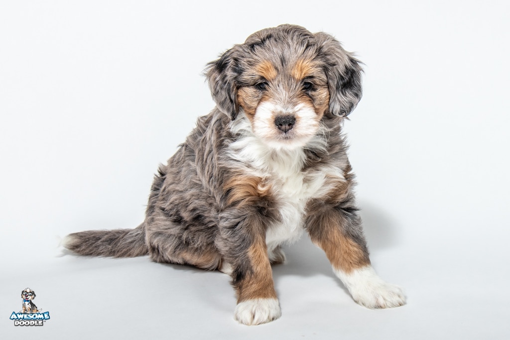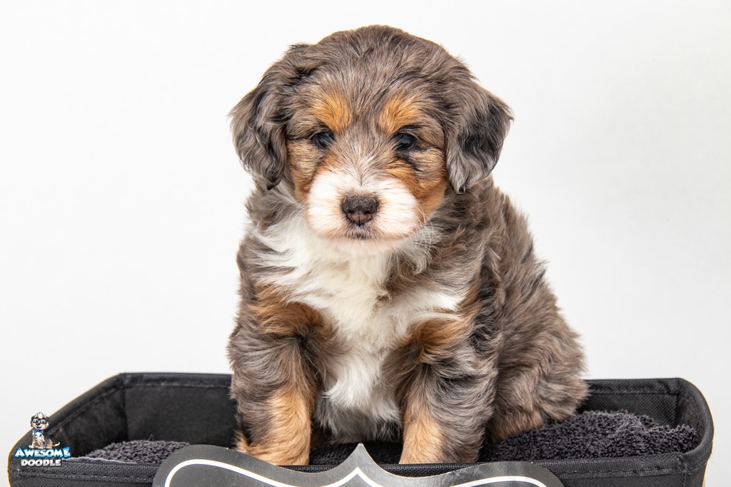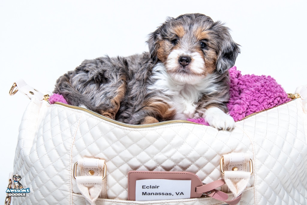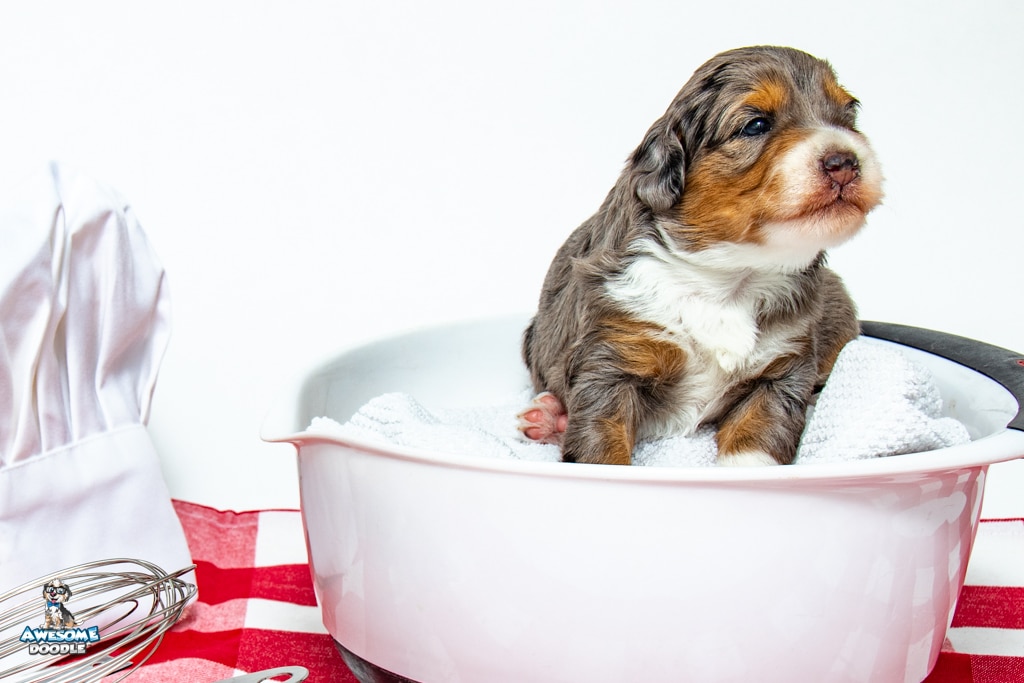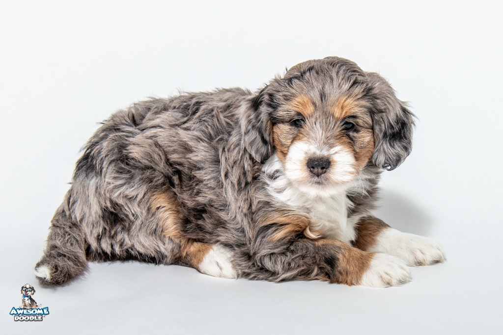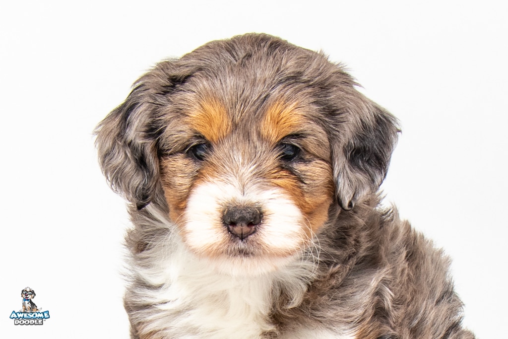 Violet is a female Blue Merle w/ White & Copper F1 AussieDoodle puppy.