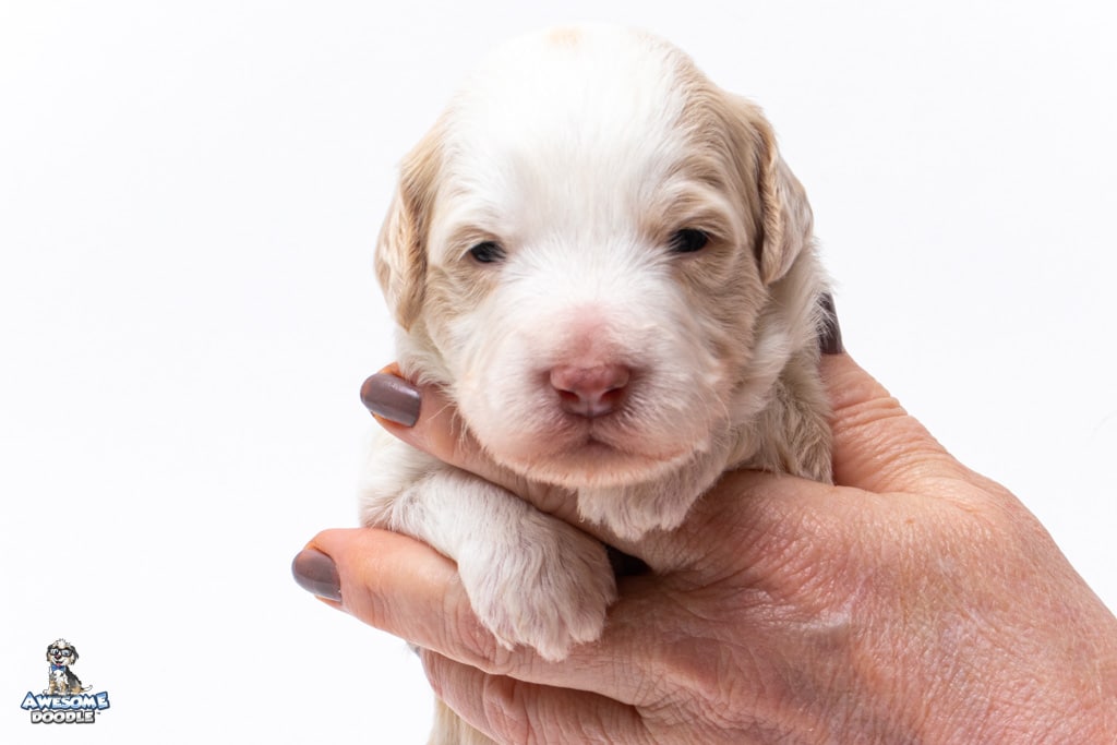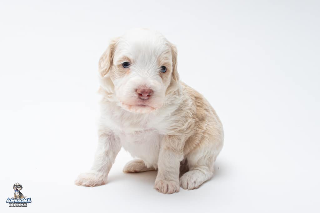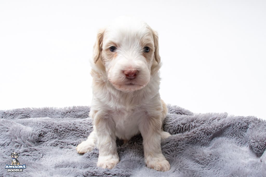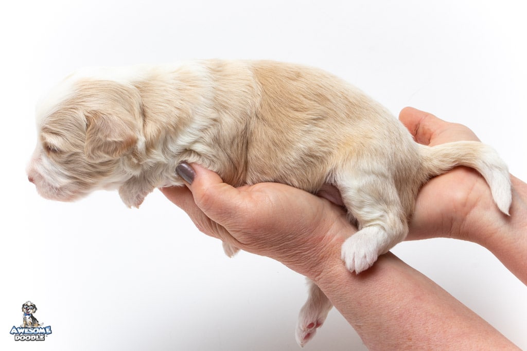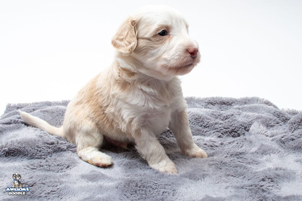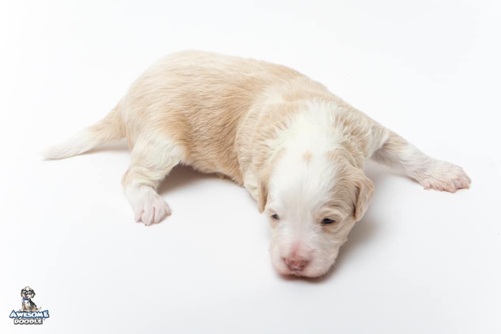 Goose is a male Apricot Bi-Color F1 AussieDoodle puppy.