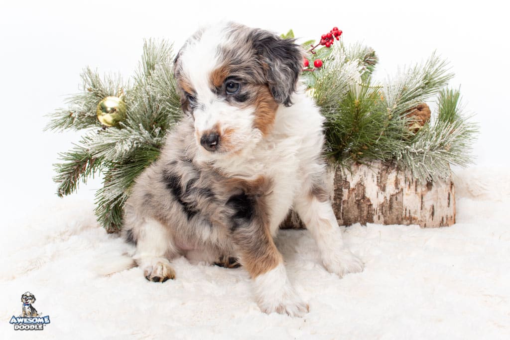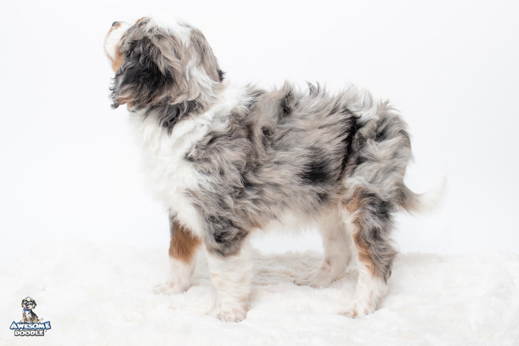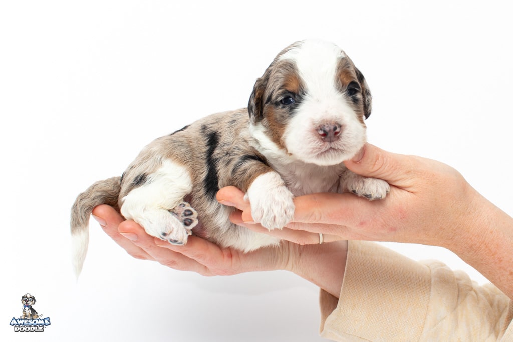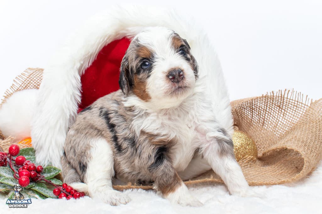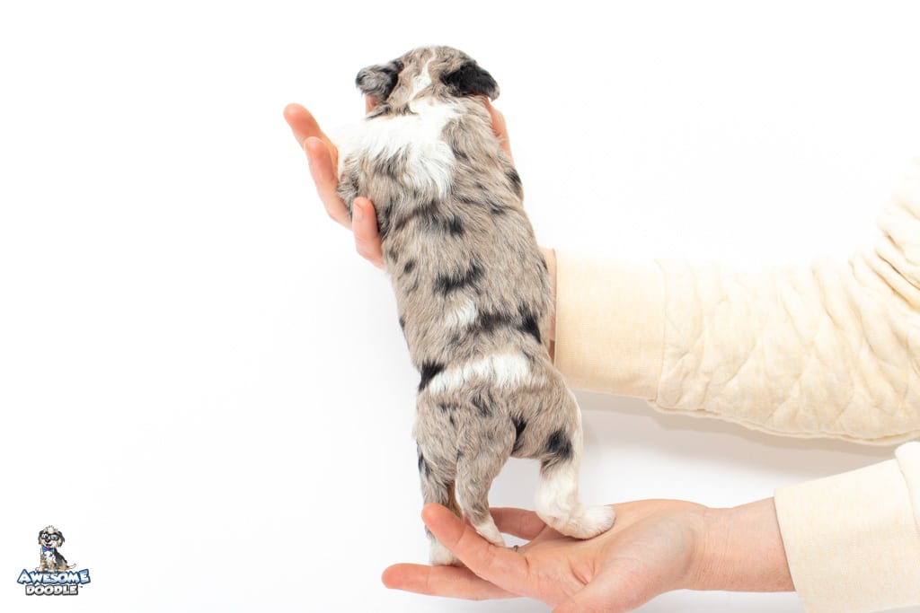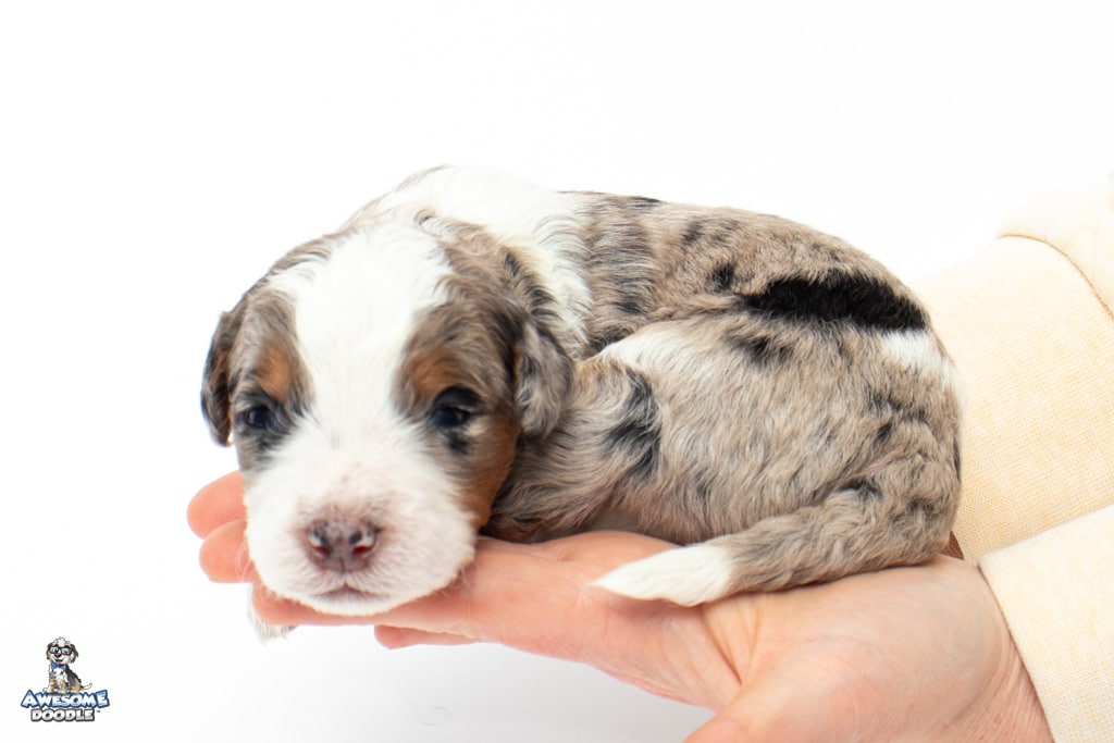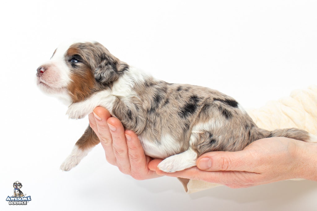 Zeke is a male Blue Merle w/ White & Copper F1 AussieDoodle puppy.