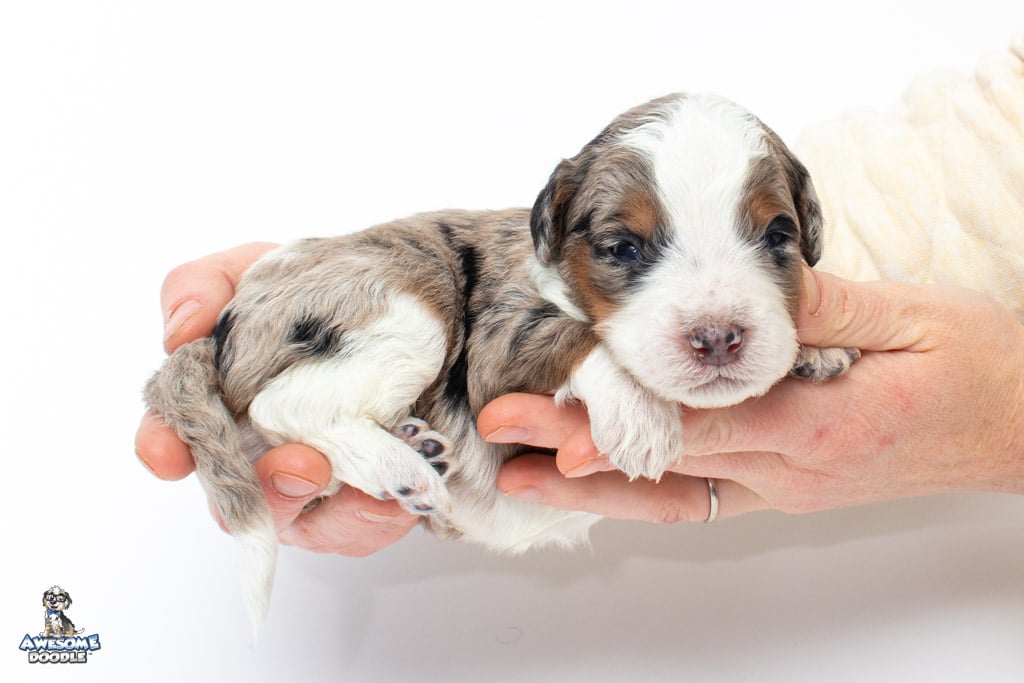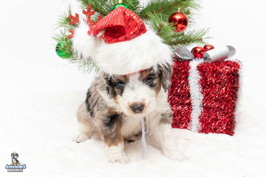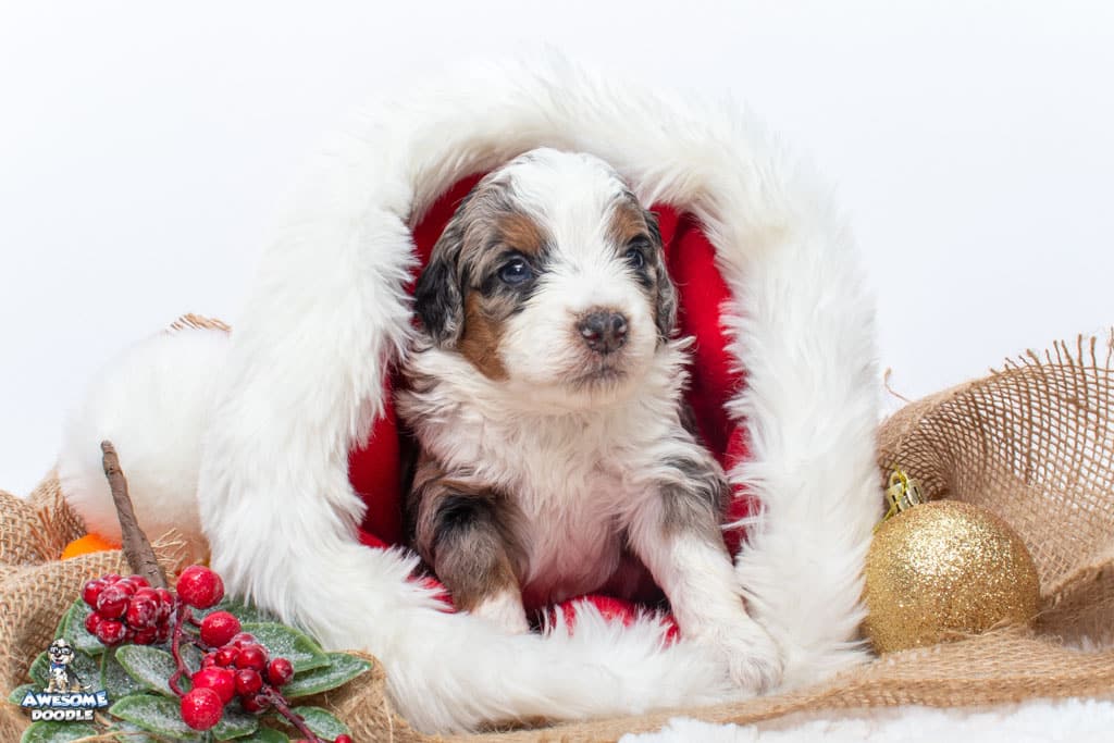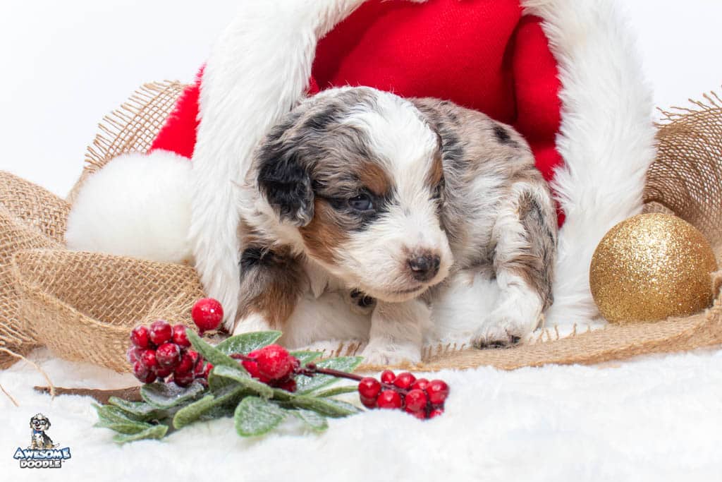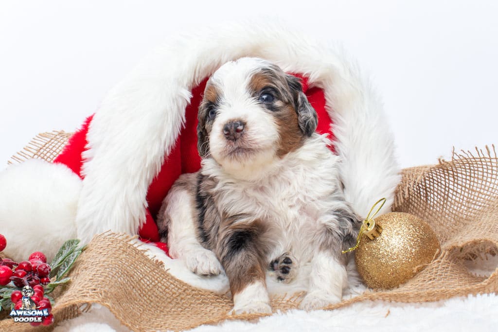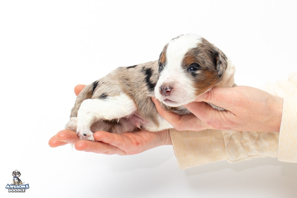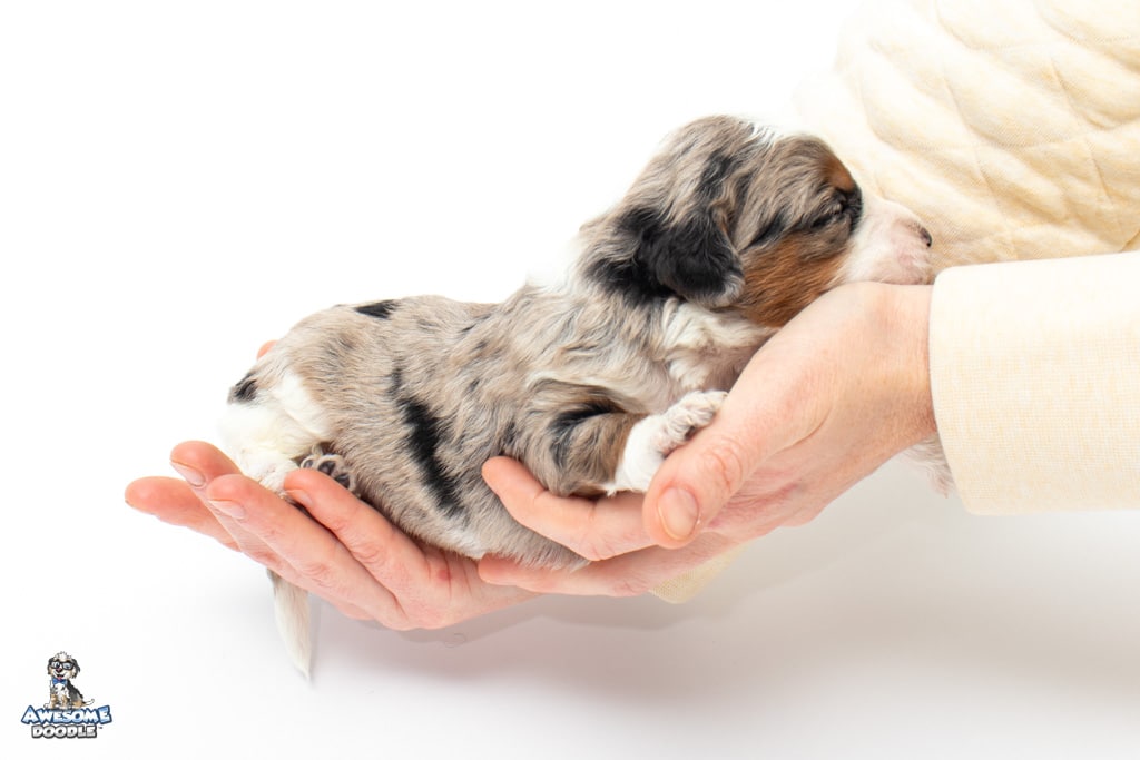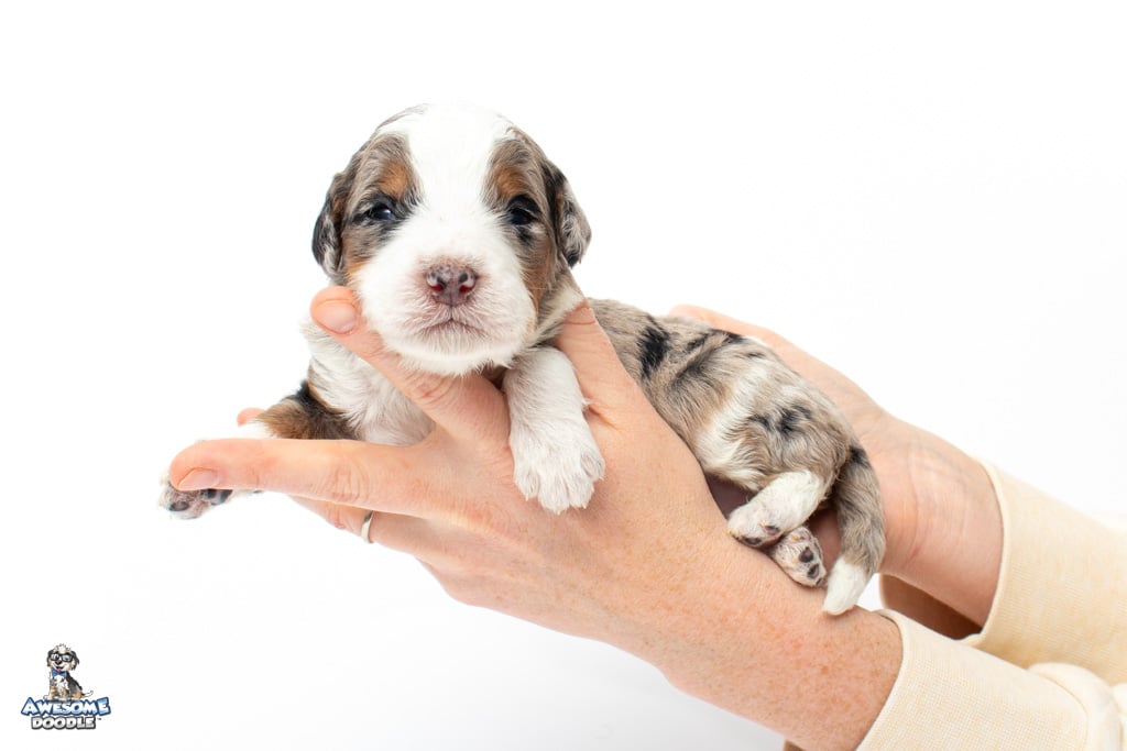 Zeke is a male Blue Merle w/ White & Copper F1 AussieDoodle puppy.