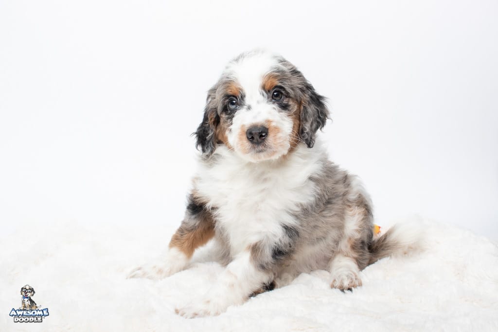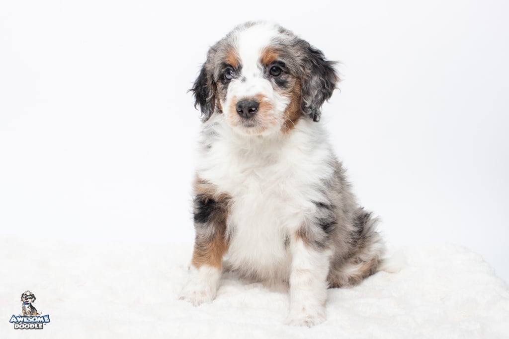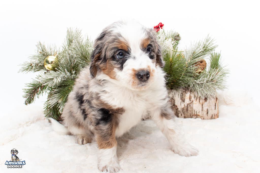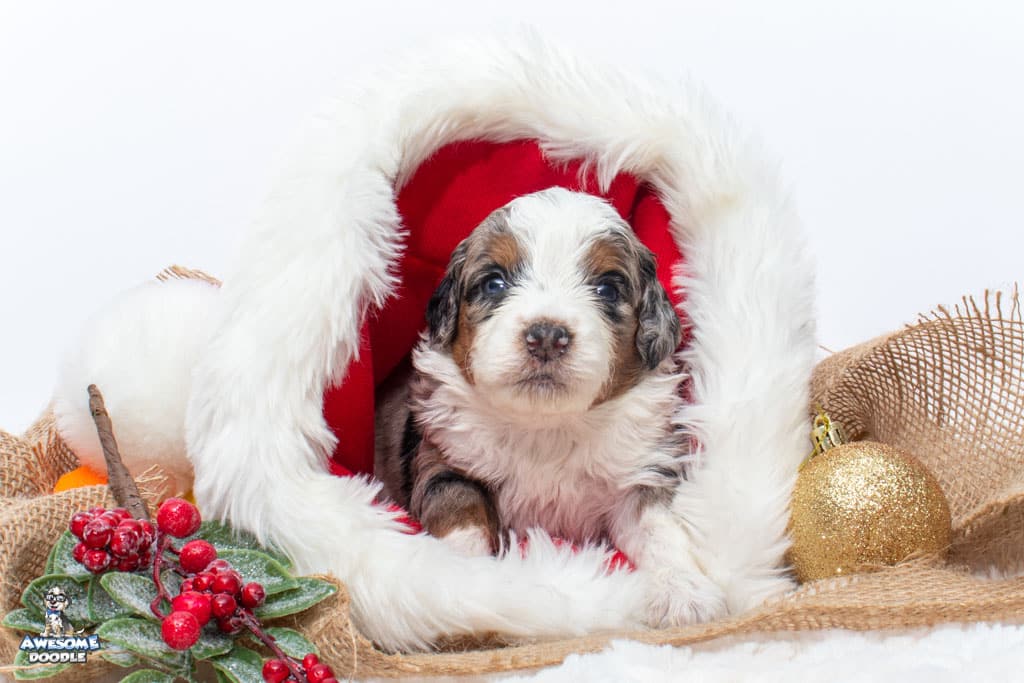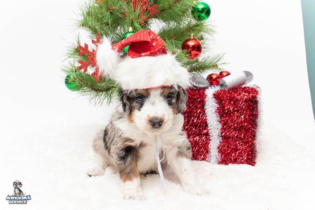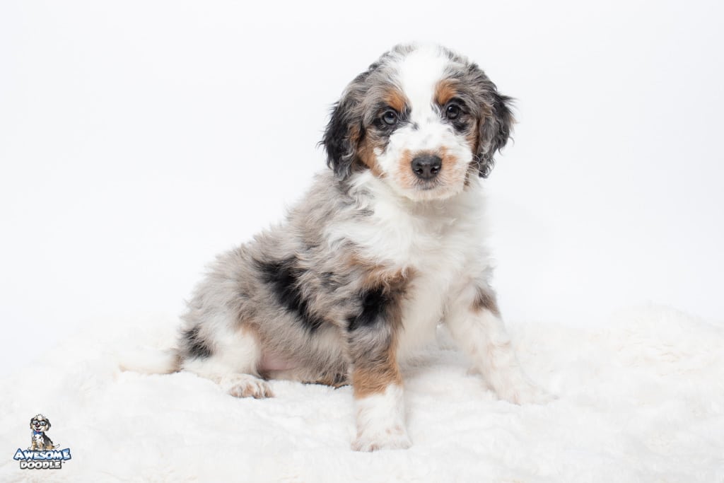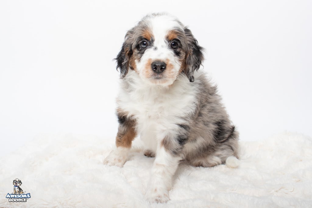 Zeke is a male Blue Merle w/ White & Copper F1 AussieDoodle puppy.